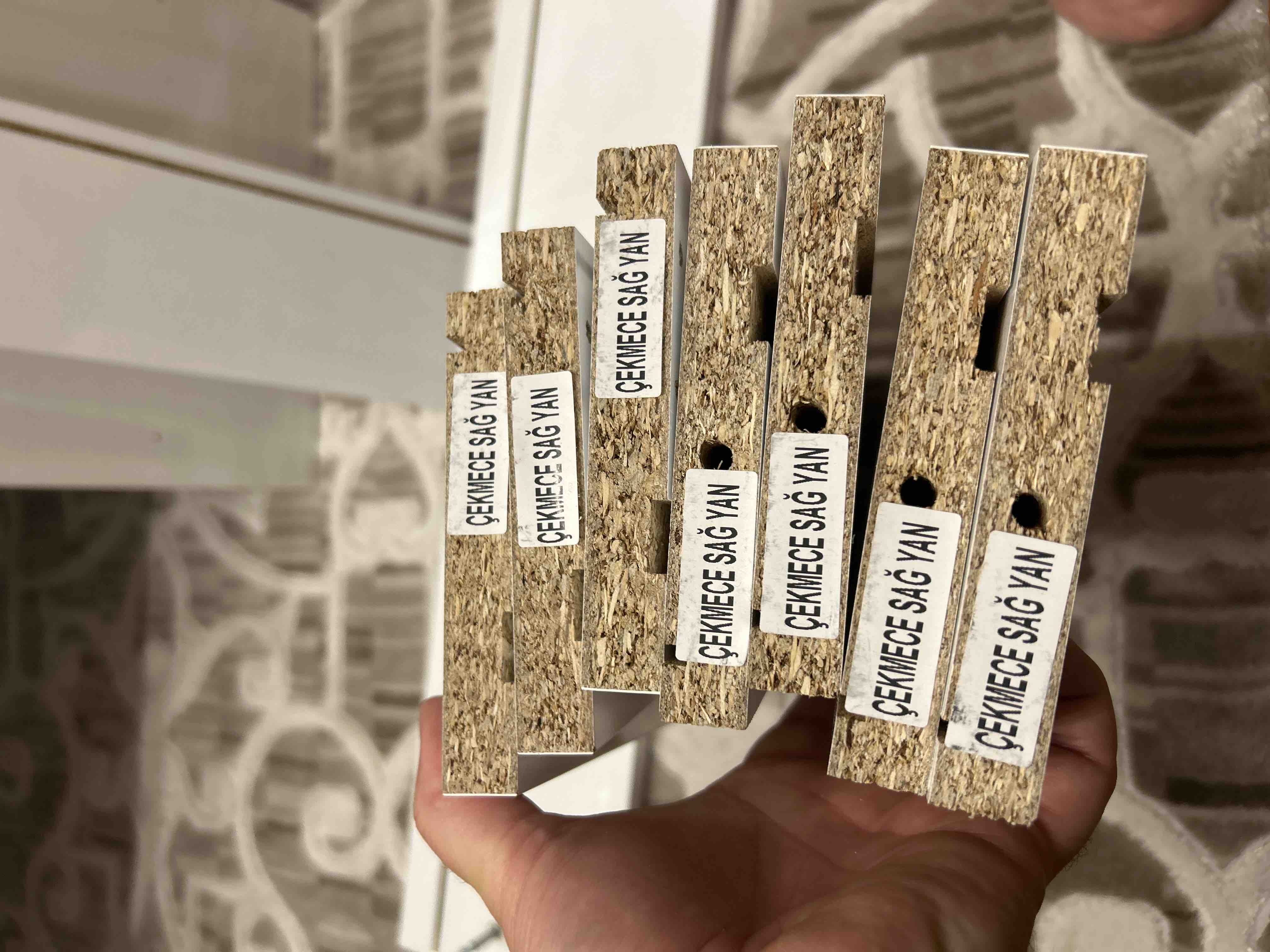 Ürünlerimiz 18 mm kalınlığında halk arasında Suntalam-Suntalem olarak bilinen, sağlığa zararsız, kanserojen madde içermeyen Avrupa E1 kalite standartlarında uygun, yonga levhalardan üretilmektedir.