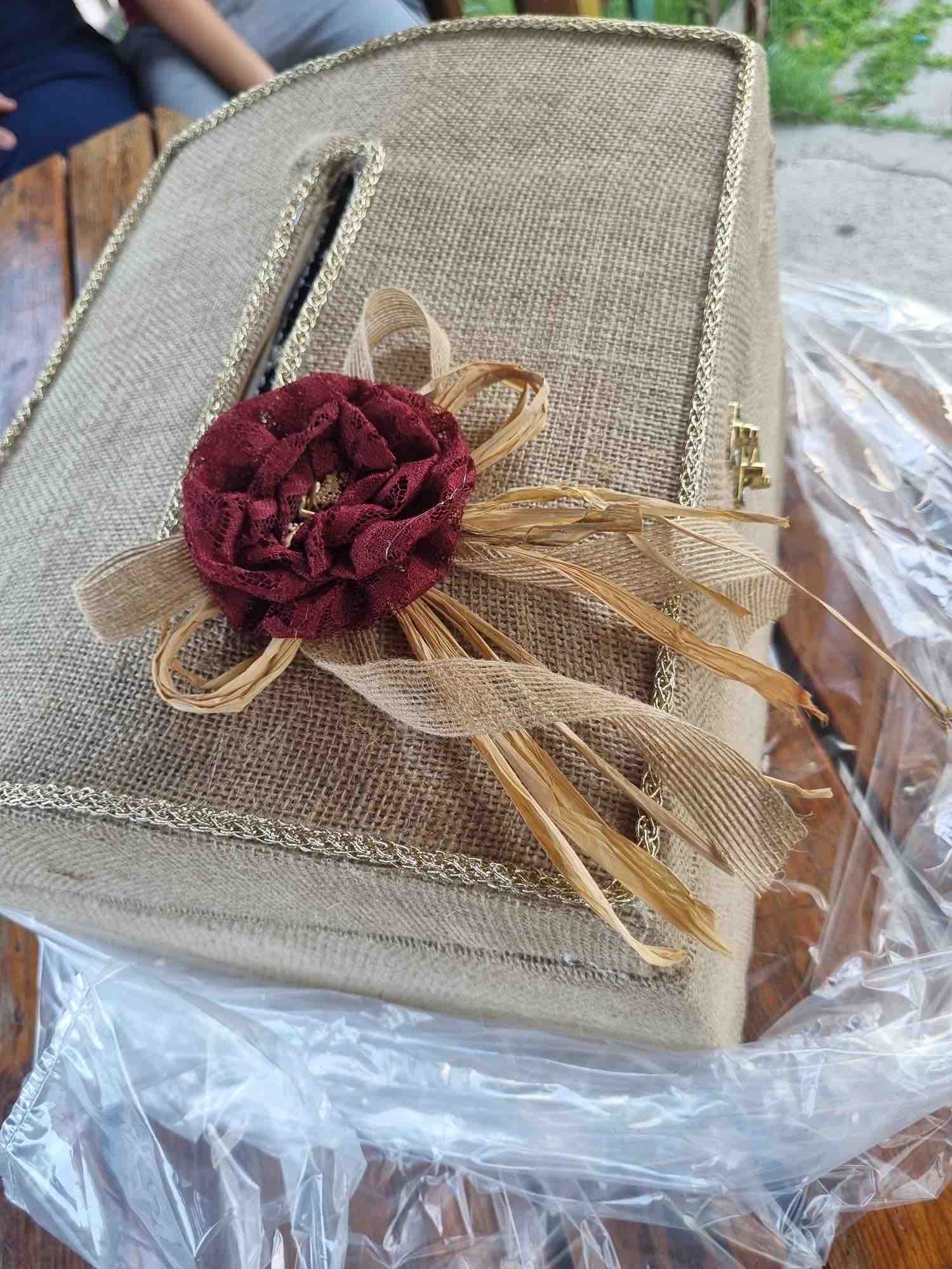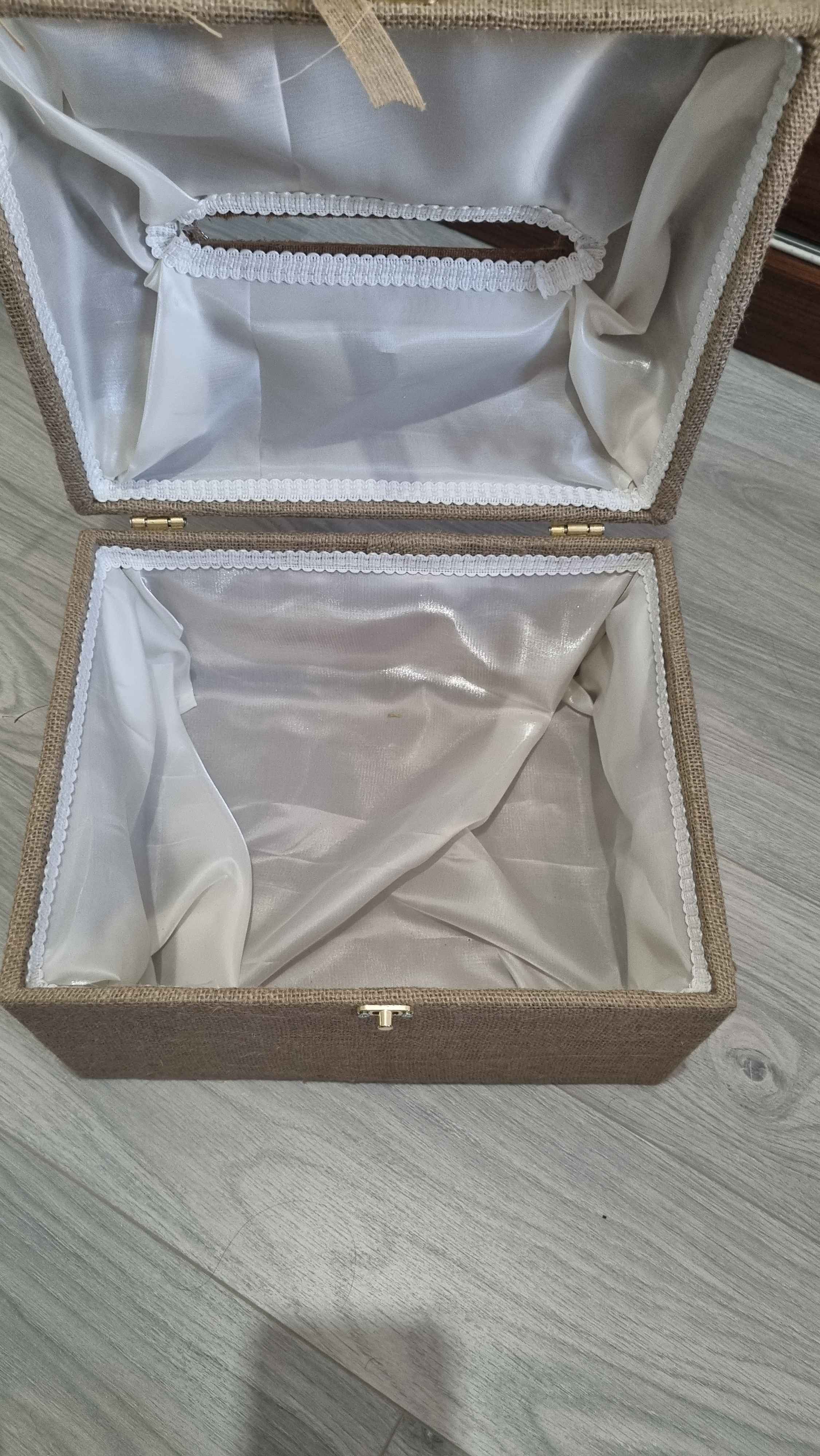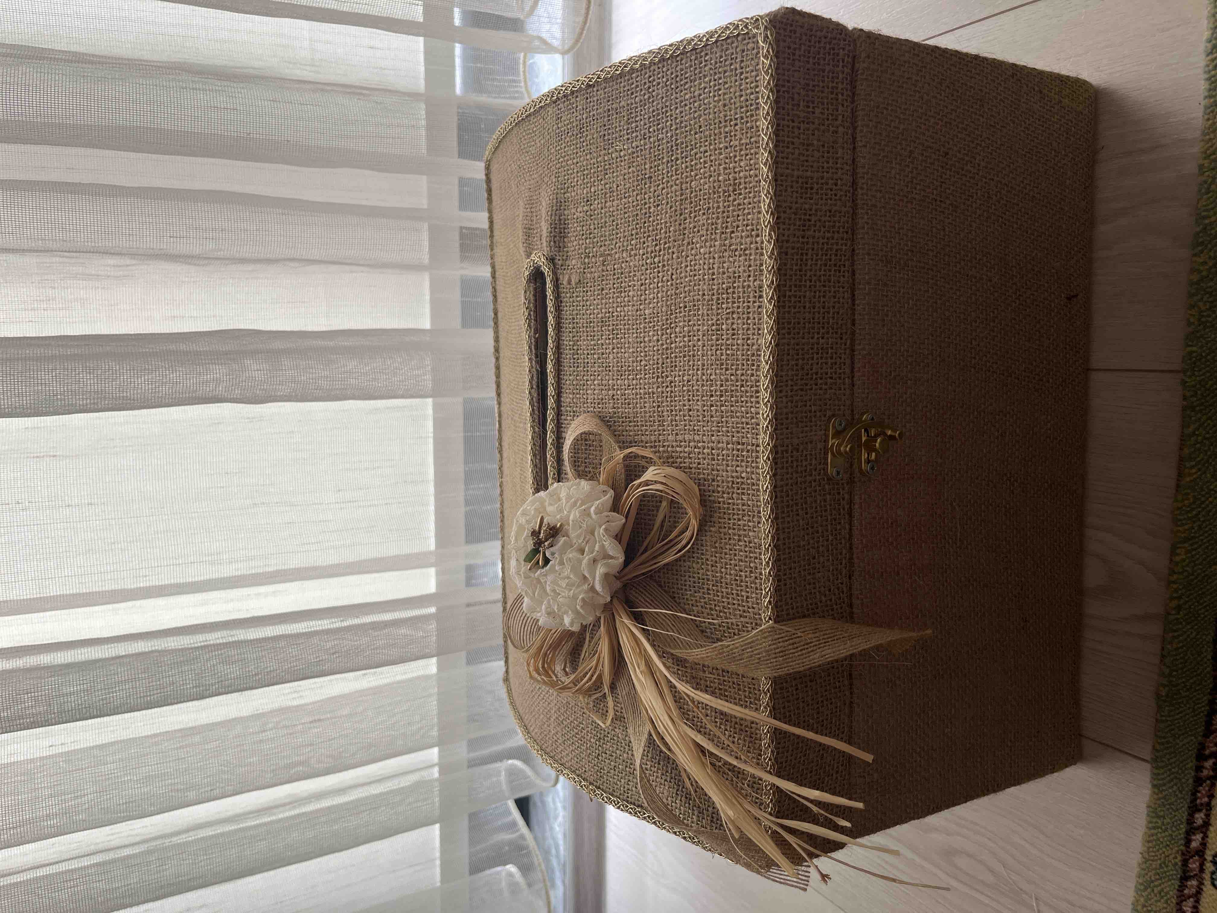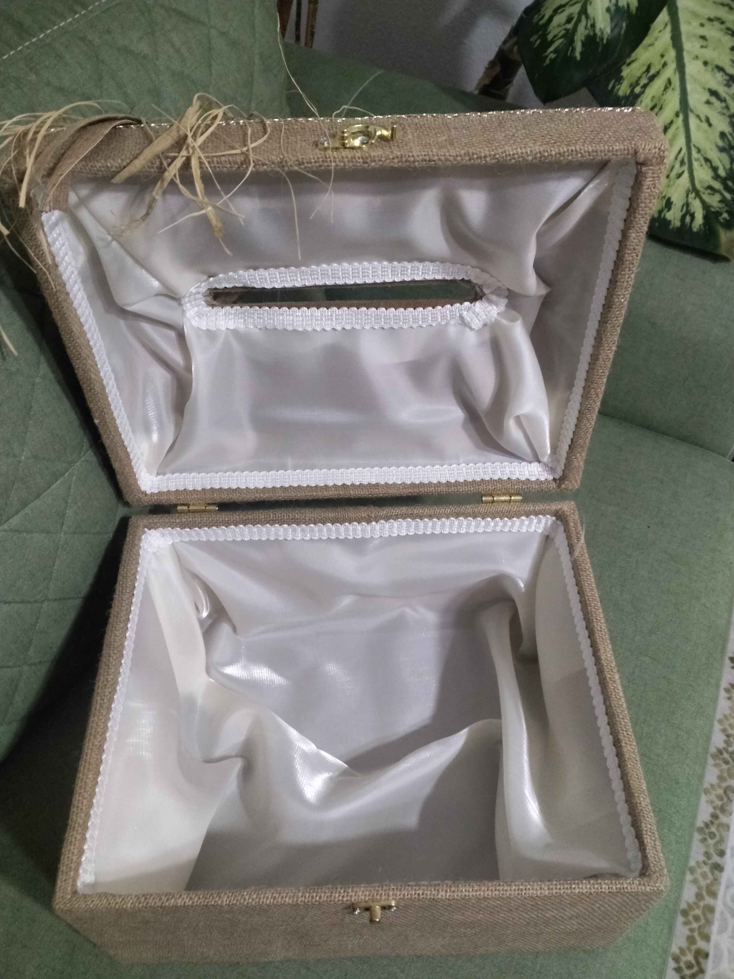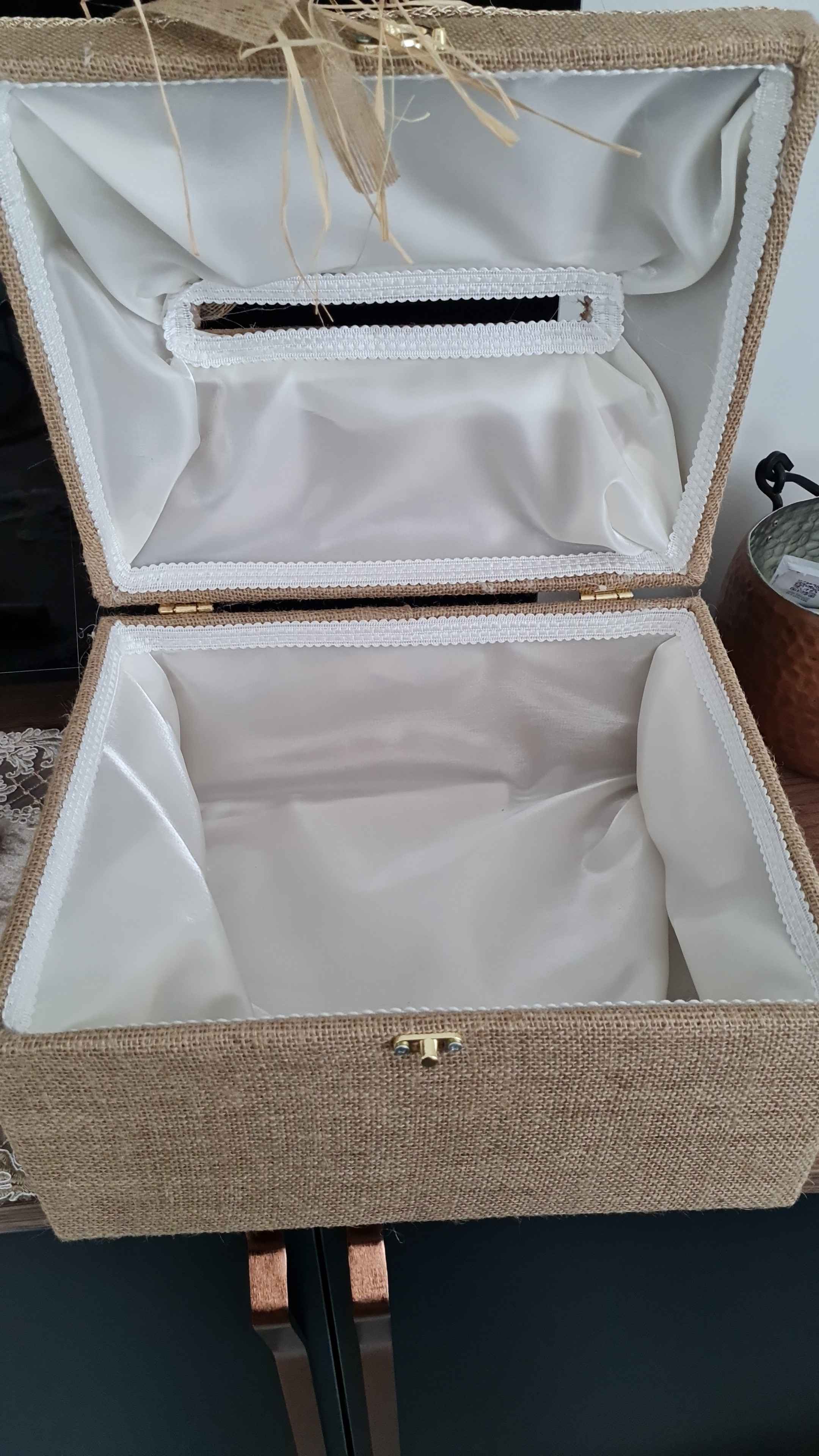 Zarf takı sandığı dışı dayanıklı hasır kumaş içi saten kumaş ile kaplanmıştır.