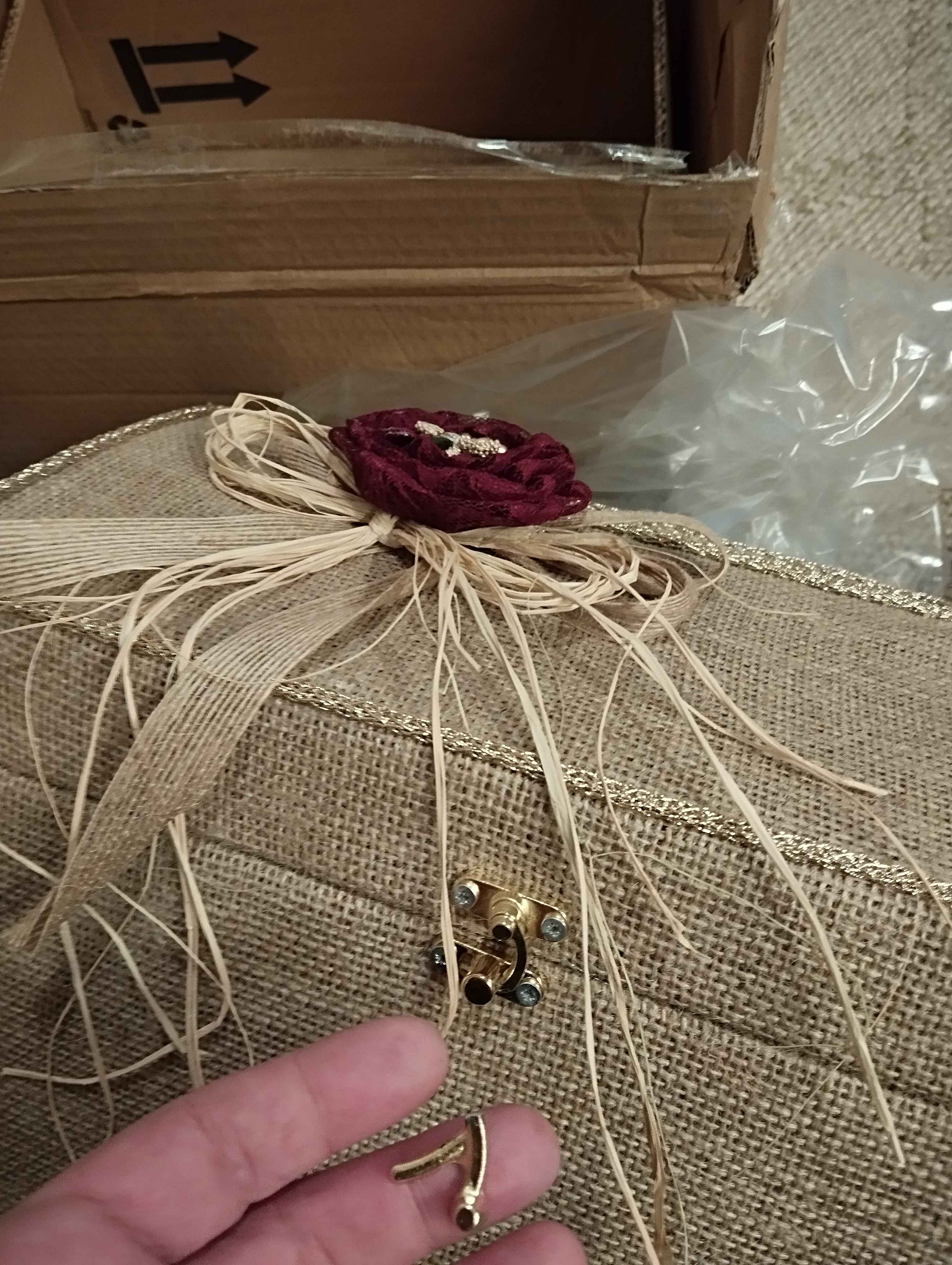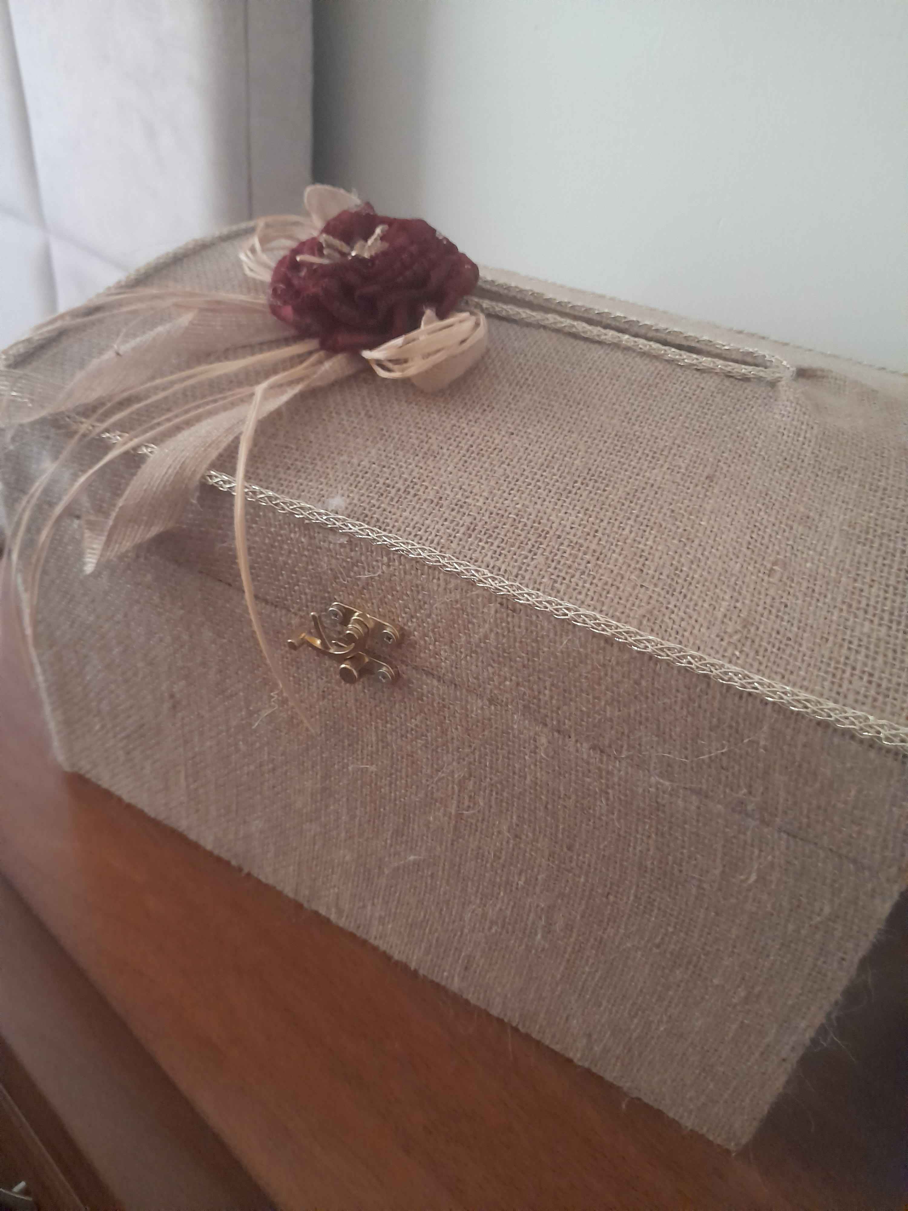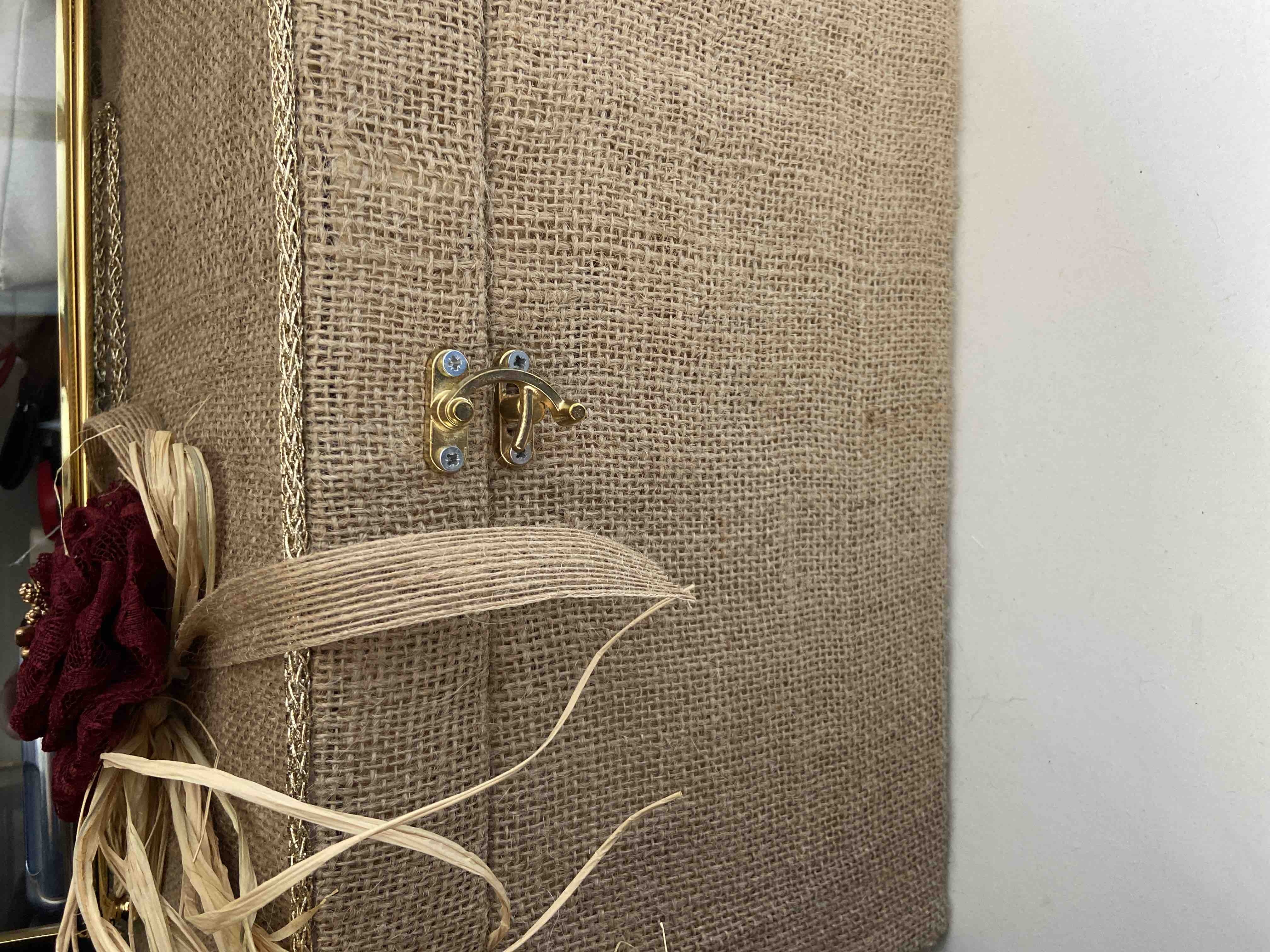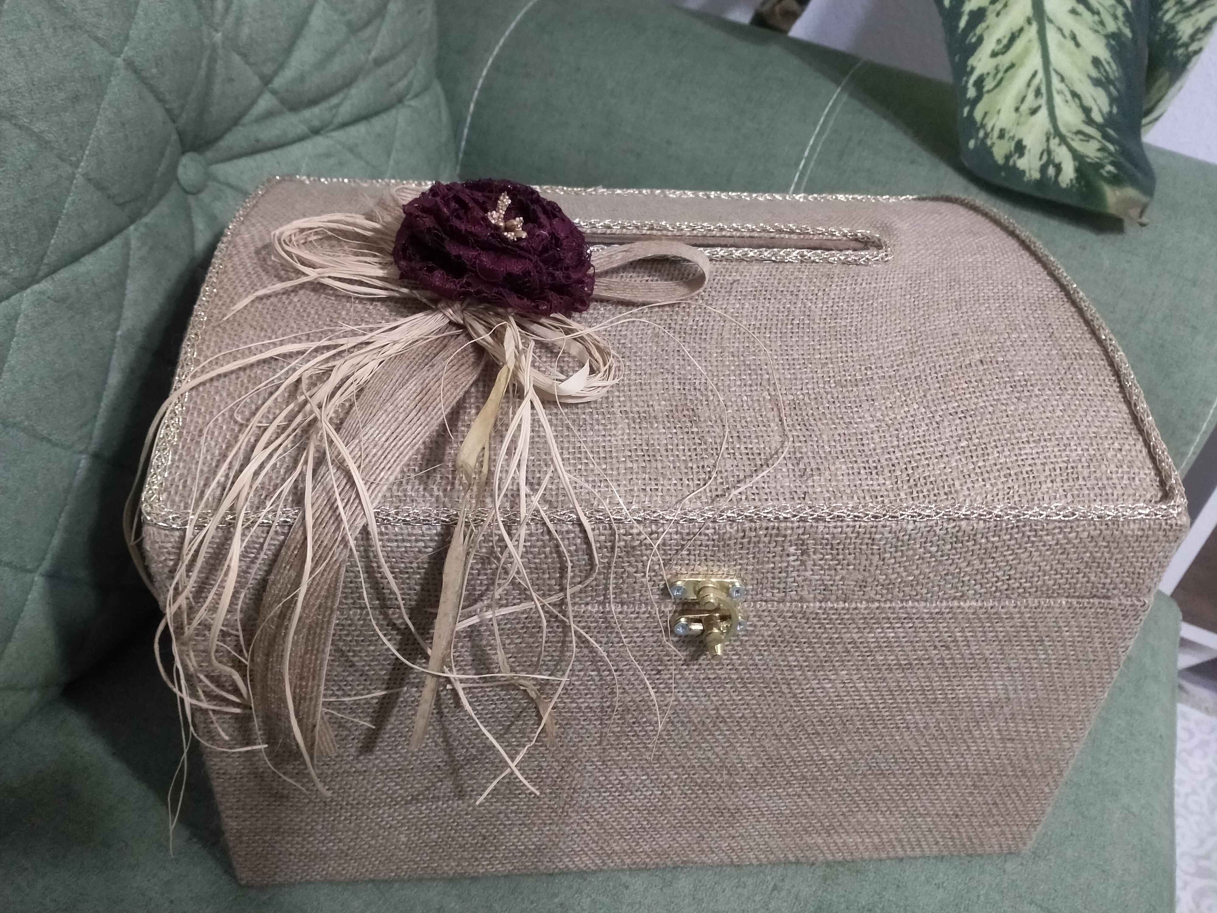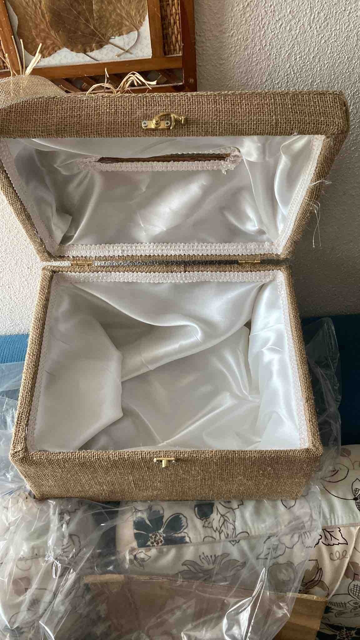 Zarf takı sandığı dışı dayanıklı hasır kumaş içi saten kumaş ile kaplanmıştır.