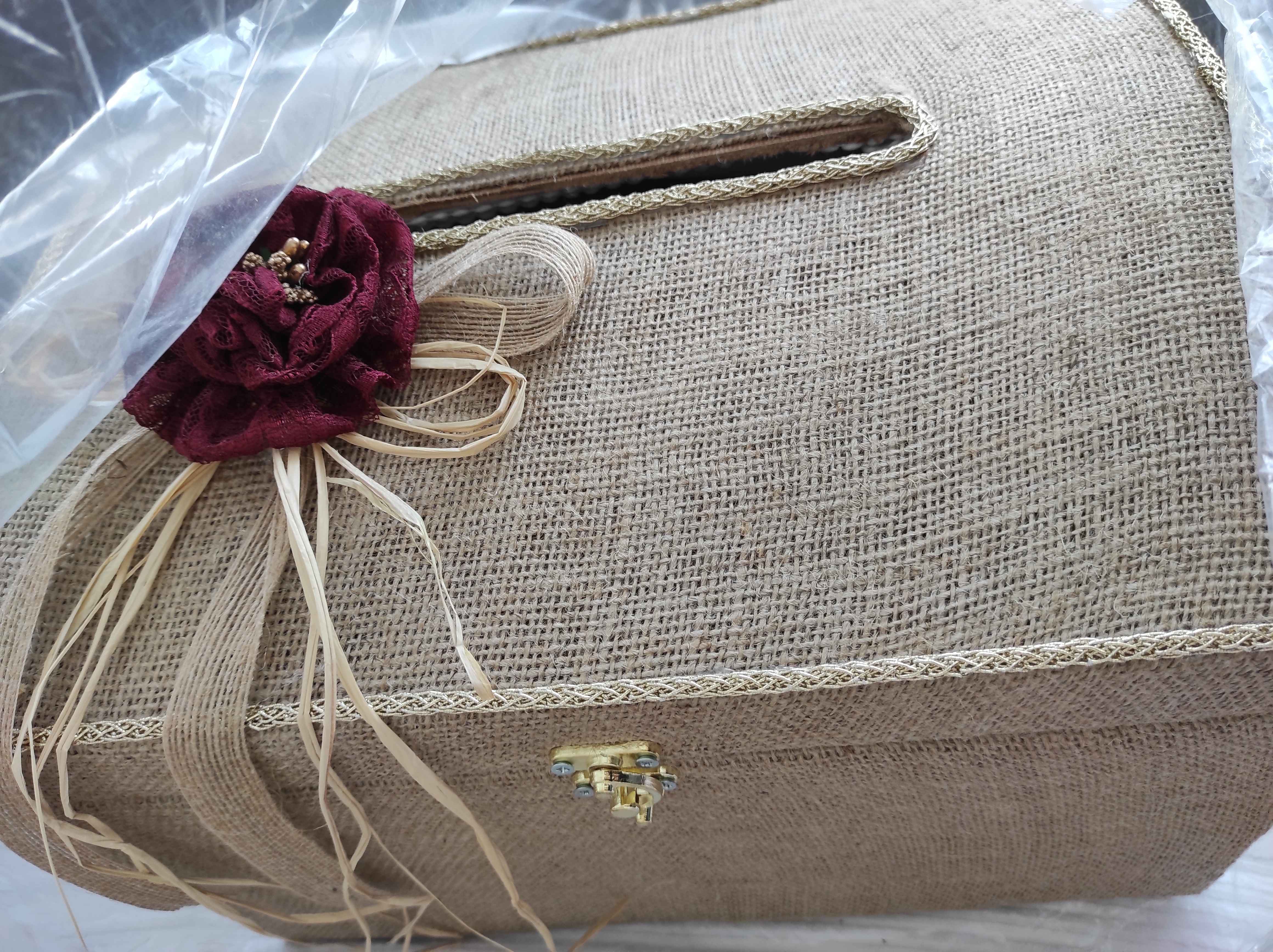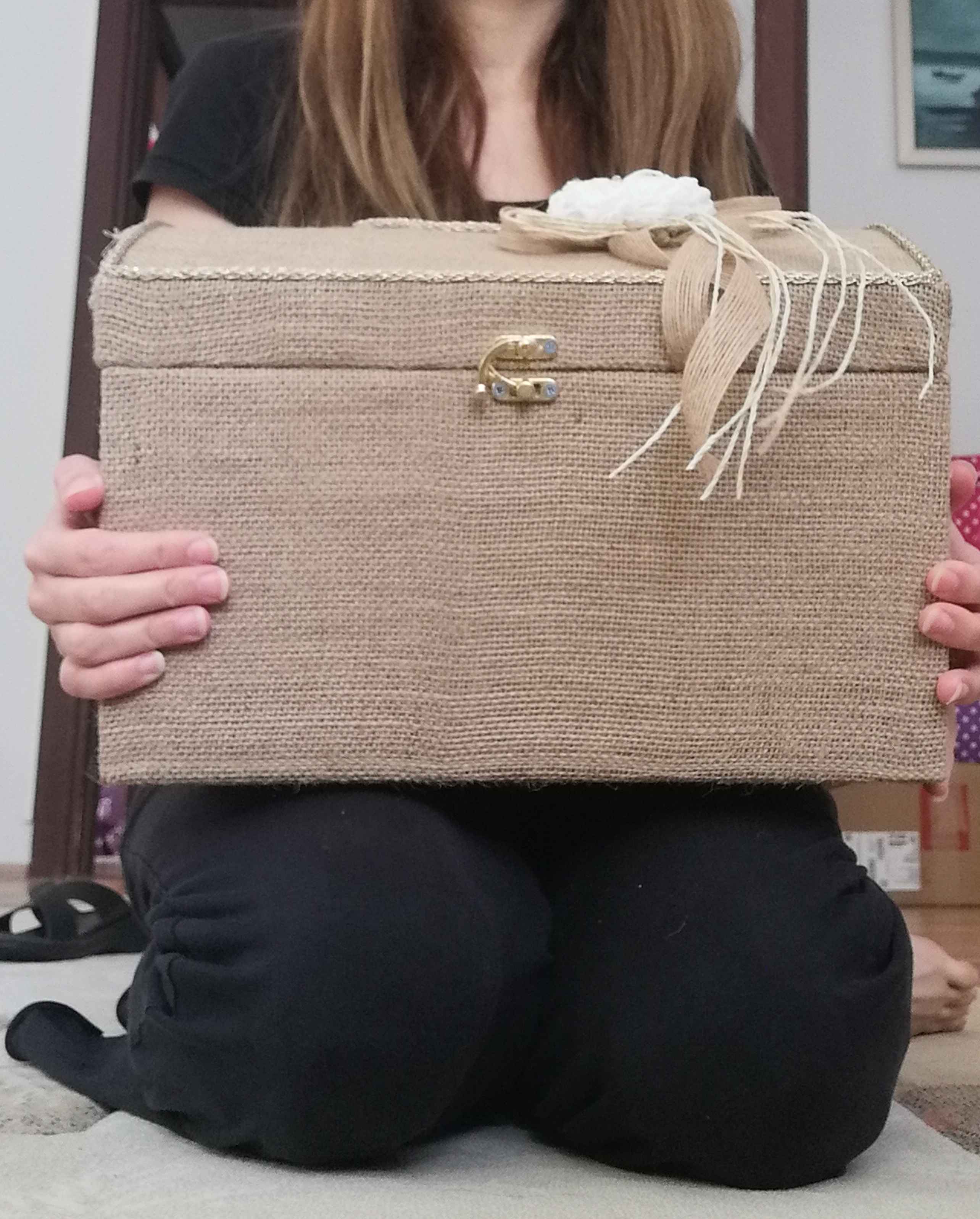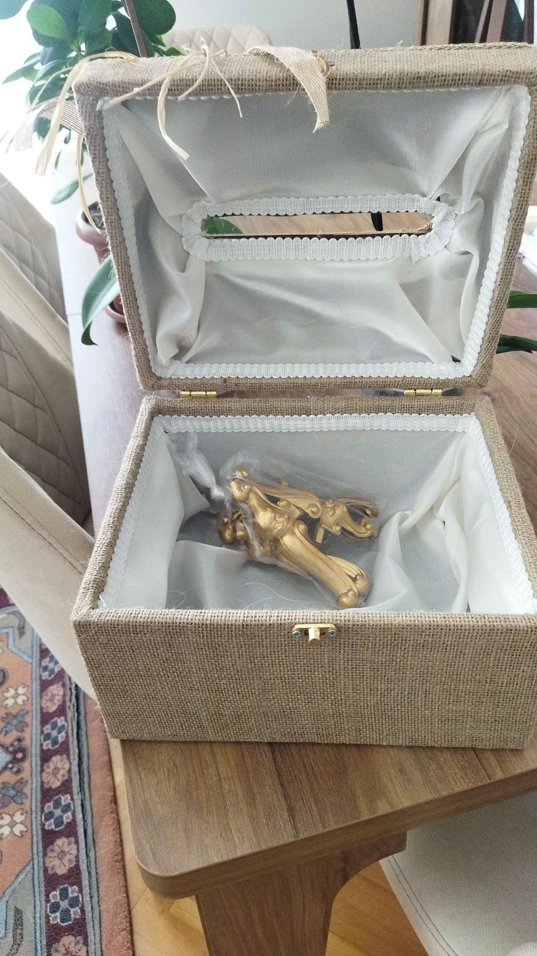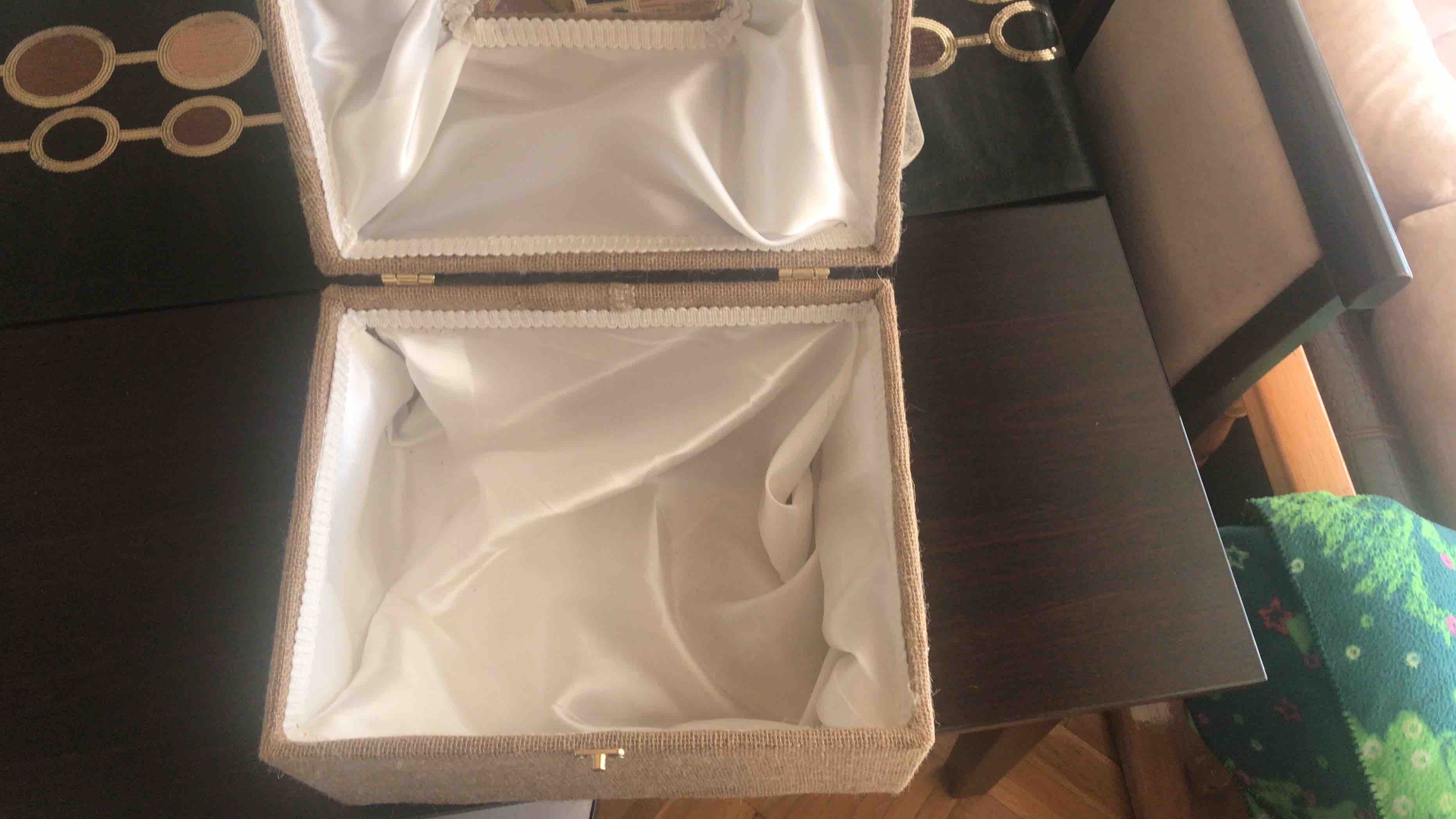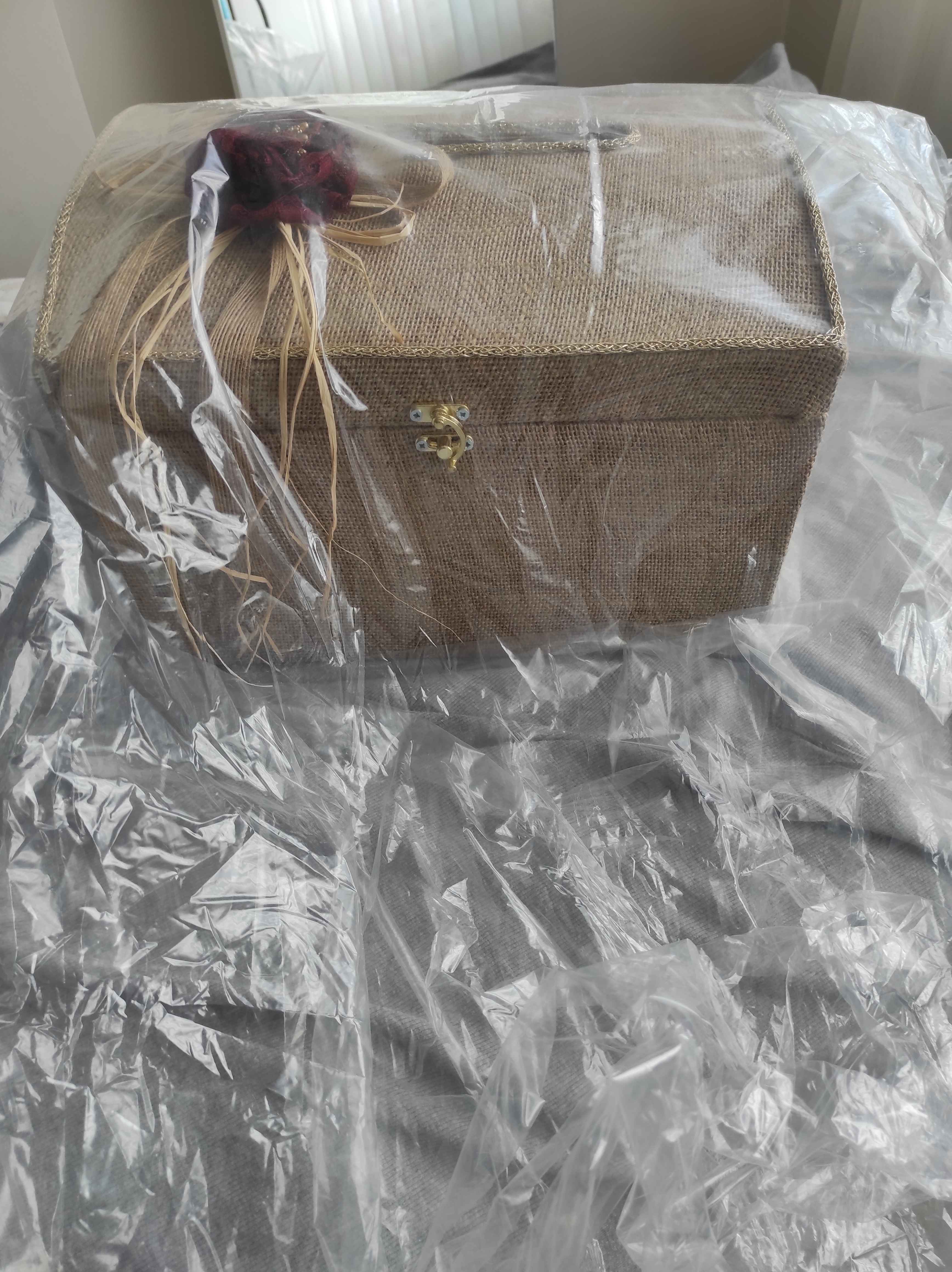 Zarf takı sandığı dışı dayanıklı hasır kumaş içi saten kumaş ile kaplanmıştır.