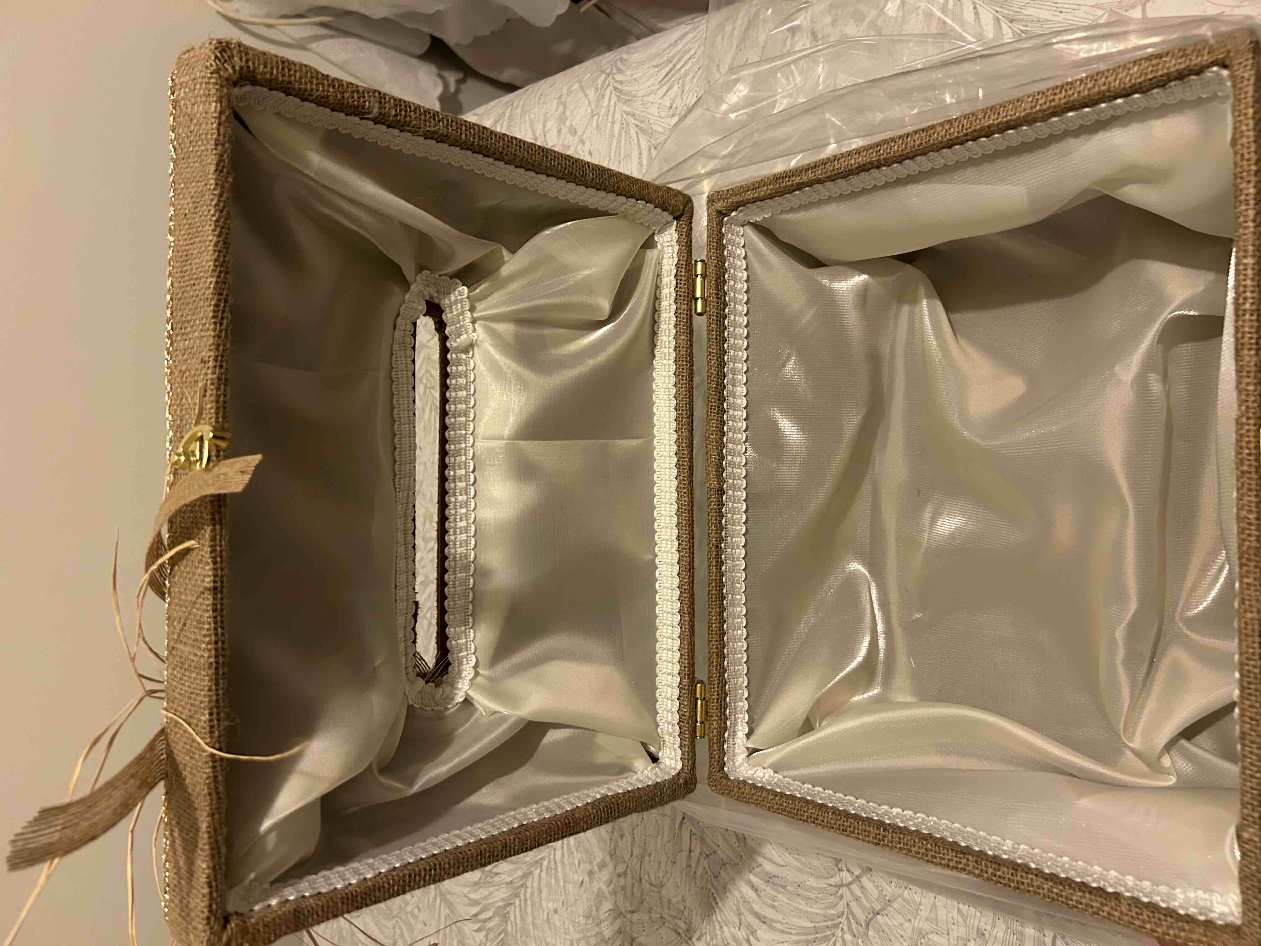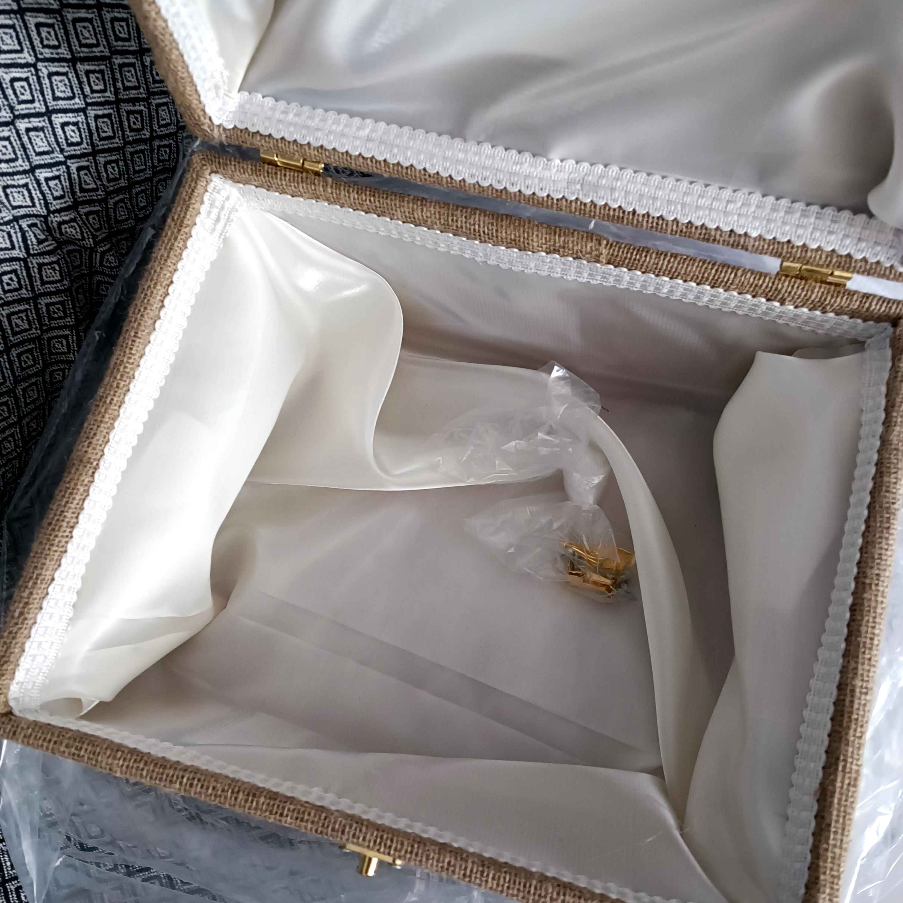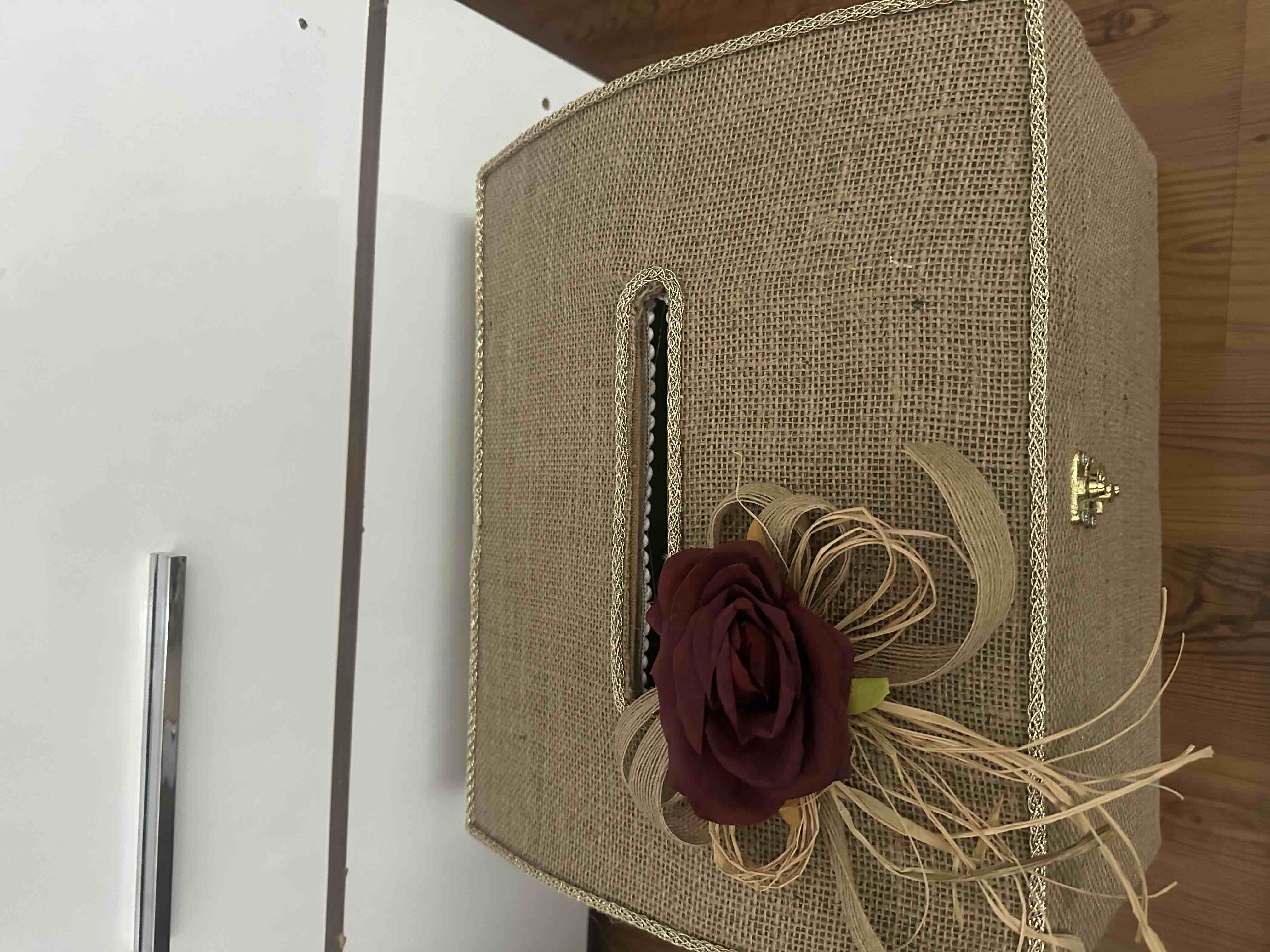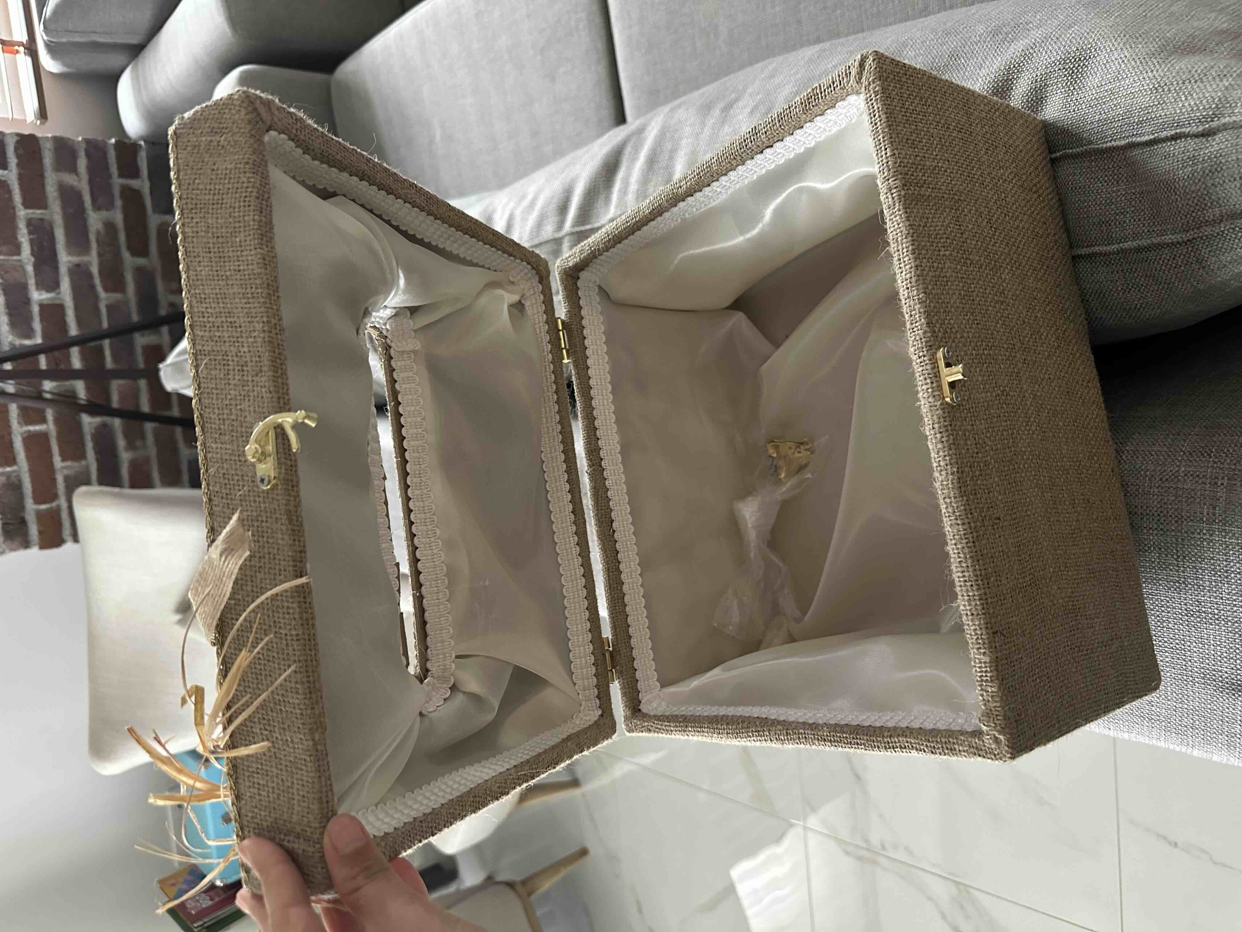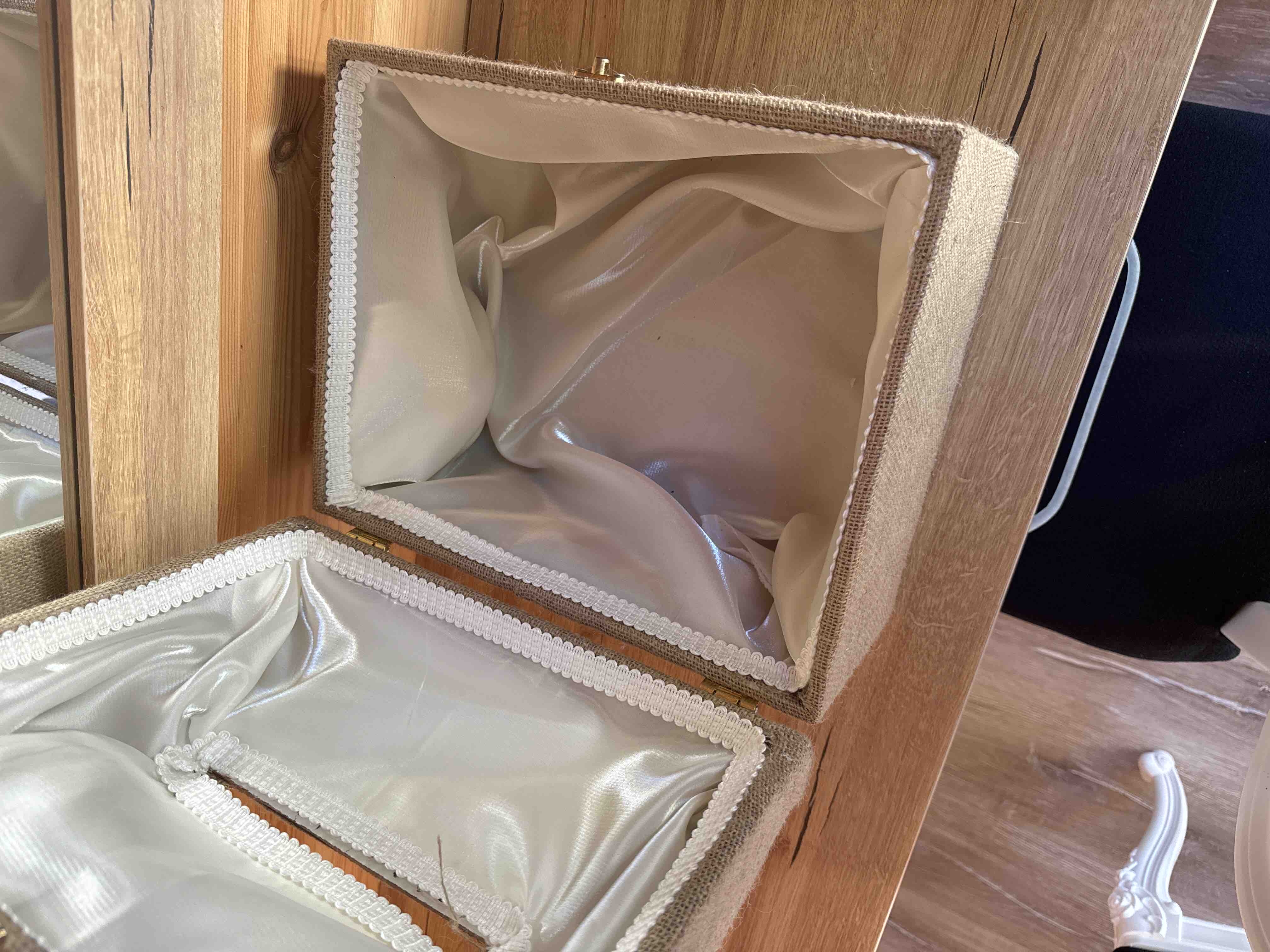Zarf takı sandığı dışı dayanıklı hasır kumaş içi saten kumaş ile kaplanmıştır.