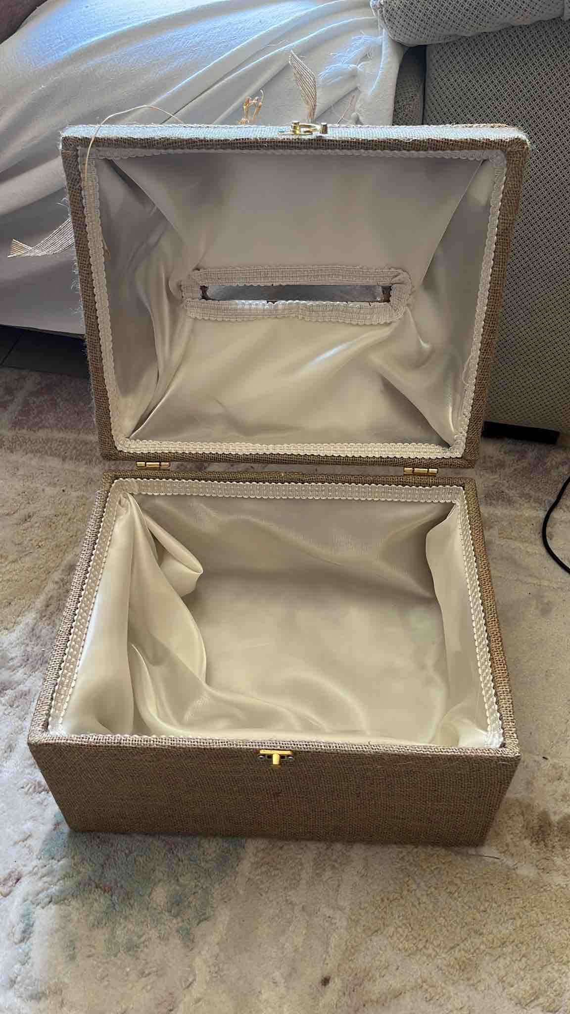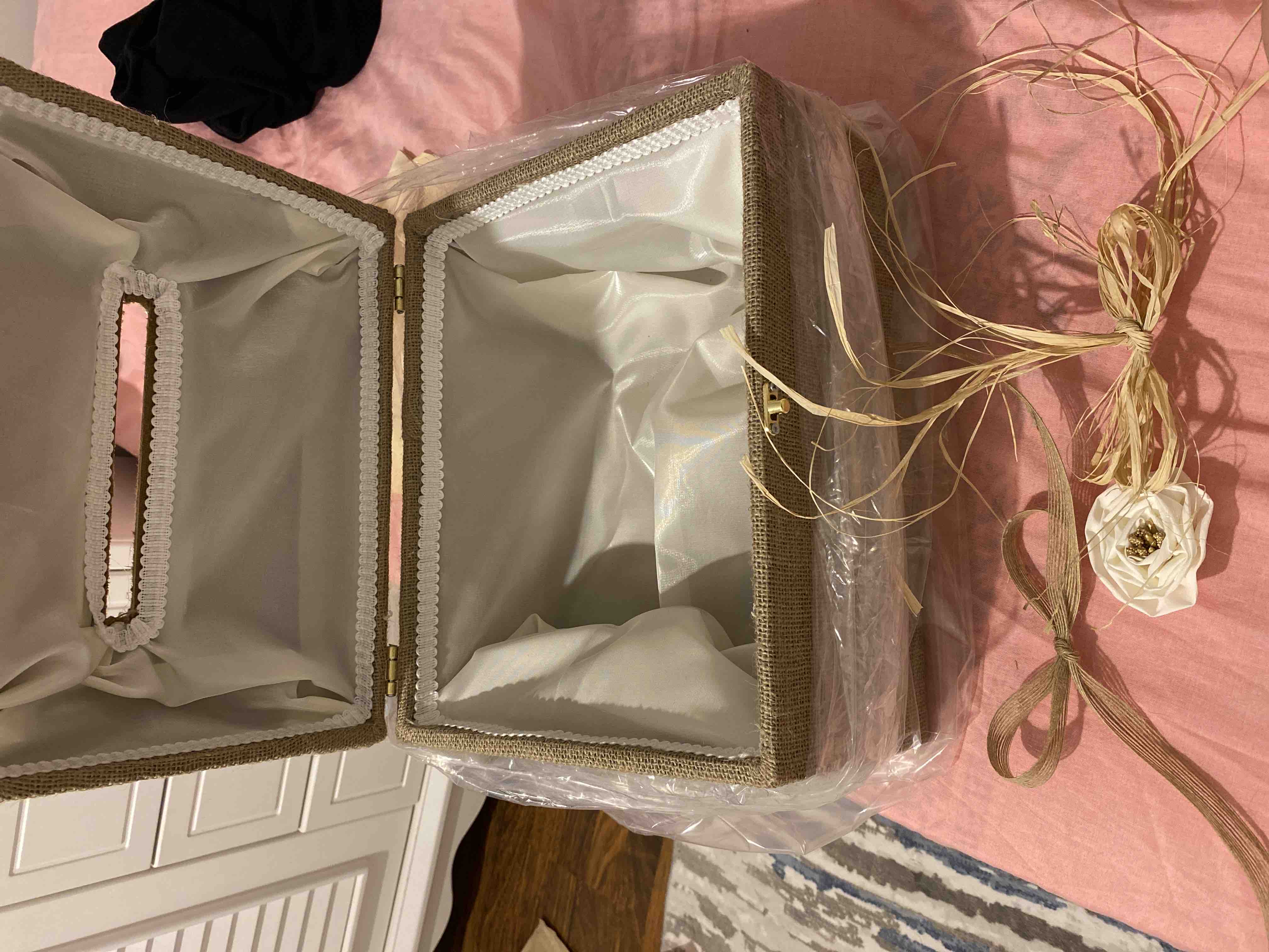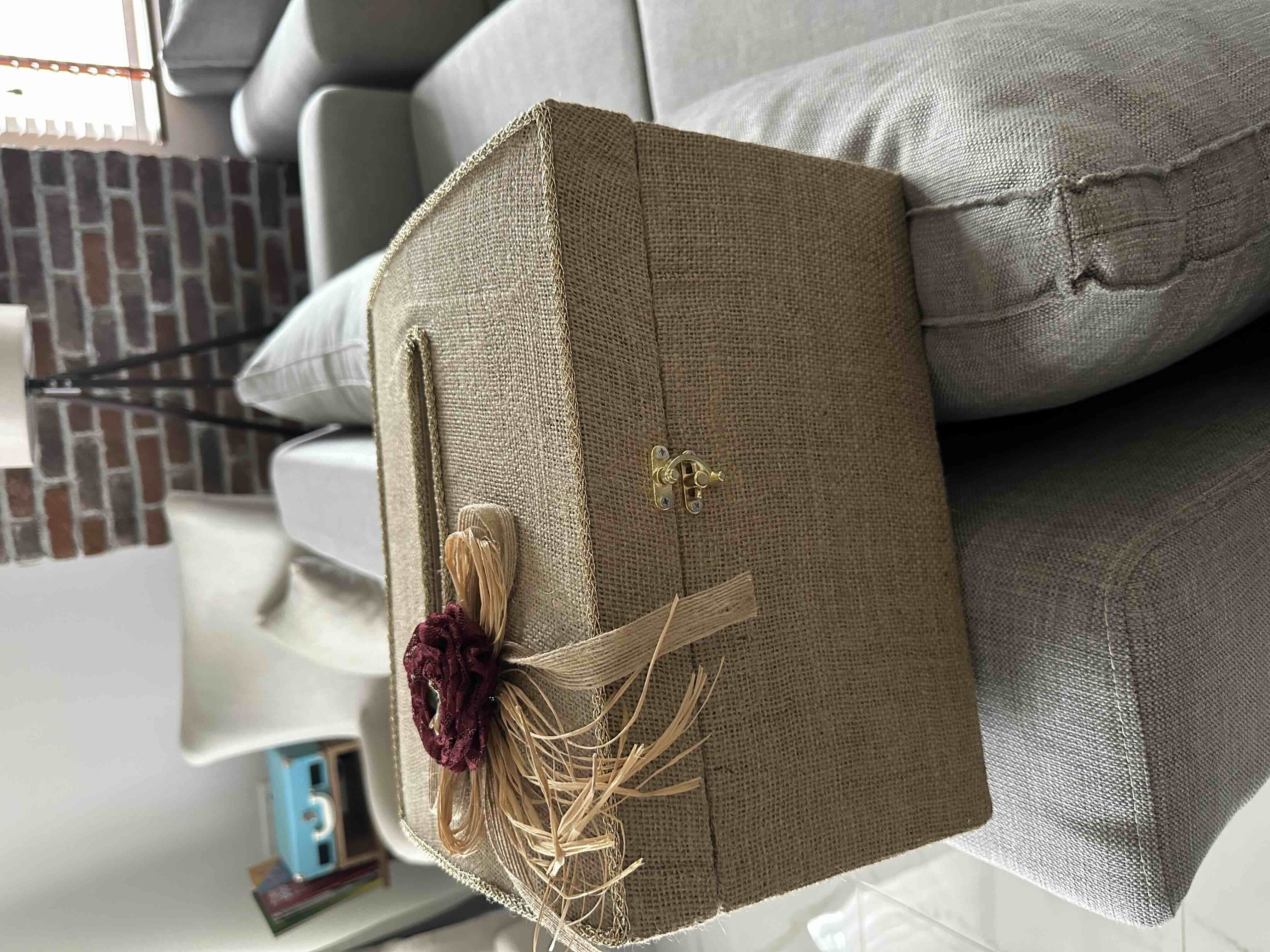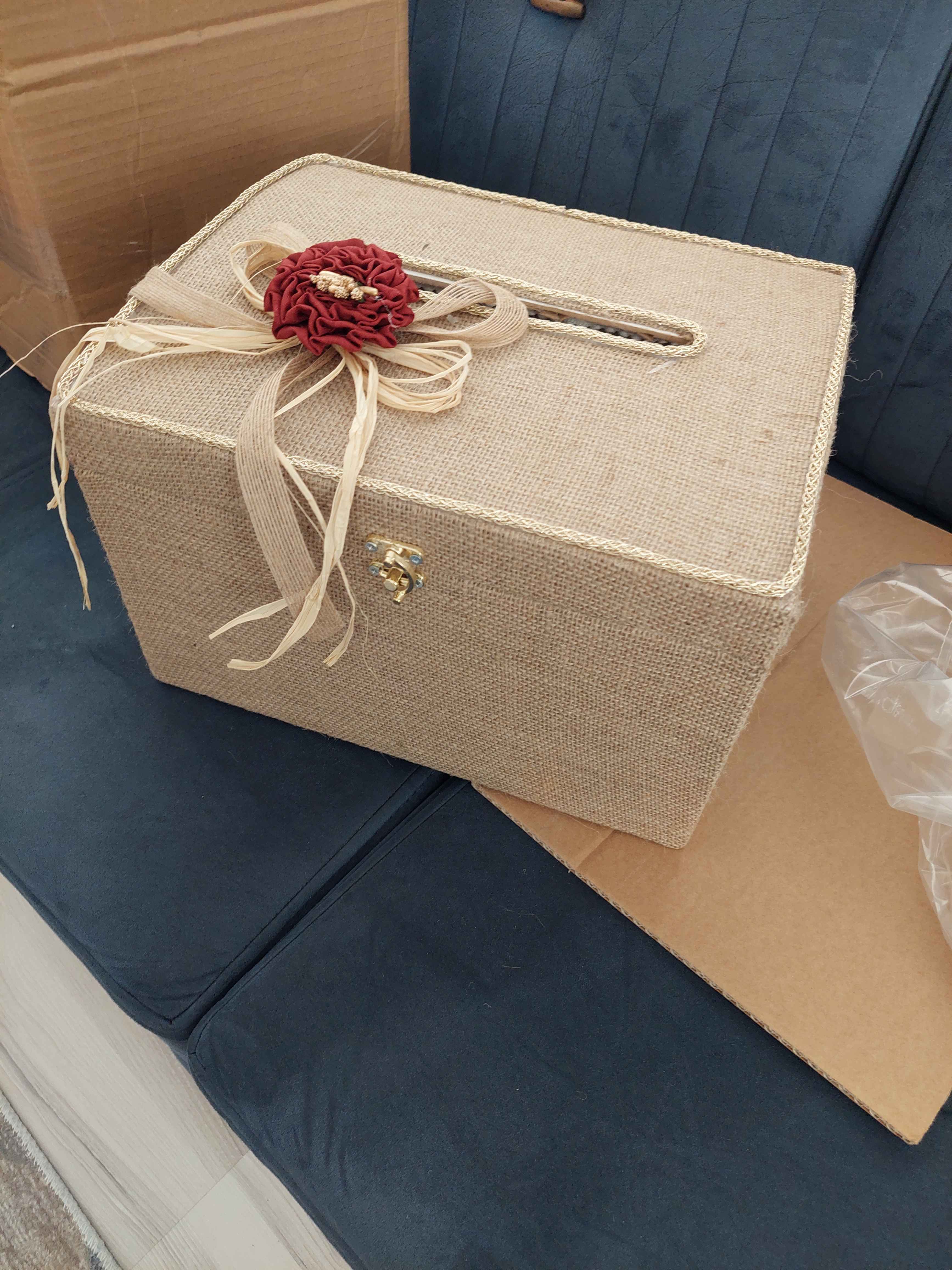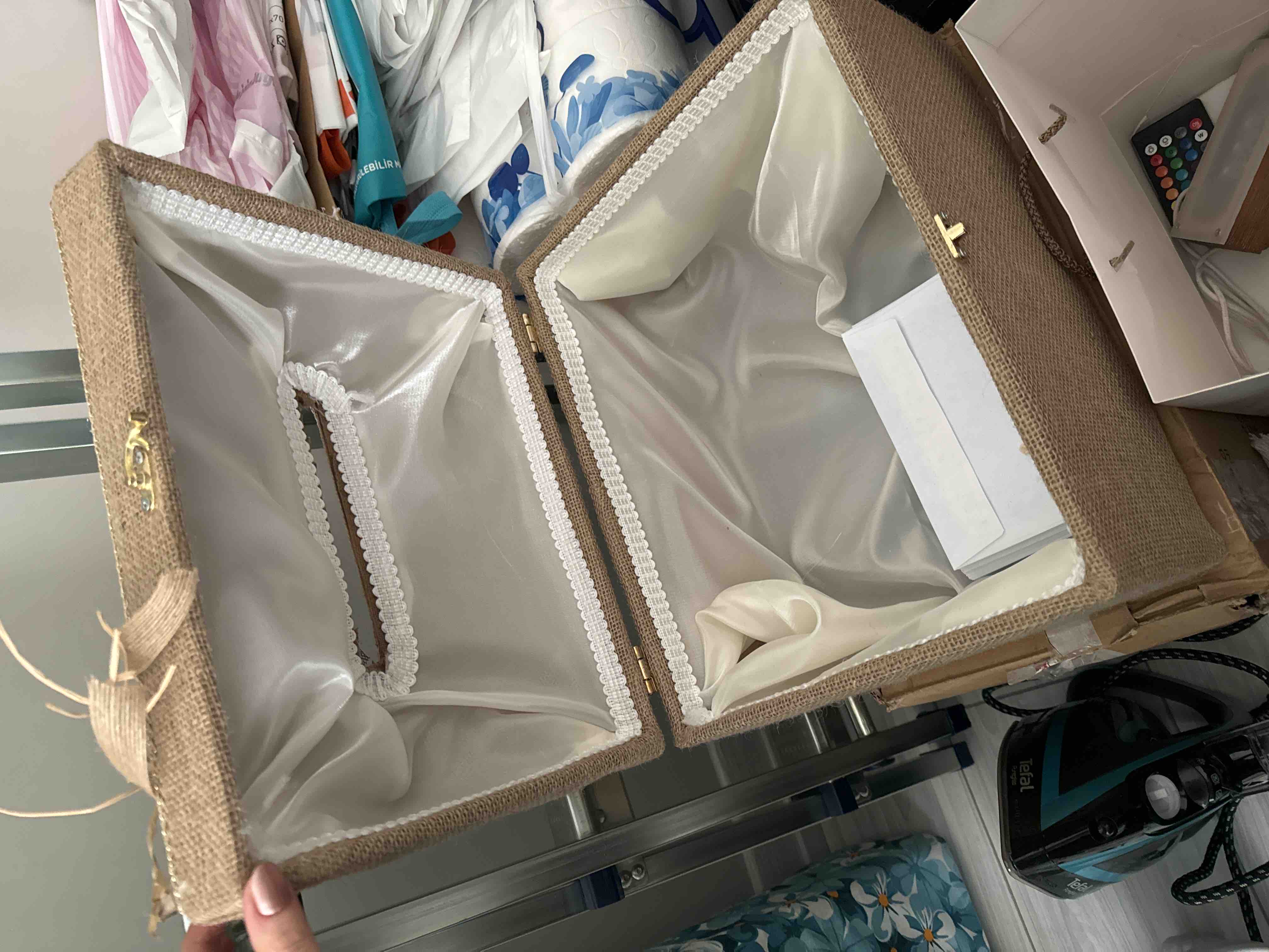 Zarf takı sandığı dışı dayanıklı hasır kumaş içi saten kumaş ile kaplanmıştır.