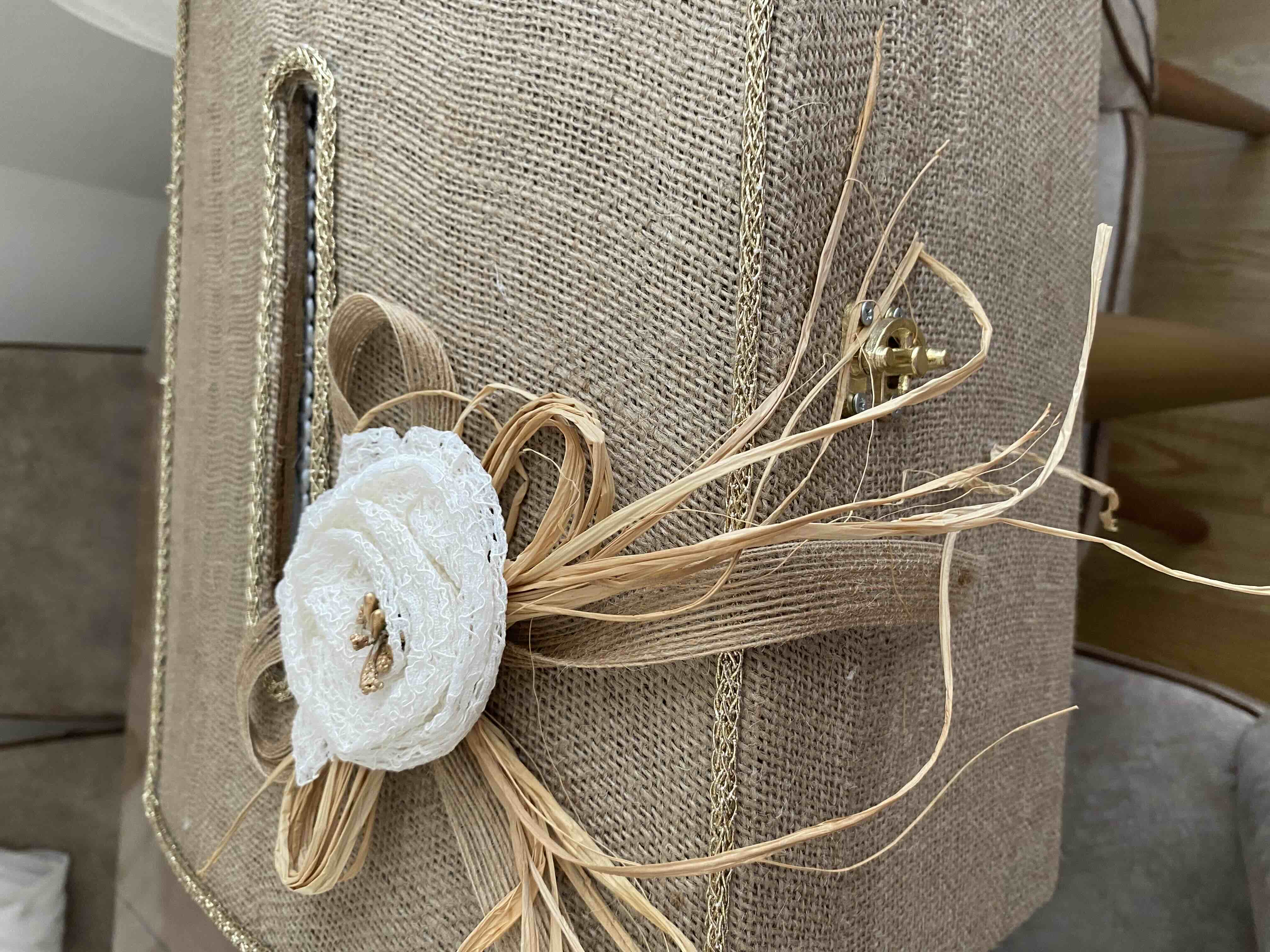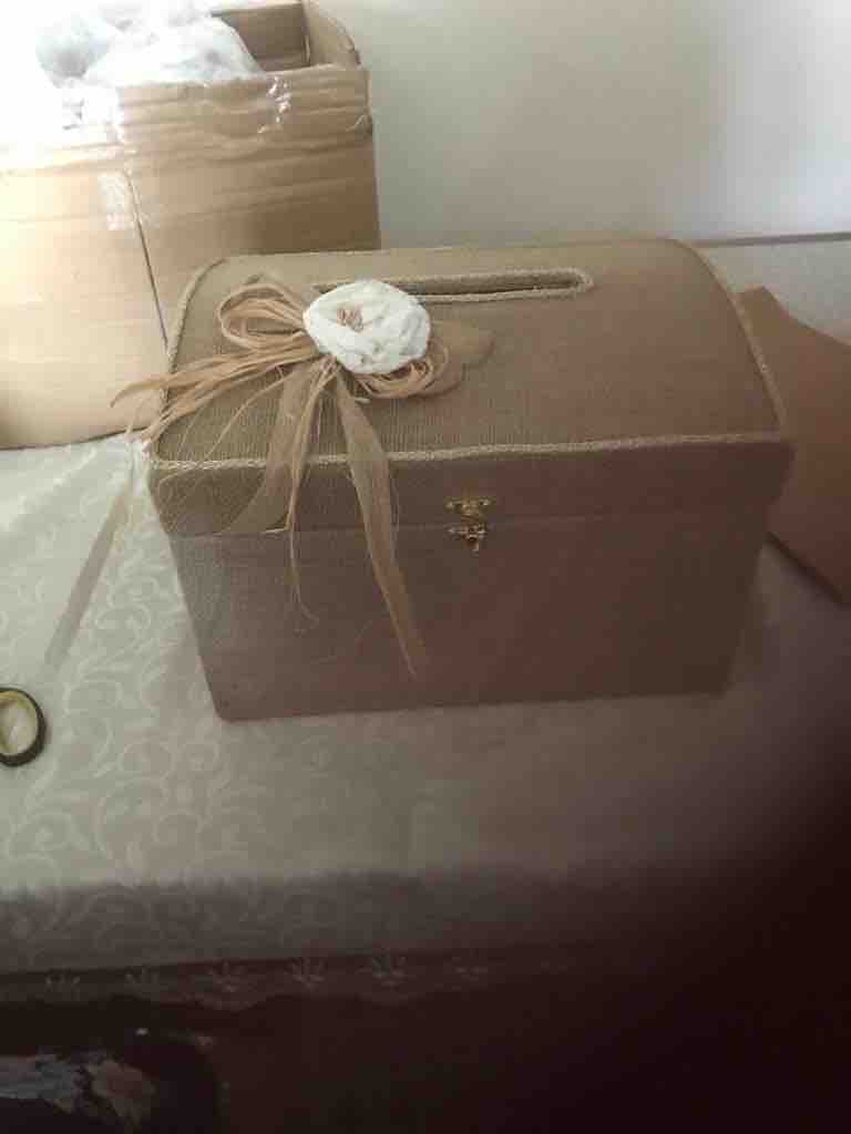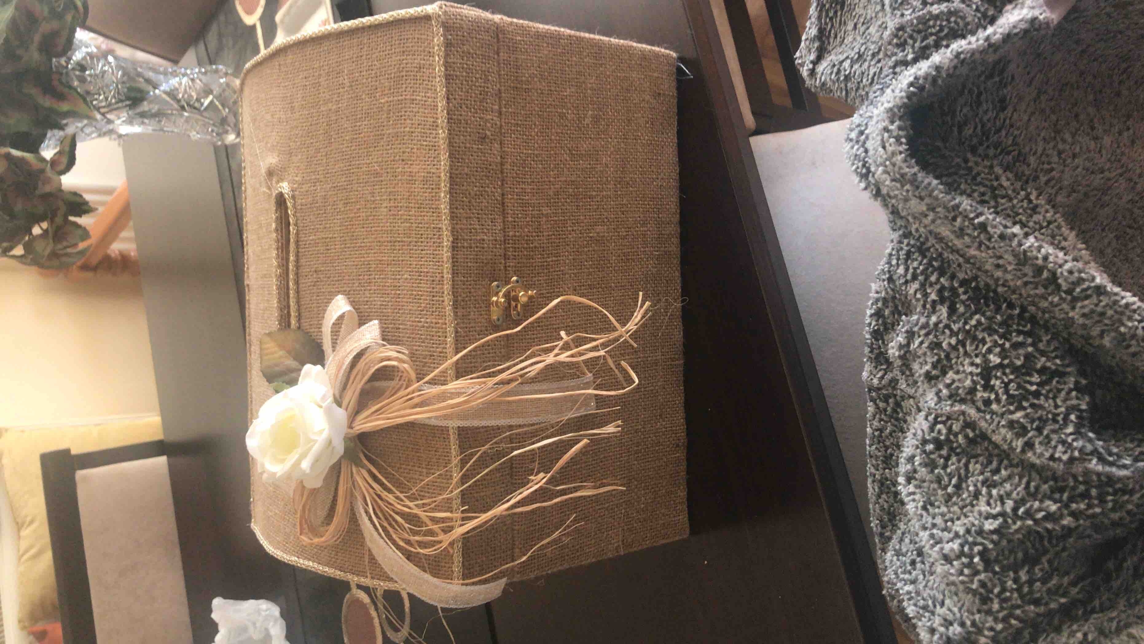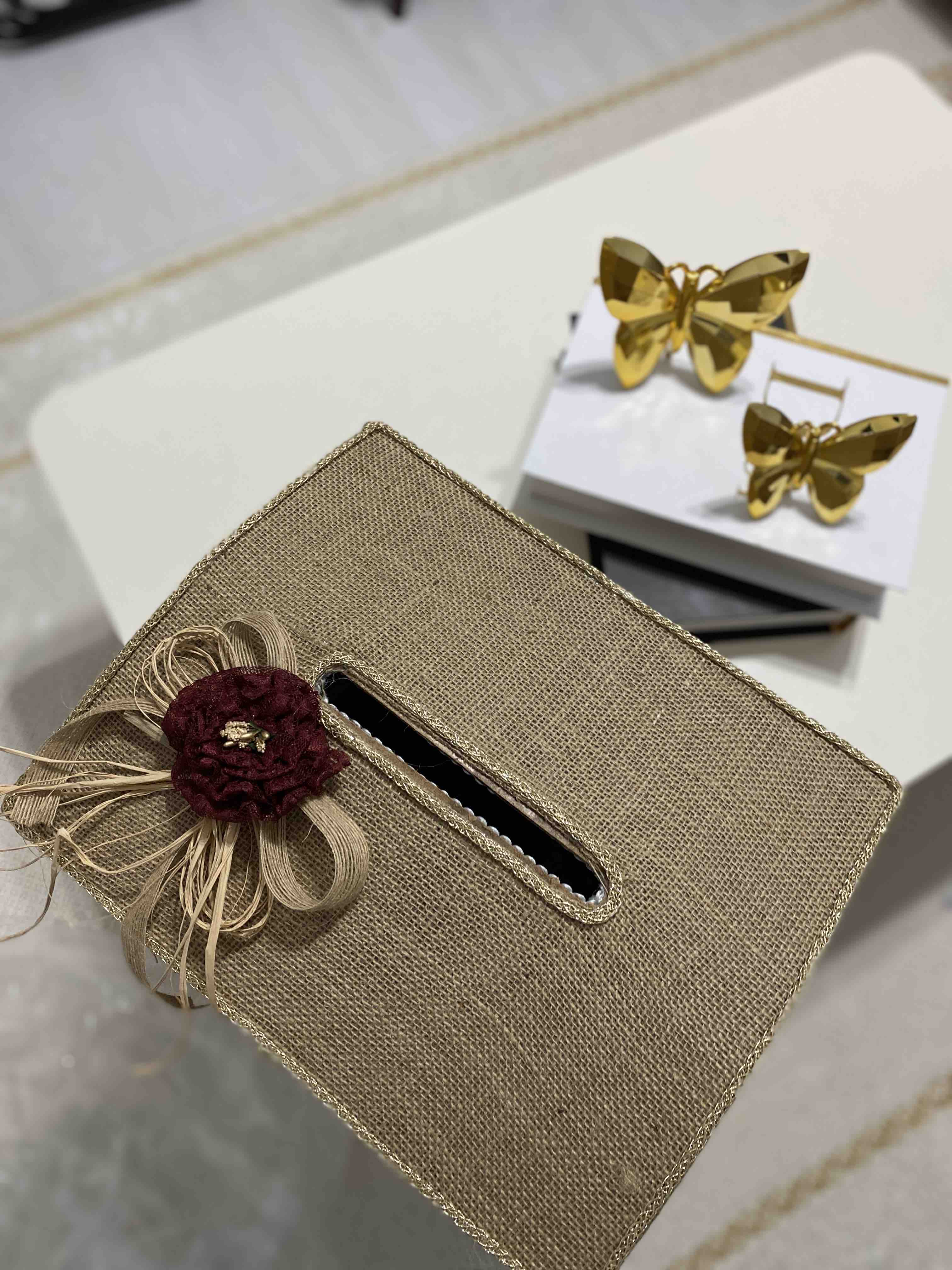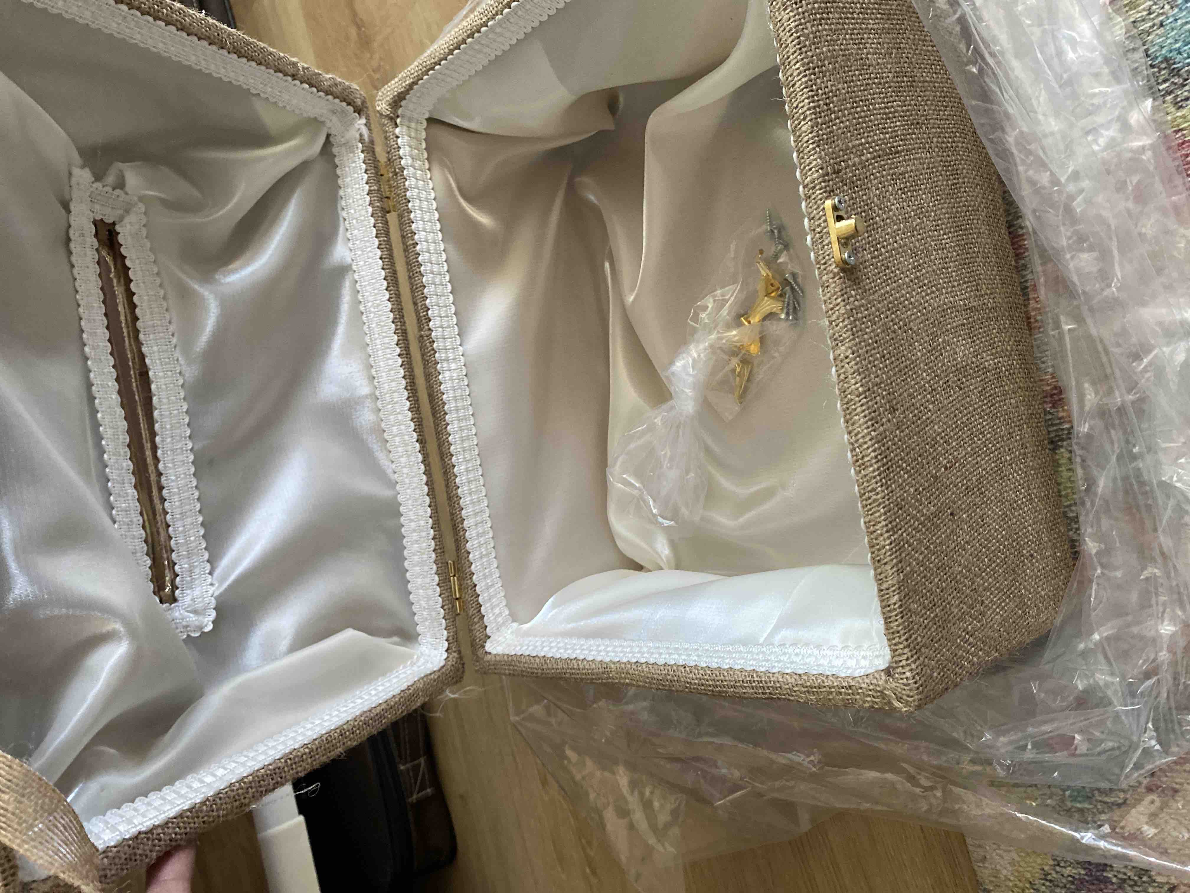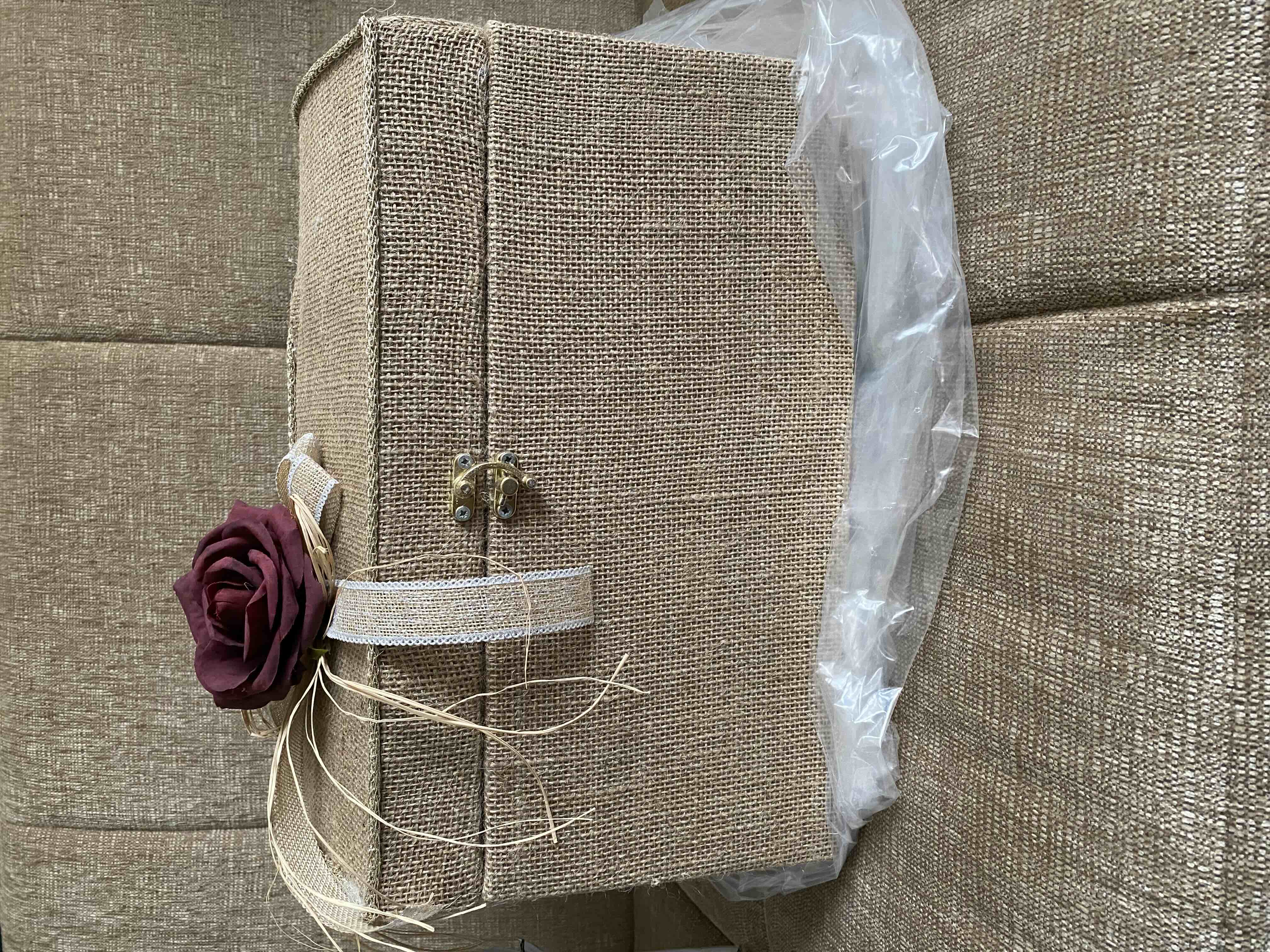 Zarf takı sandığı dışı dayanıklı hasır kumaş içi saten kumaş ile kaplanmıştır.