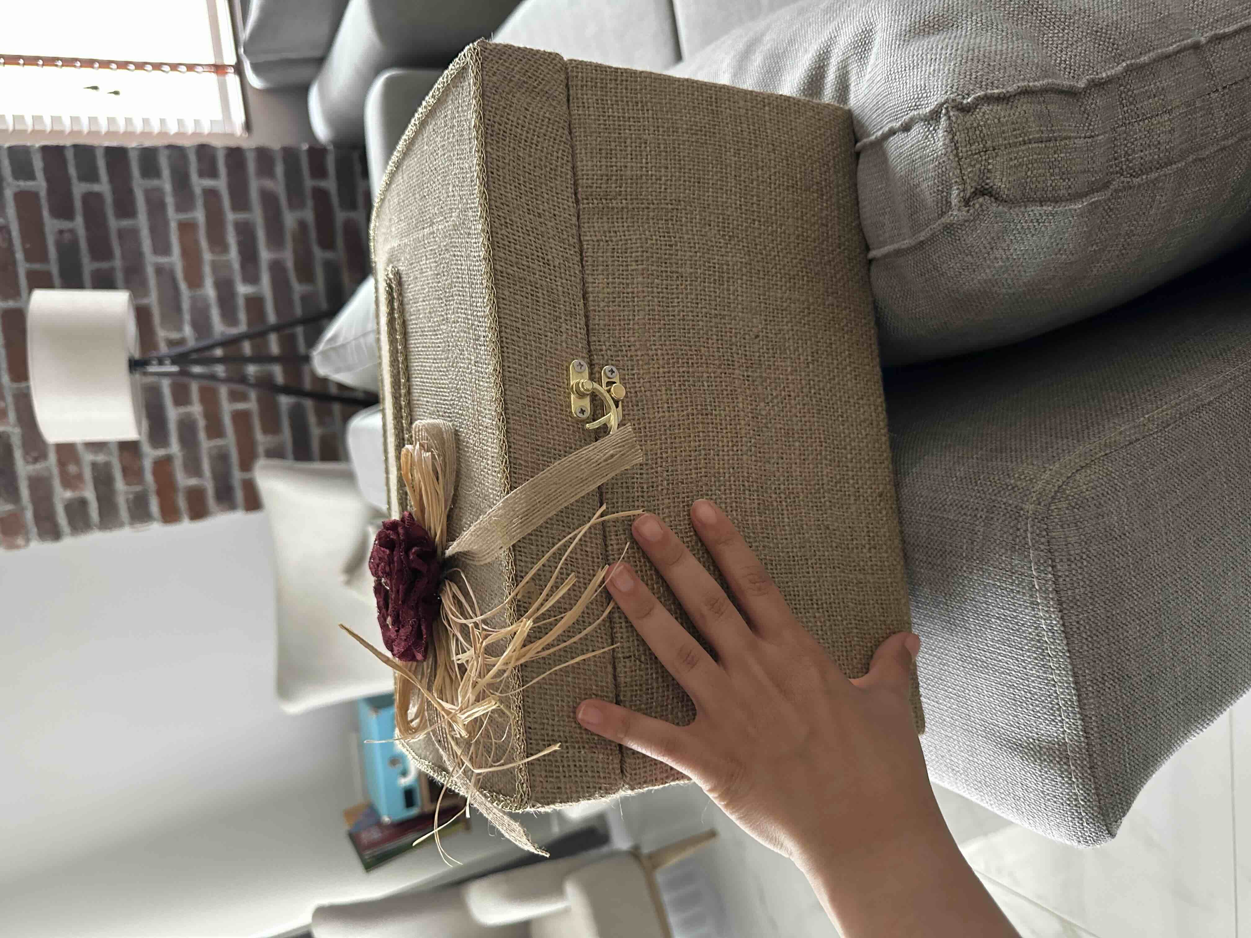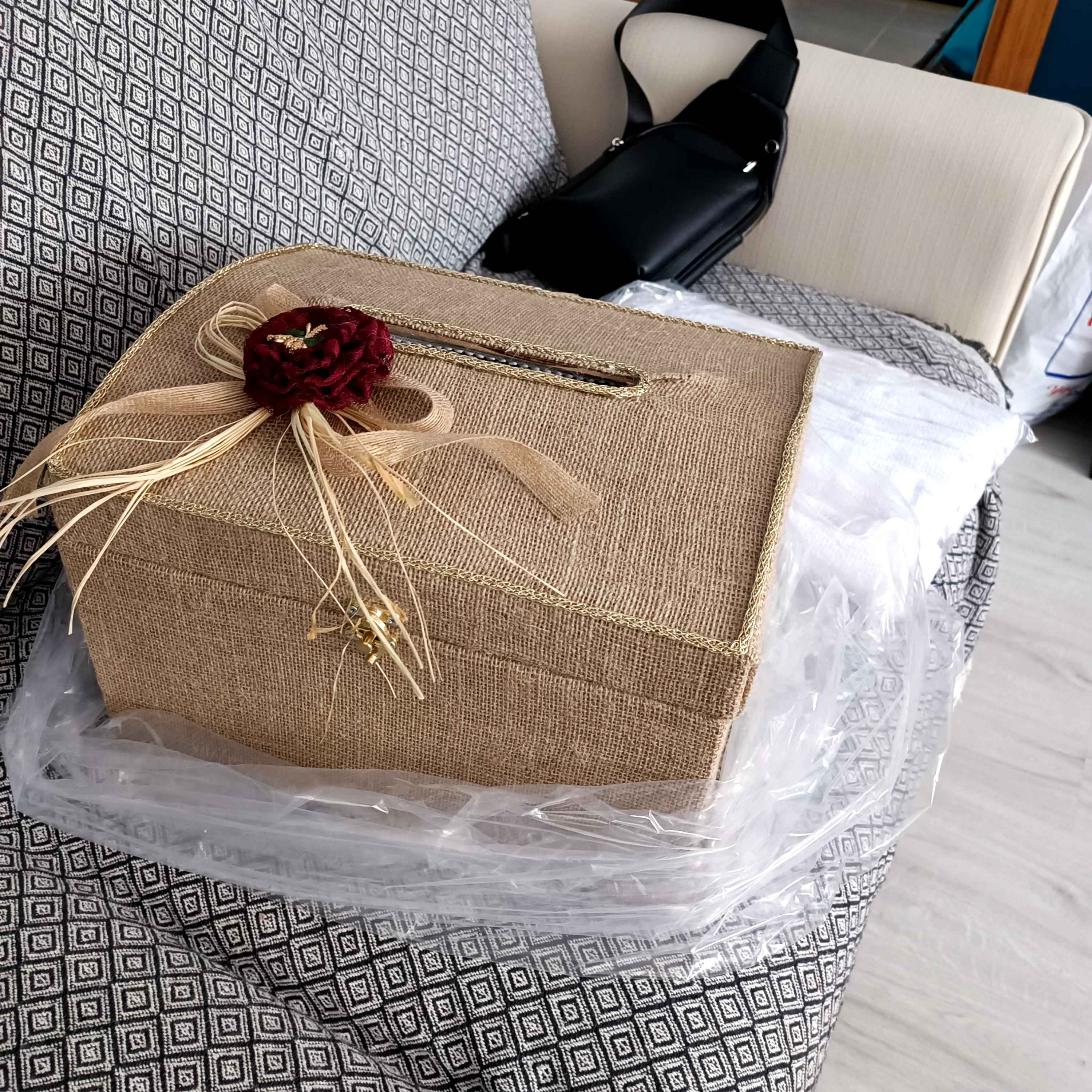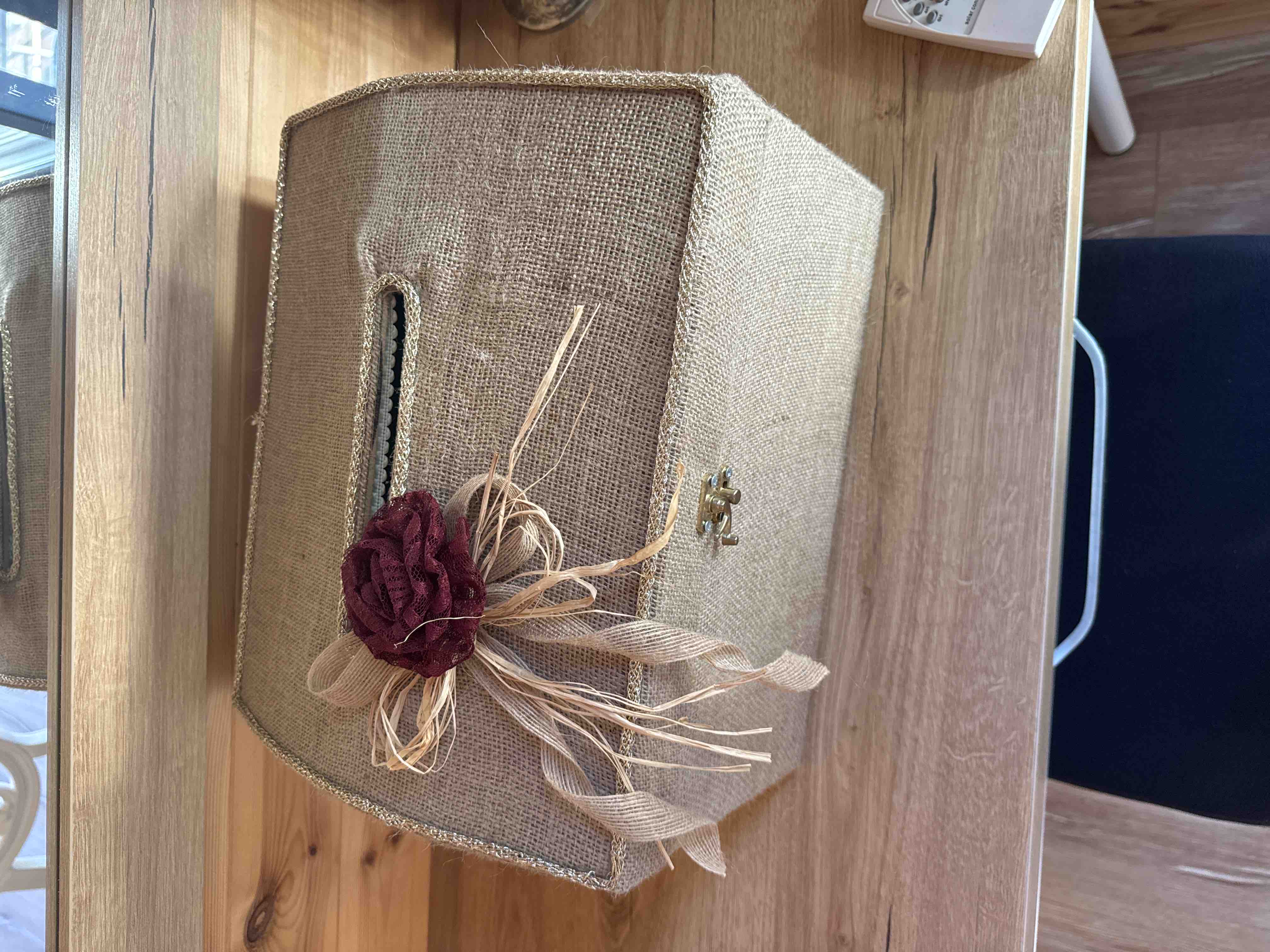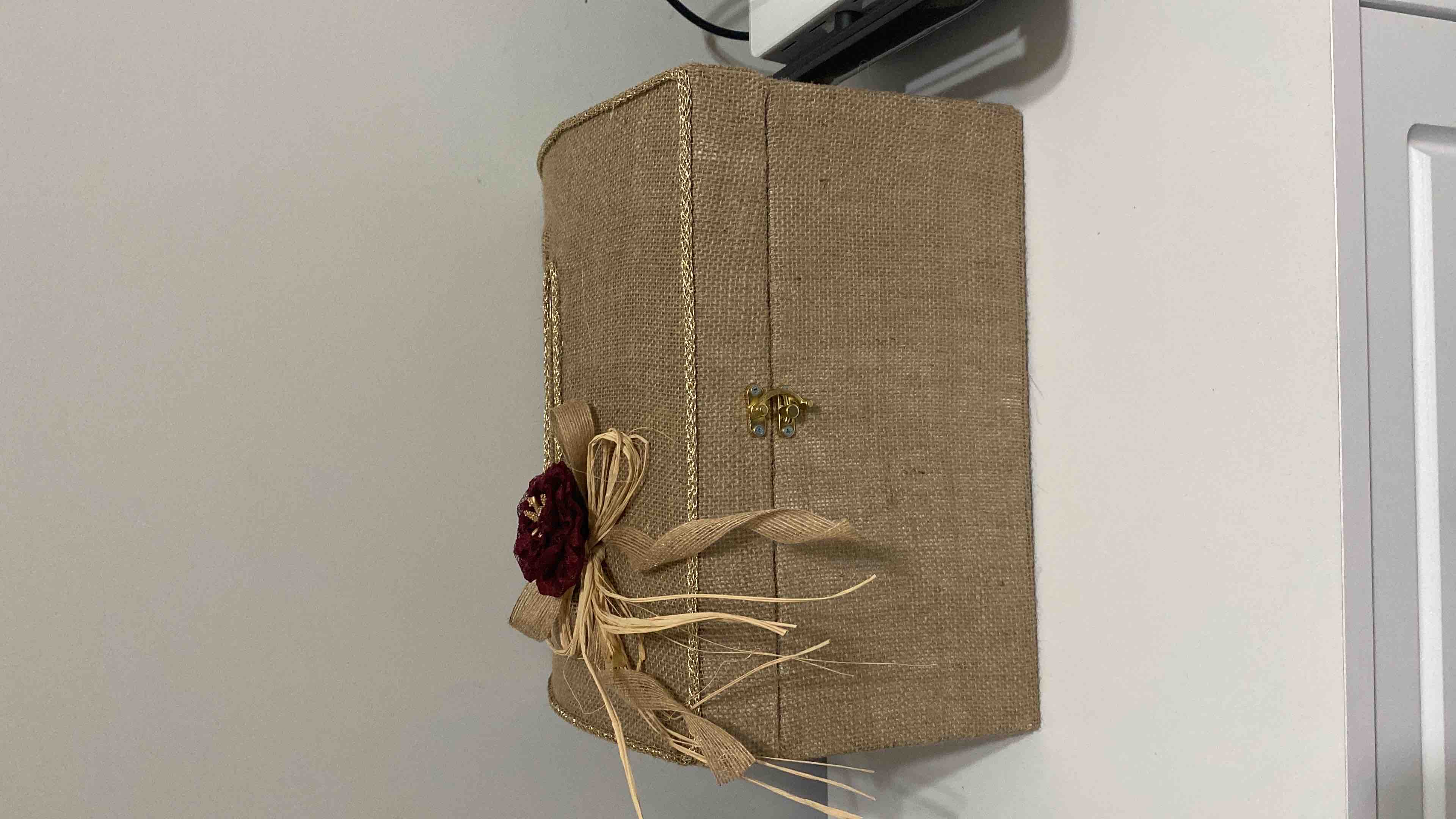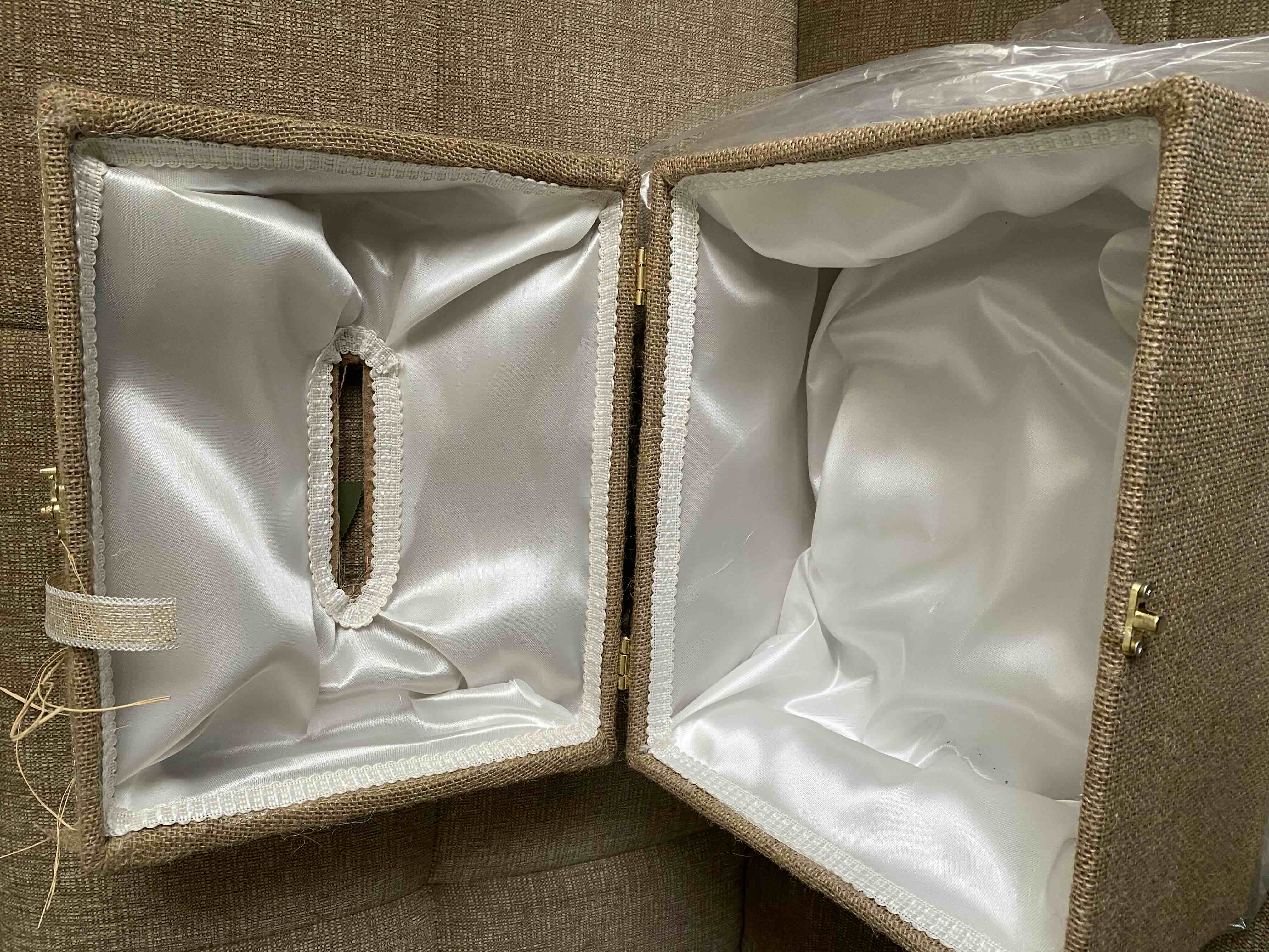 Zarf takı sandığı dışı dayanıklı hasır kumaş içi saten kumaş ile kaplanmıştır.