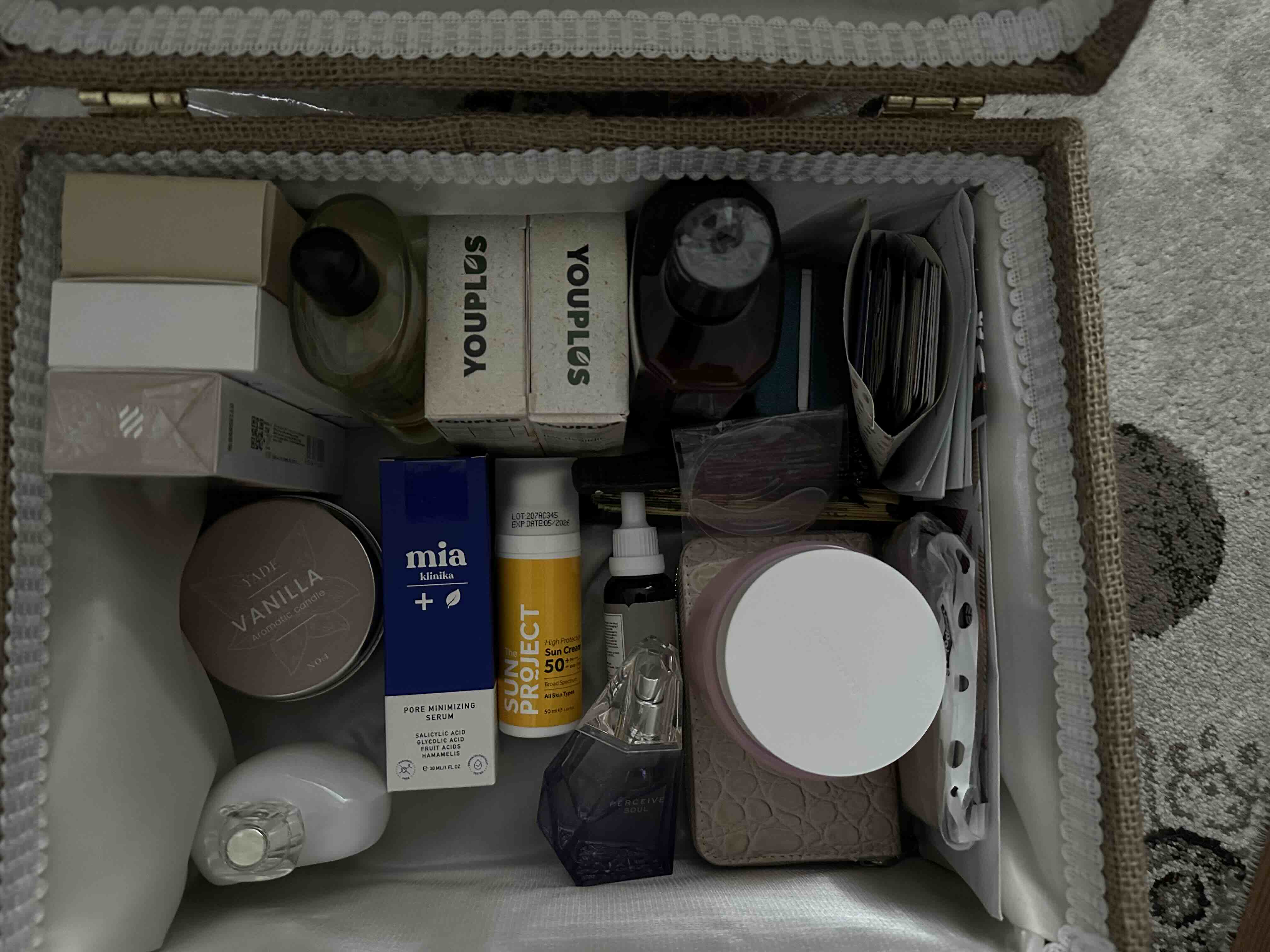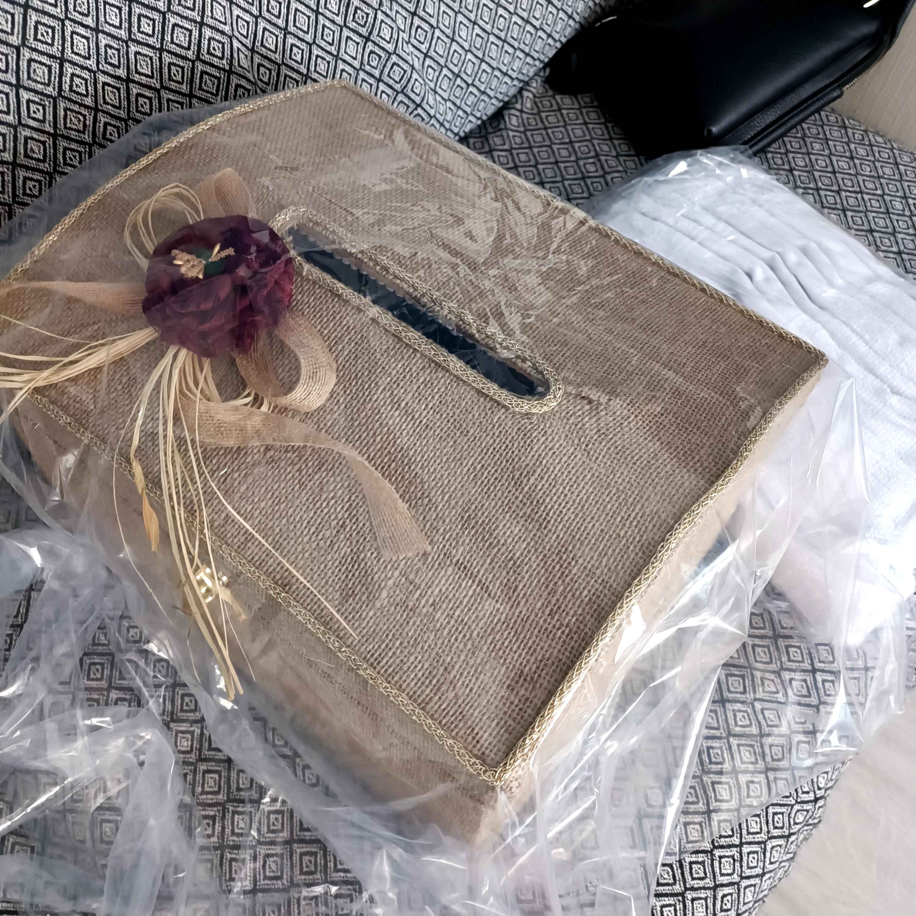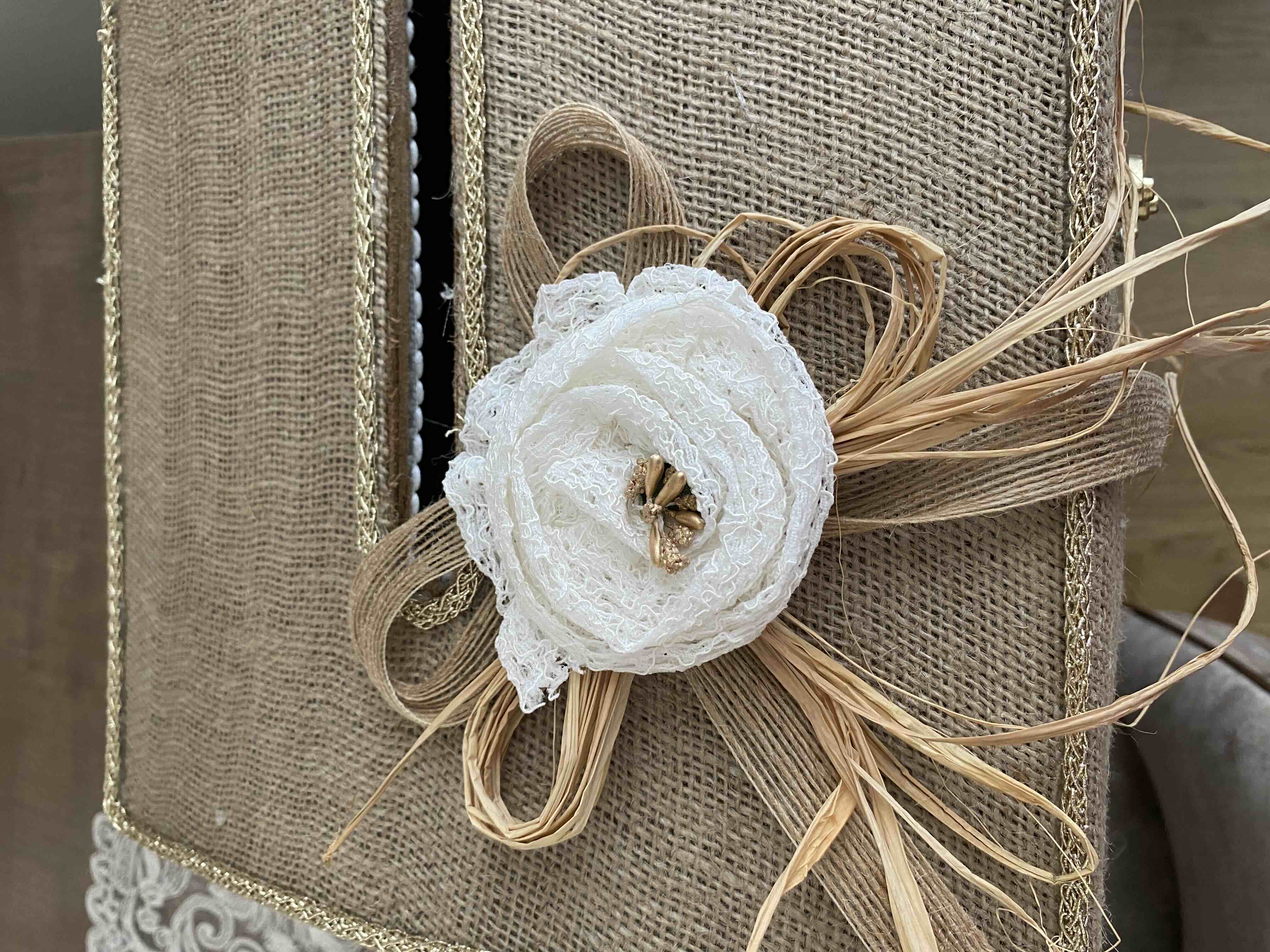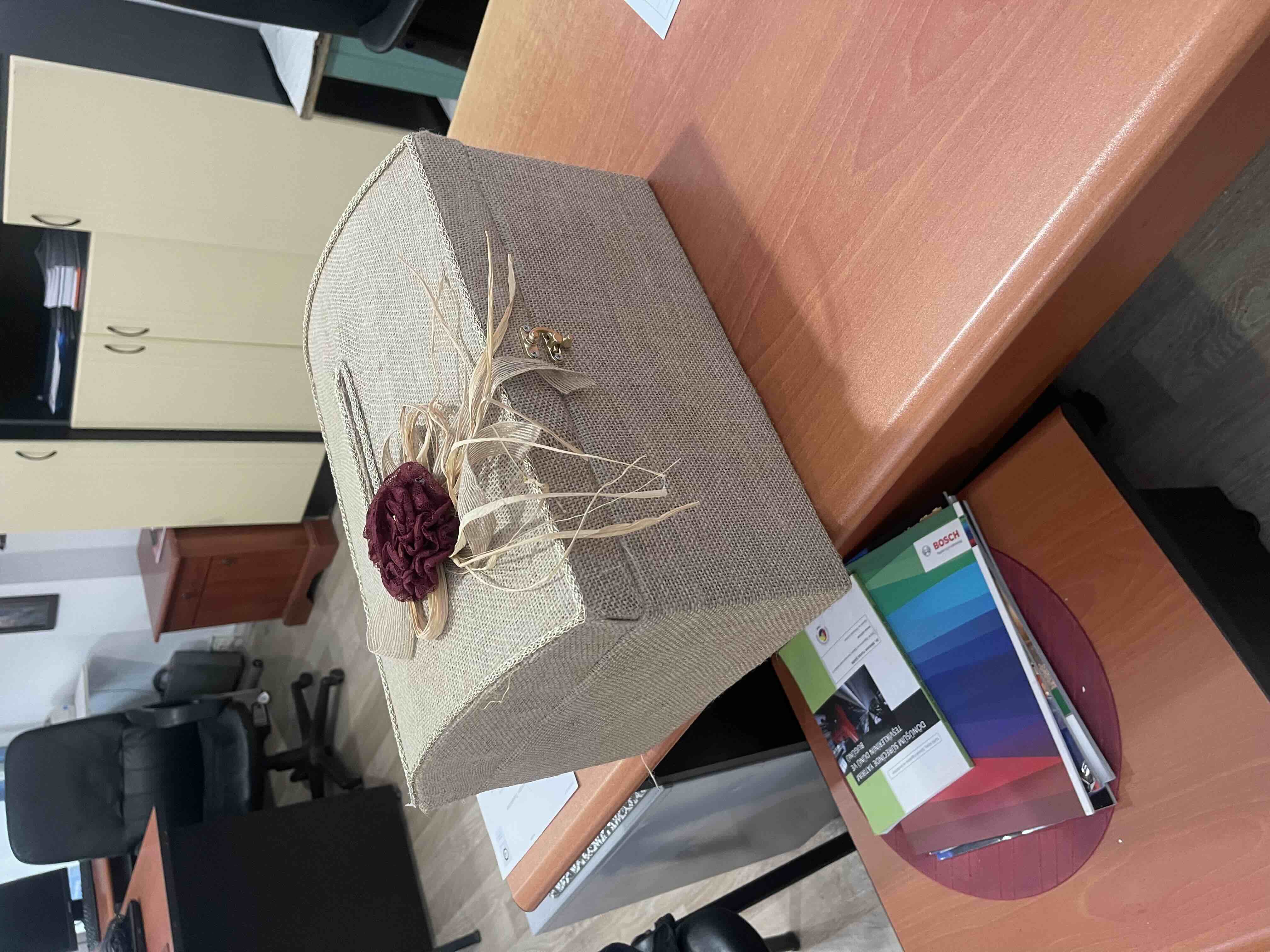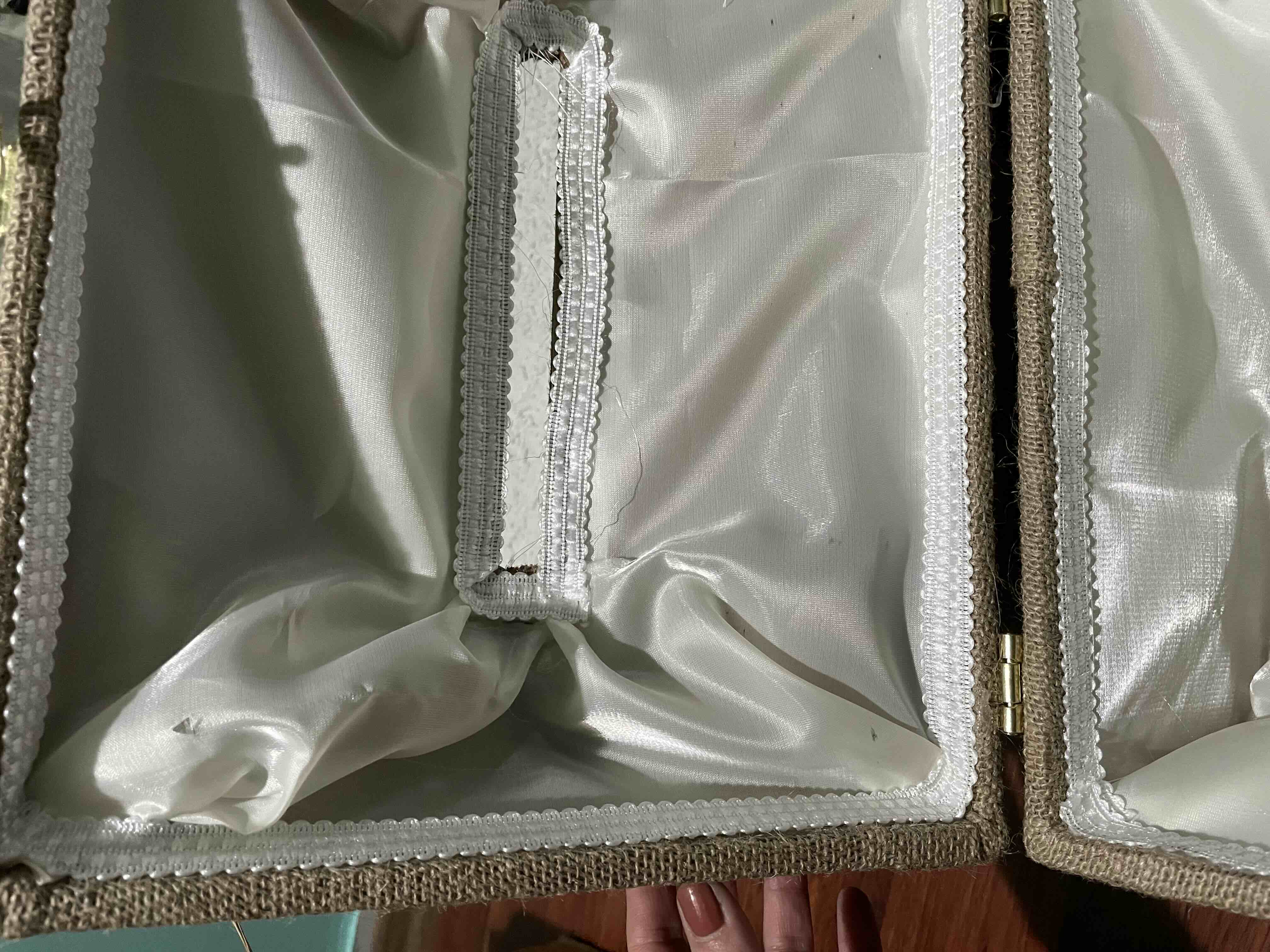 Zarf takı sandığı dışı dayanıklı hasır kumaş içi saten kumaş ile kaplanmıştır.