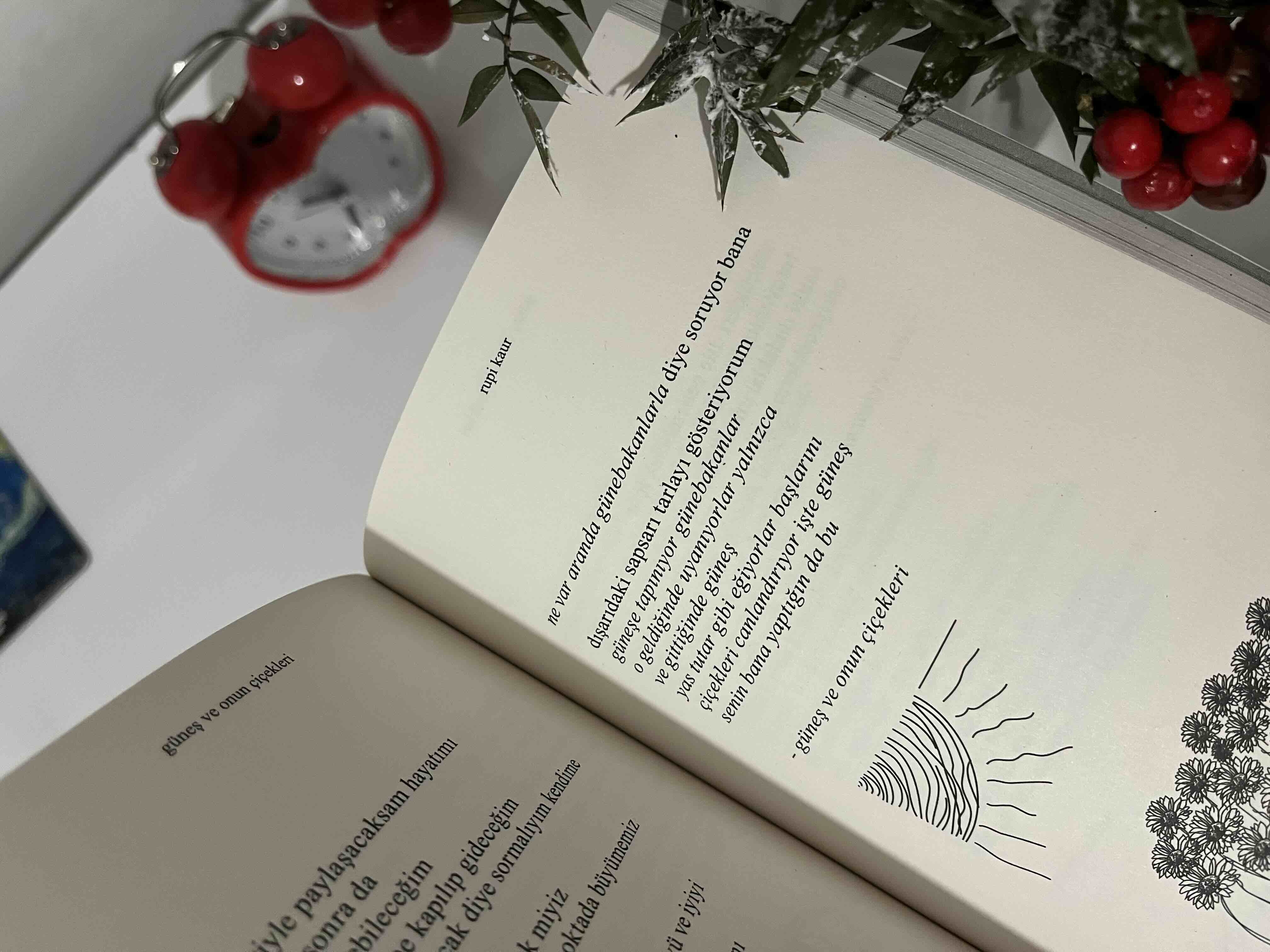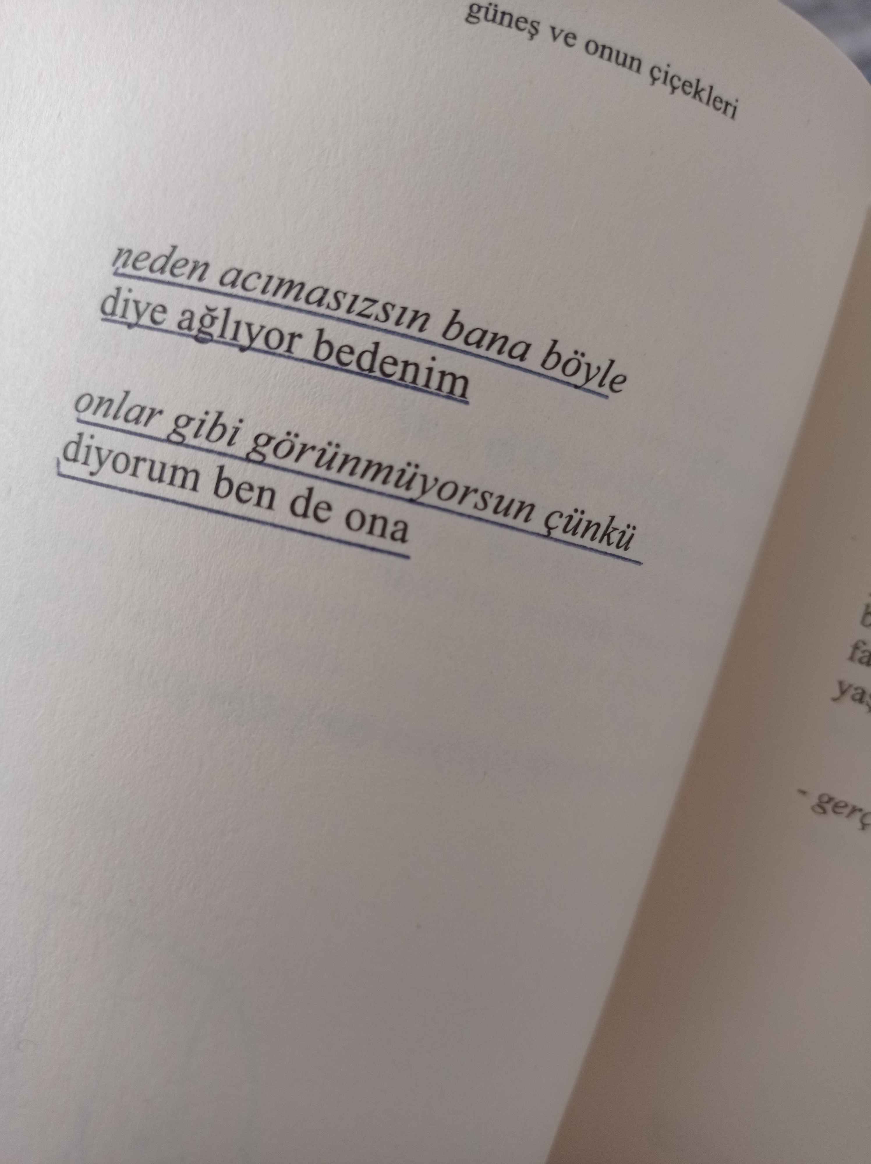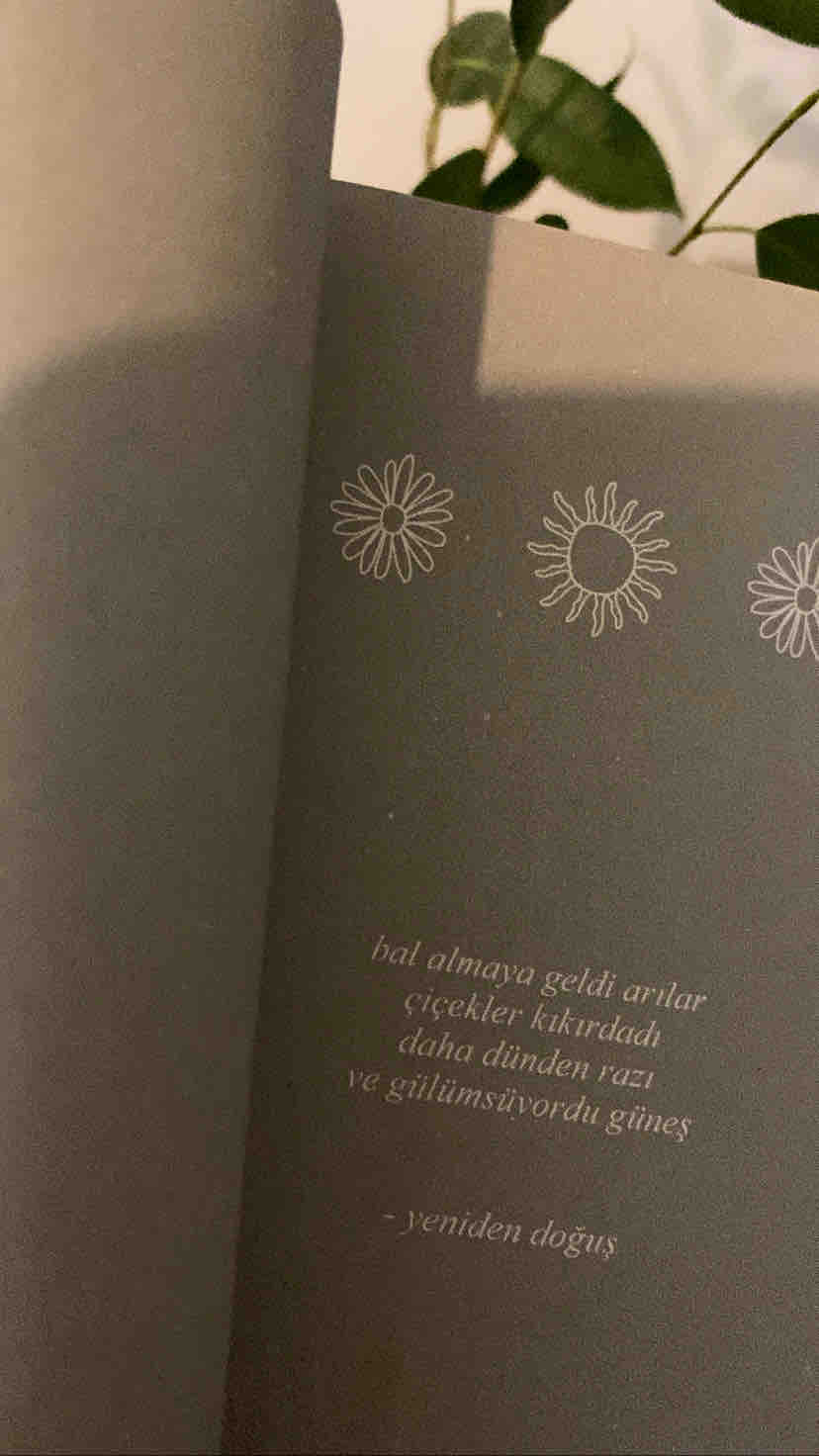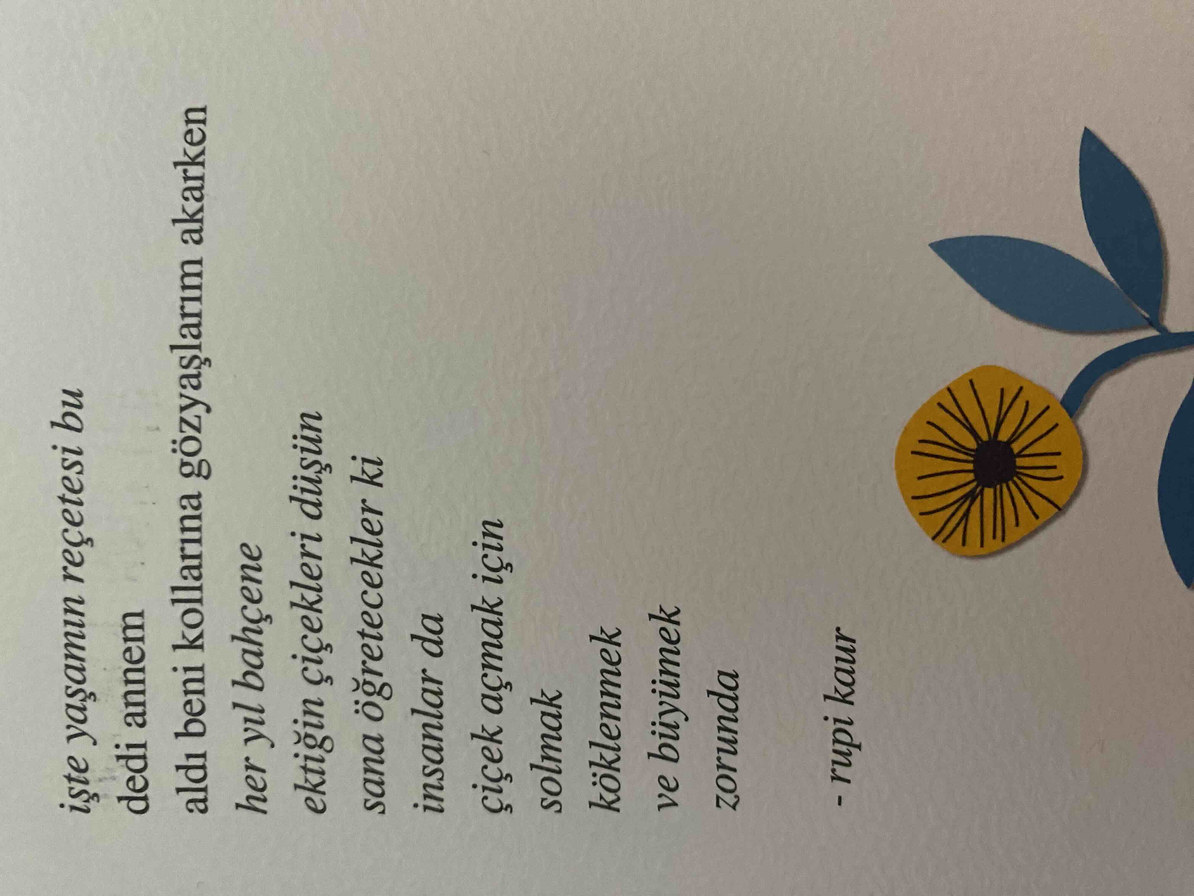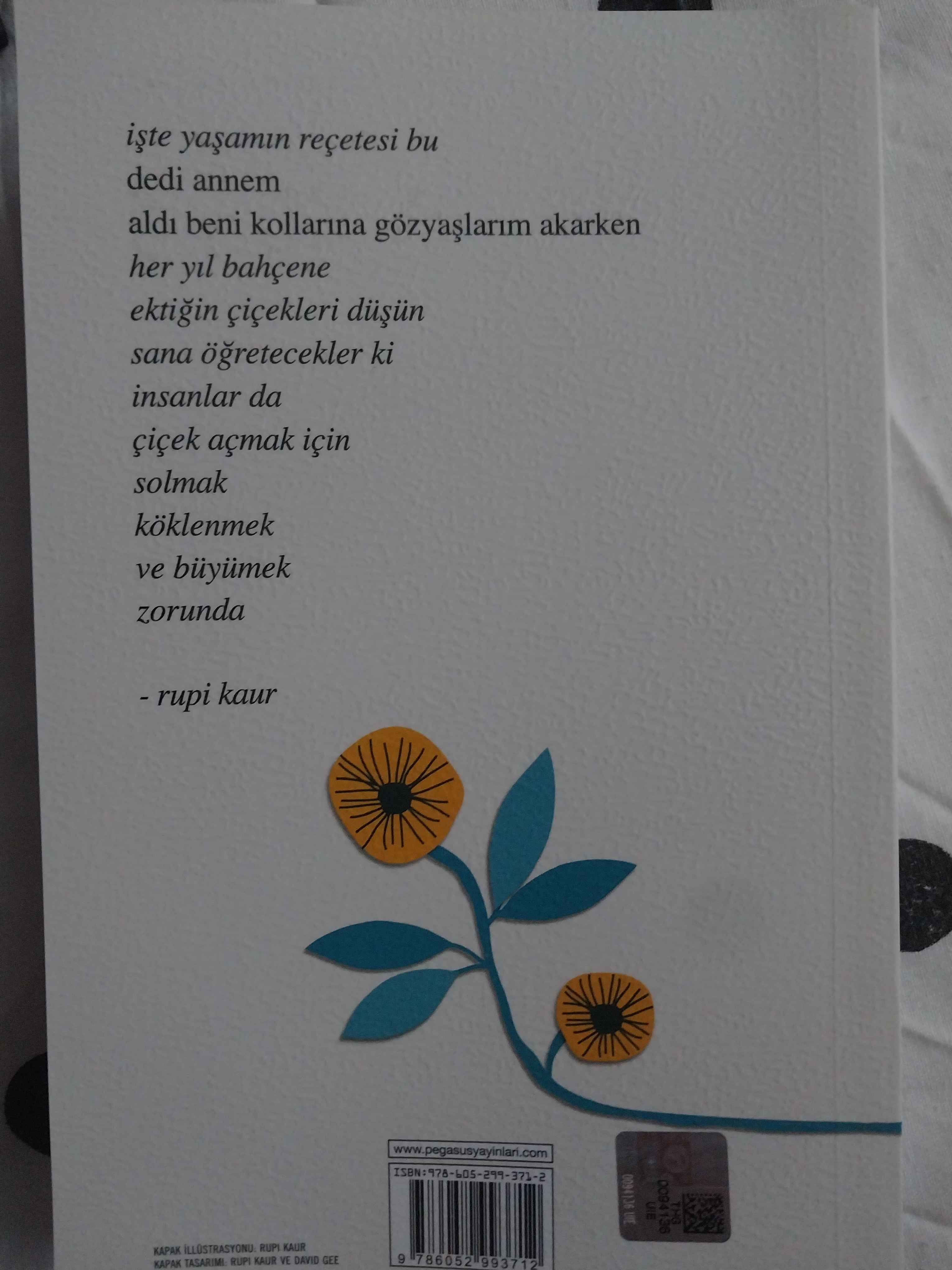 işte yaşamın reçetesi bu dedi annem aldı beni kollarına gözyaşlarım akarken her yıl bahçene ektiğin çiçekleri düşün sana öğretecekler ki insanlar da çiçek açmak için solmak köklenmek ve büyümek zorunda - rupi kaur Yazar: Rupi Kaur Özgün Adı: The Sun and Her Flowers Çeviri: Gizem Aldoğan Sayfa: 256 Boyut: 12,7 x 19,7