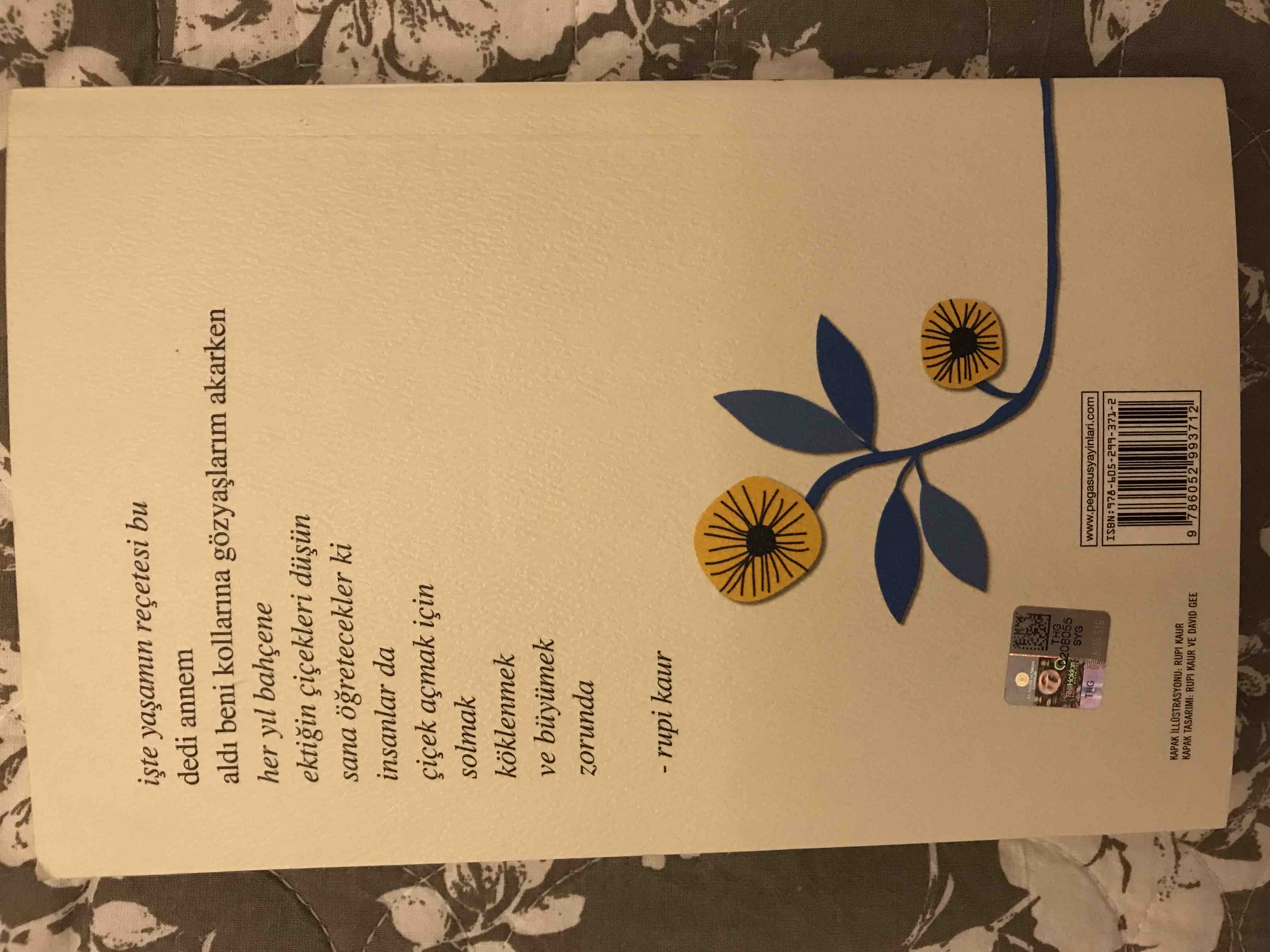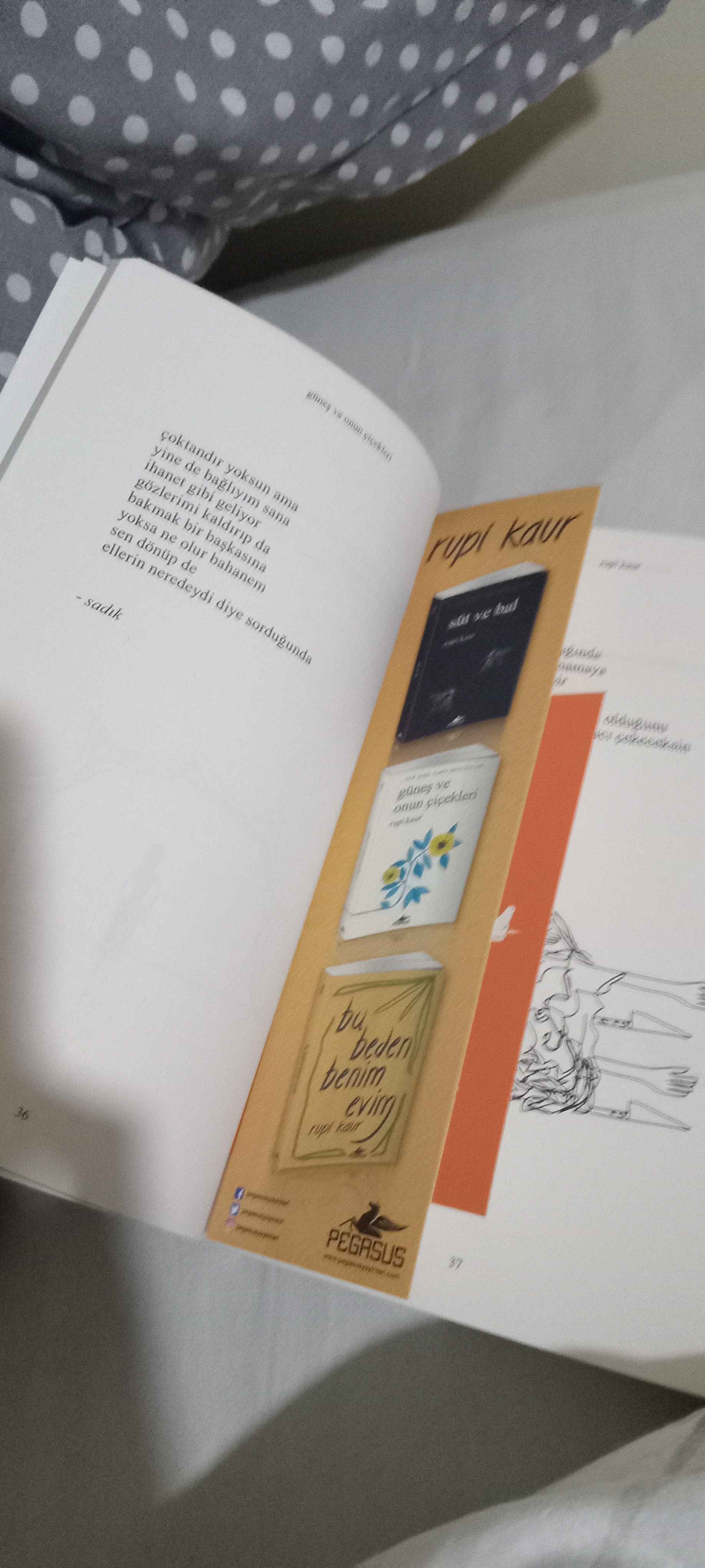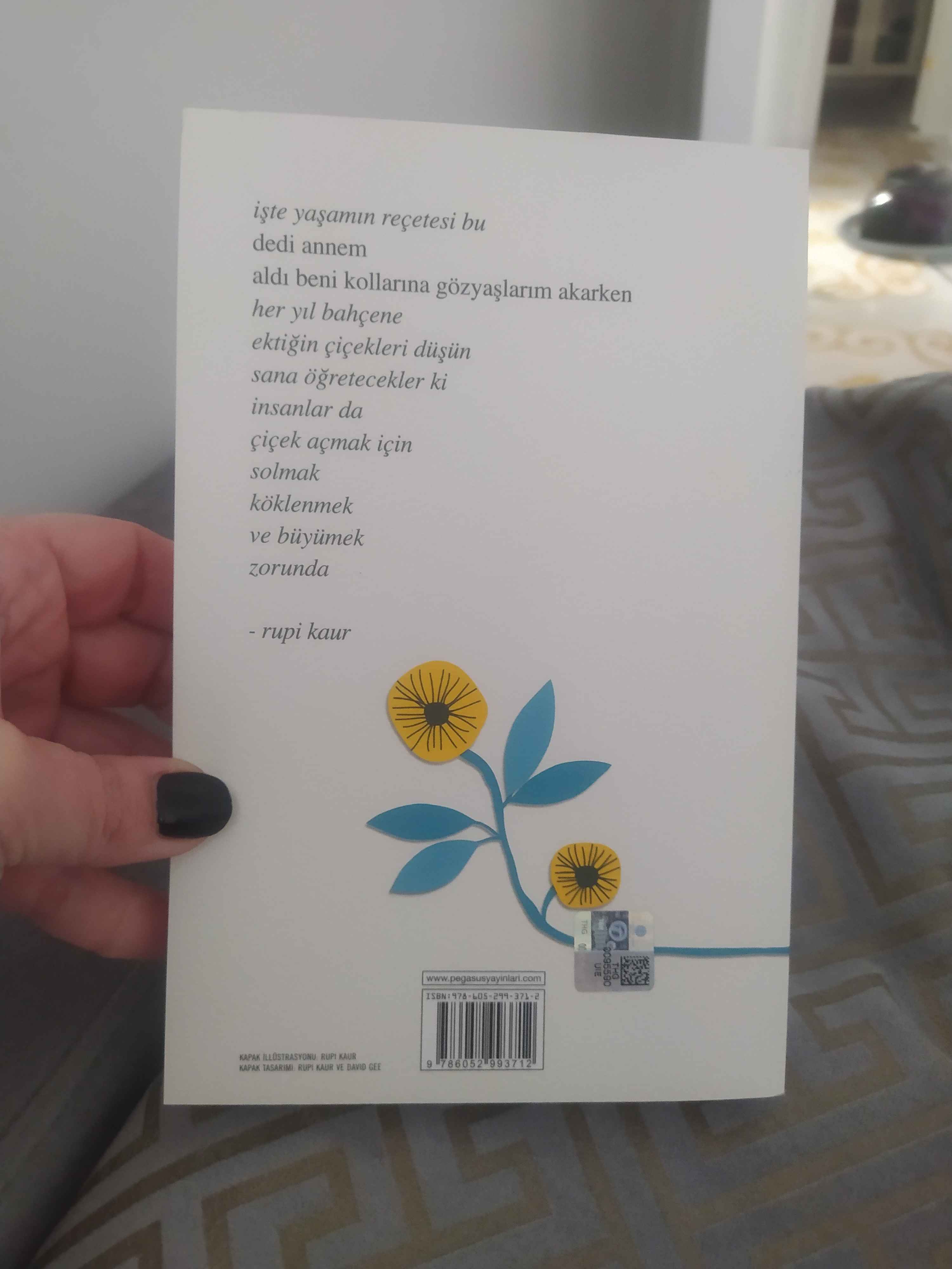 - M** S**Onaylı 🙂13 Tem 2025Satıcı: Pegasus YayınlarıRupi Kaur’dan 2. Kitabım kitap çok iyi pegasus zaten güvenilir zamanında falan geliyor sadece yanlış hatırlamıyorsam (ben kitabı birkaç ay önce aldım)kitap elime ulaştığında paketlemede güvenlik önlemiyoktu hani patpat falan beklerdim ben açıkçası çünkü sayfaları,kapağı kıvrılıyor bazen ama şükür bişeyi yoktu kitabın