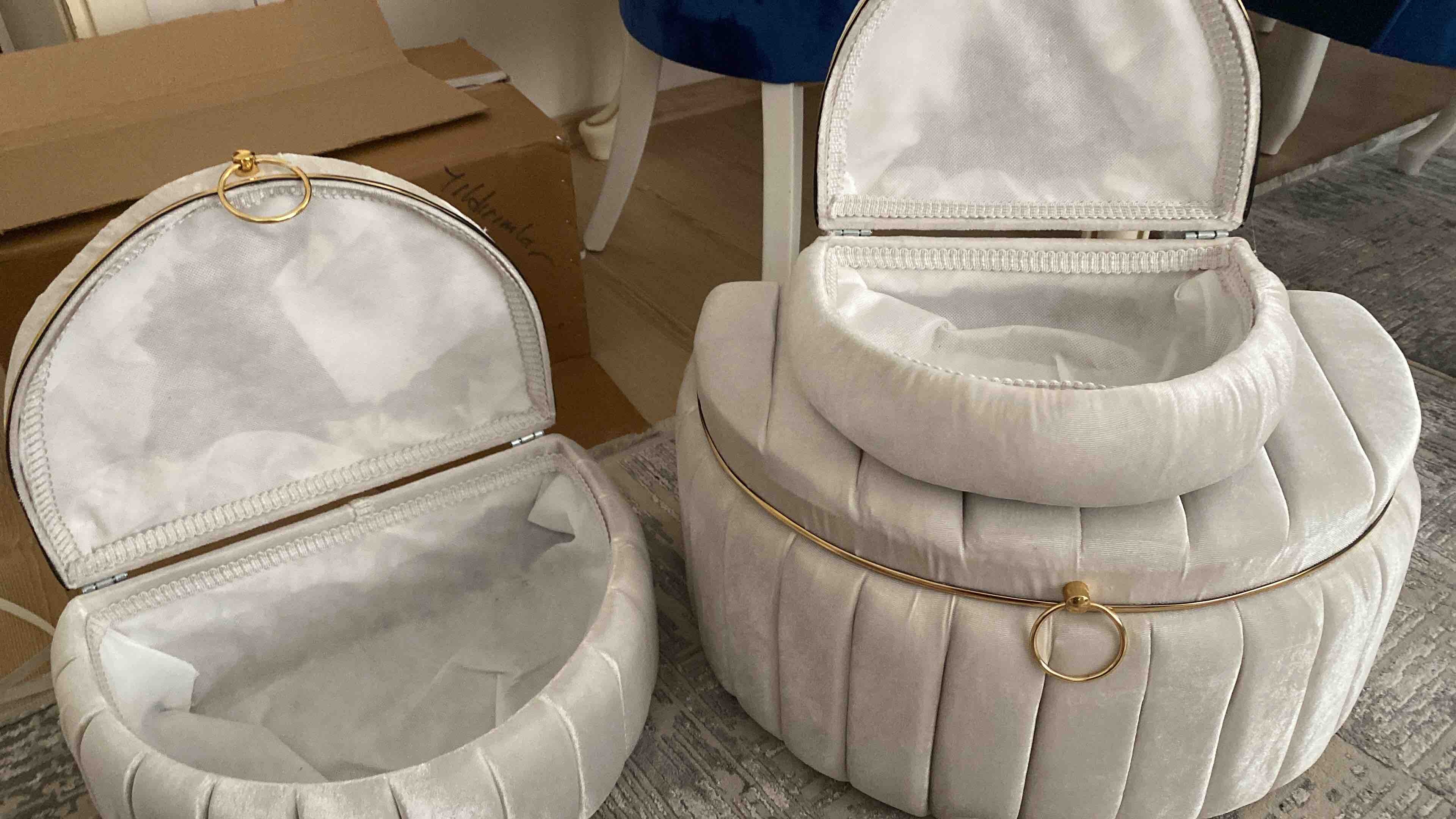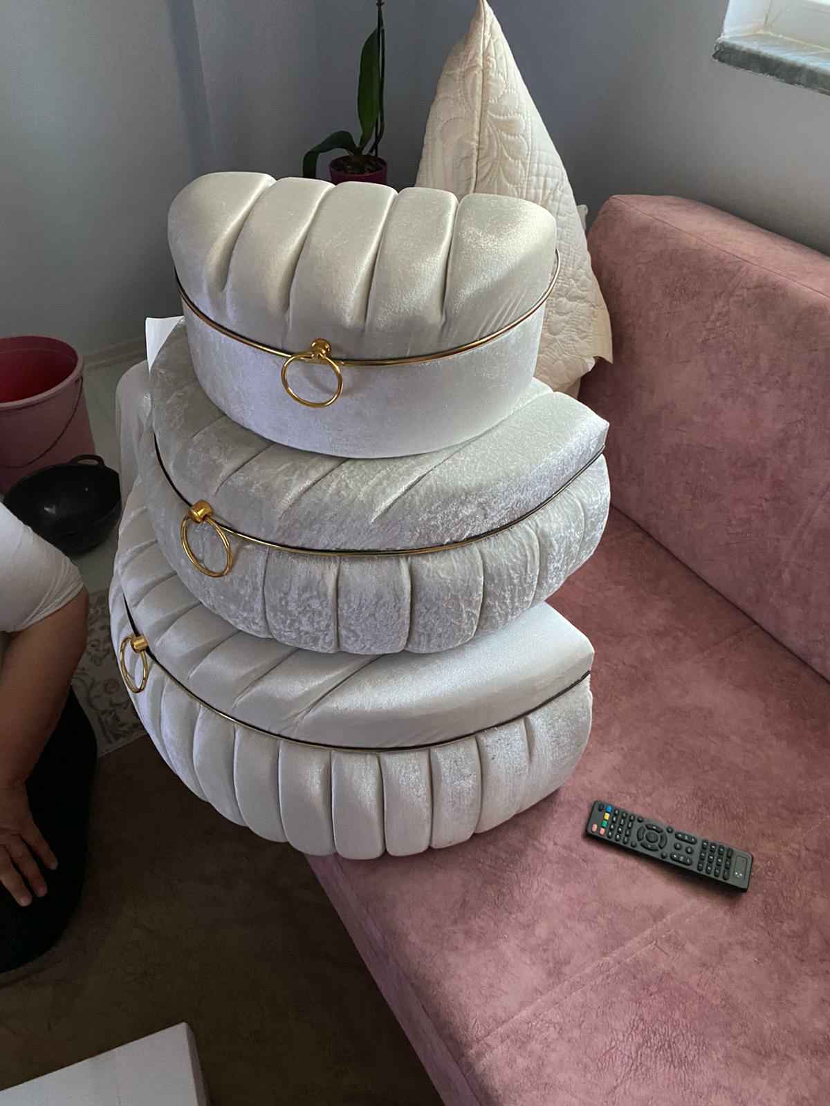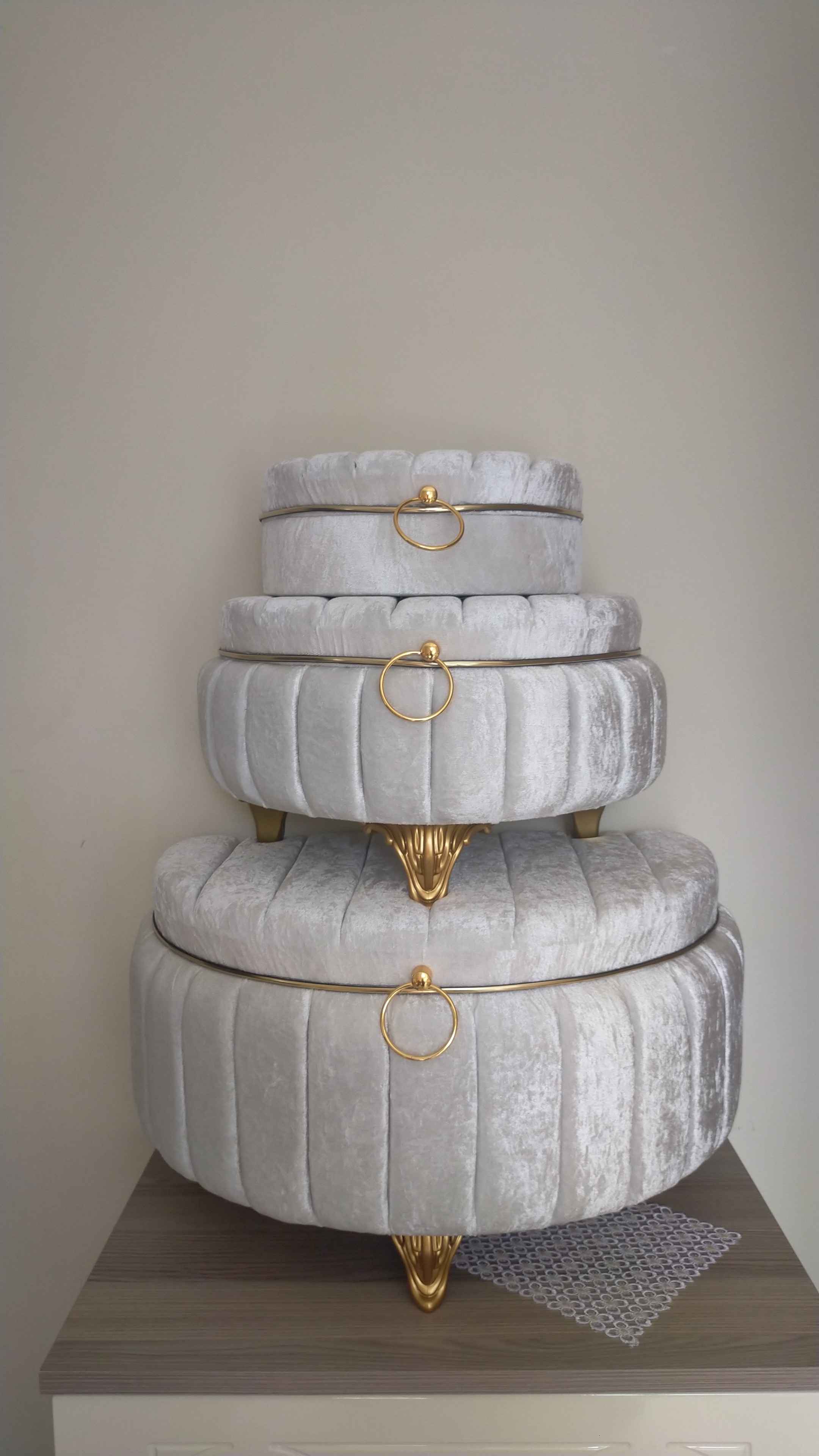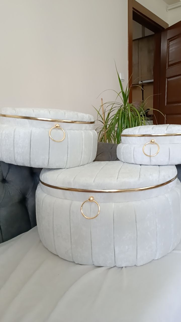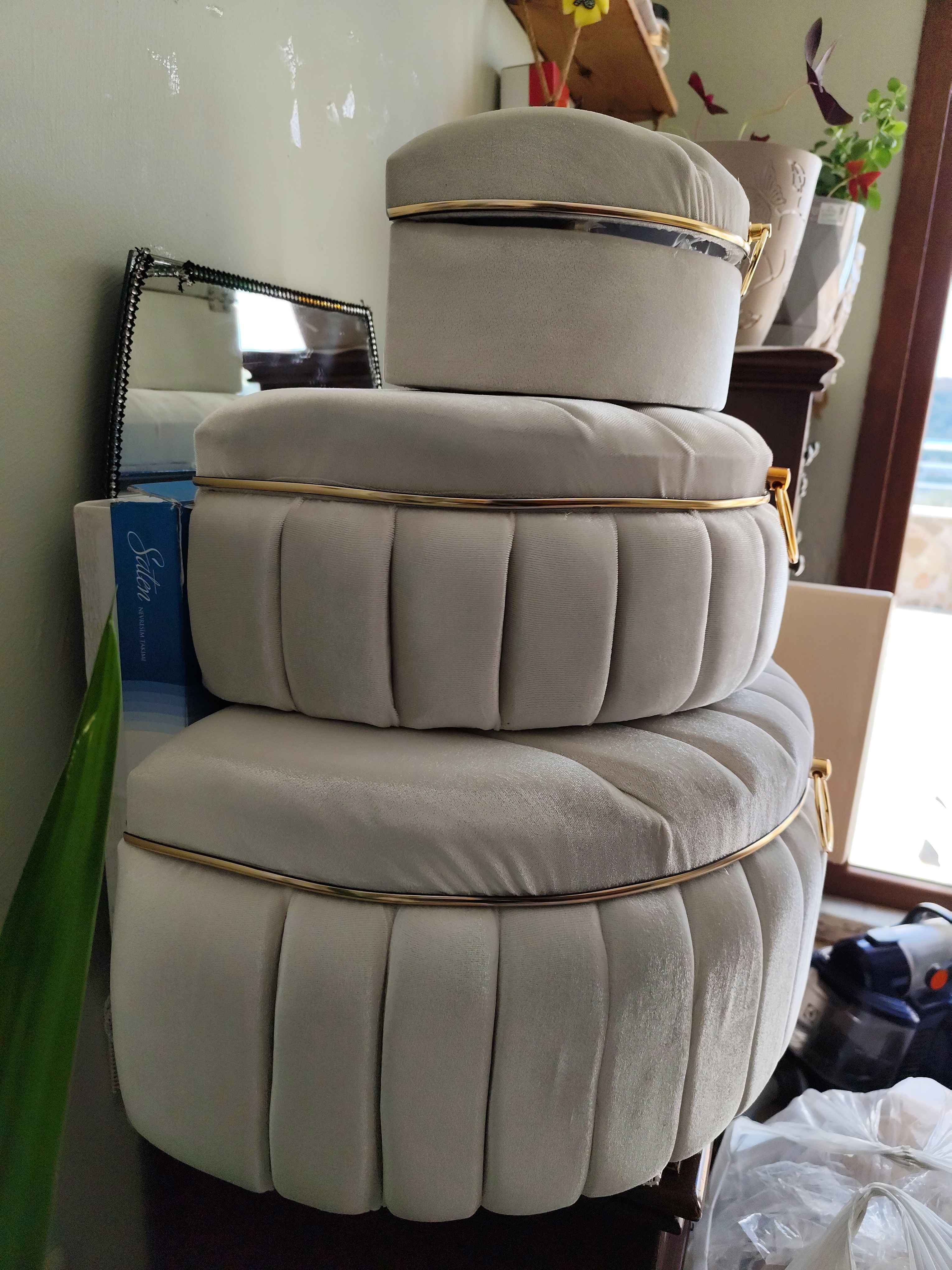 Üçlü set halinde sunulan bu ürün, geniş depolama alanı sunarak çeyiz eşyalarınızı düzenli bir şekilde saklamanızı kolaylaştırır