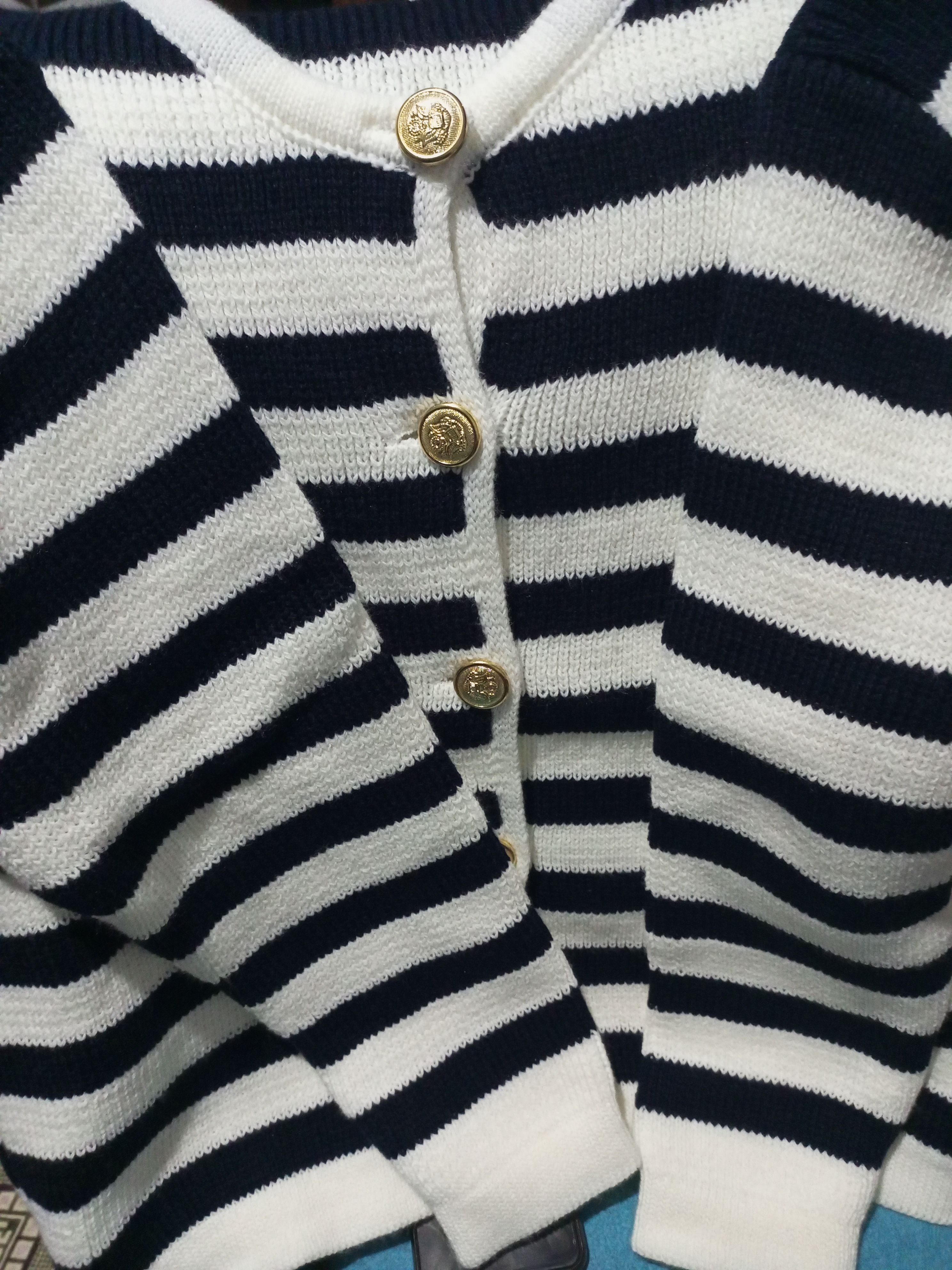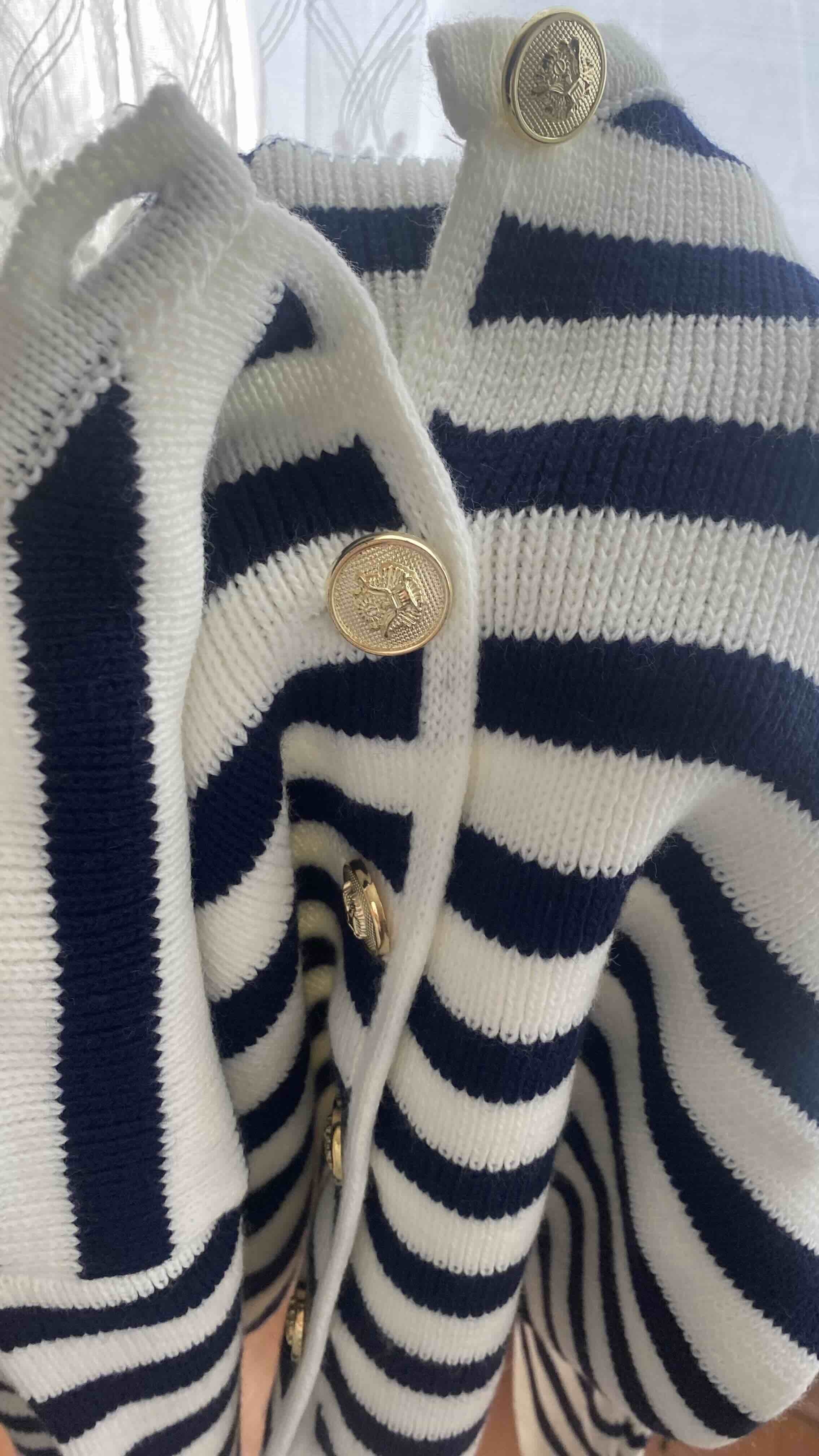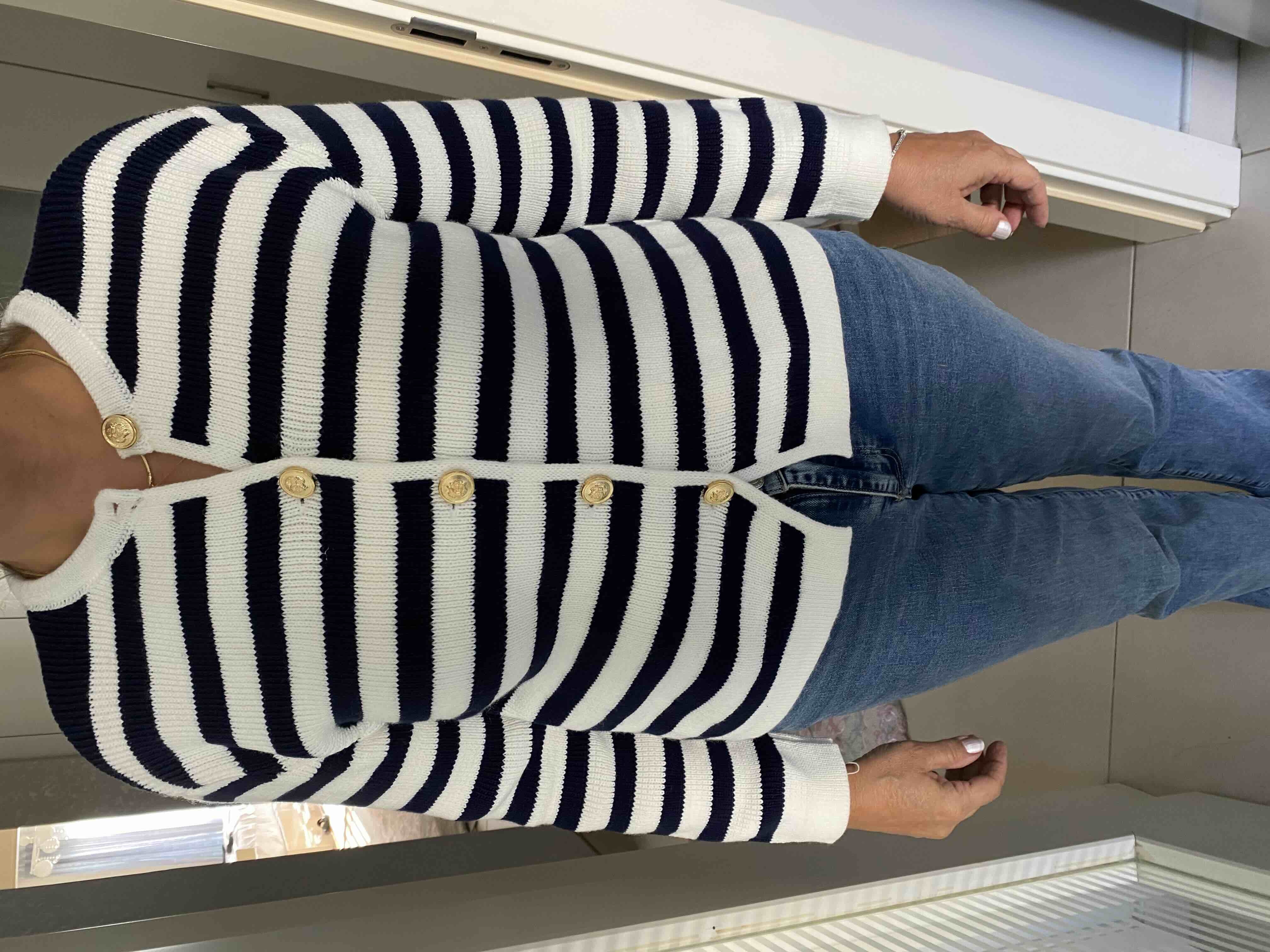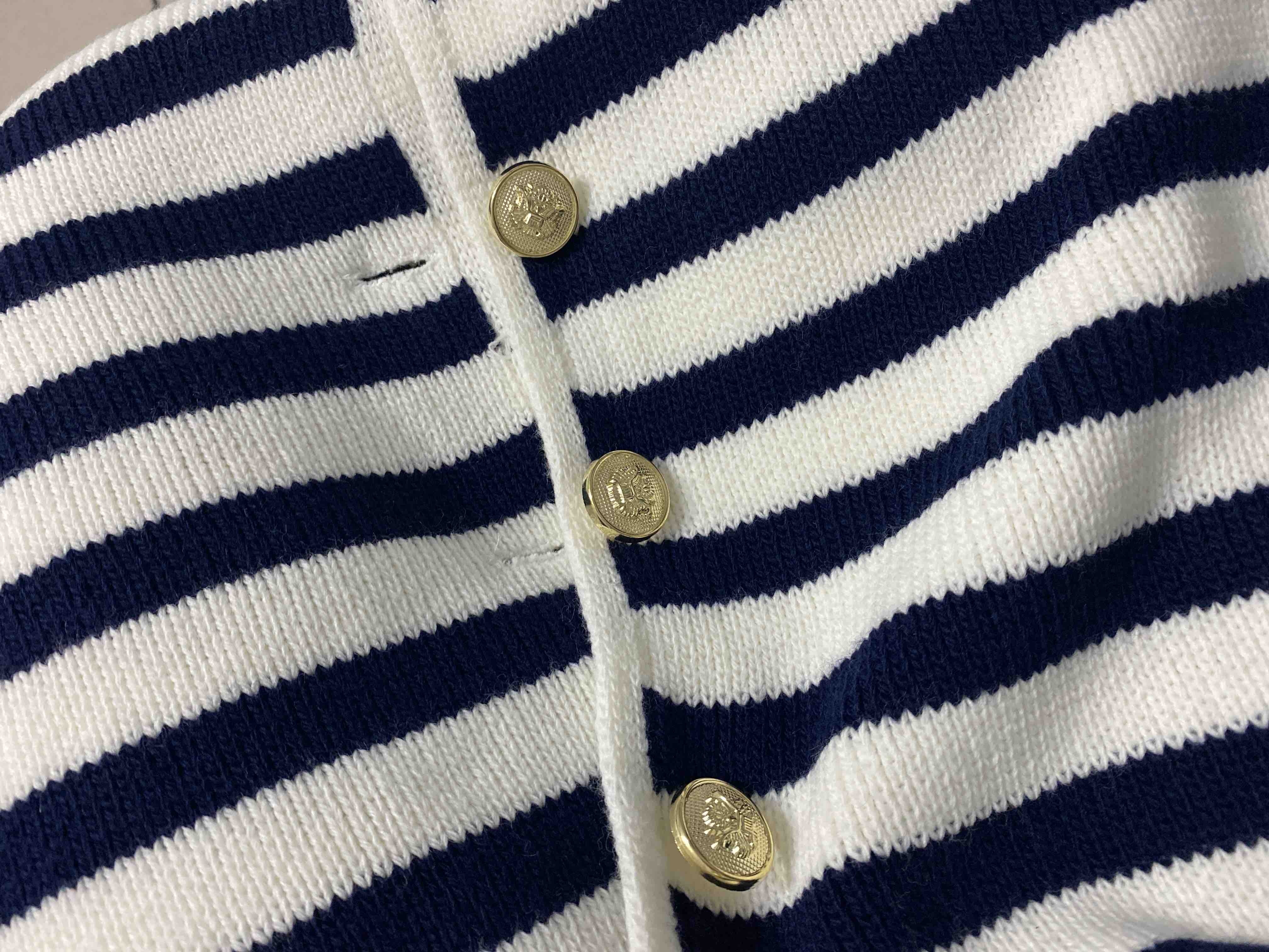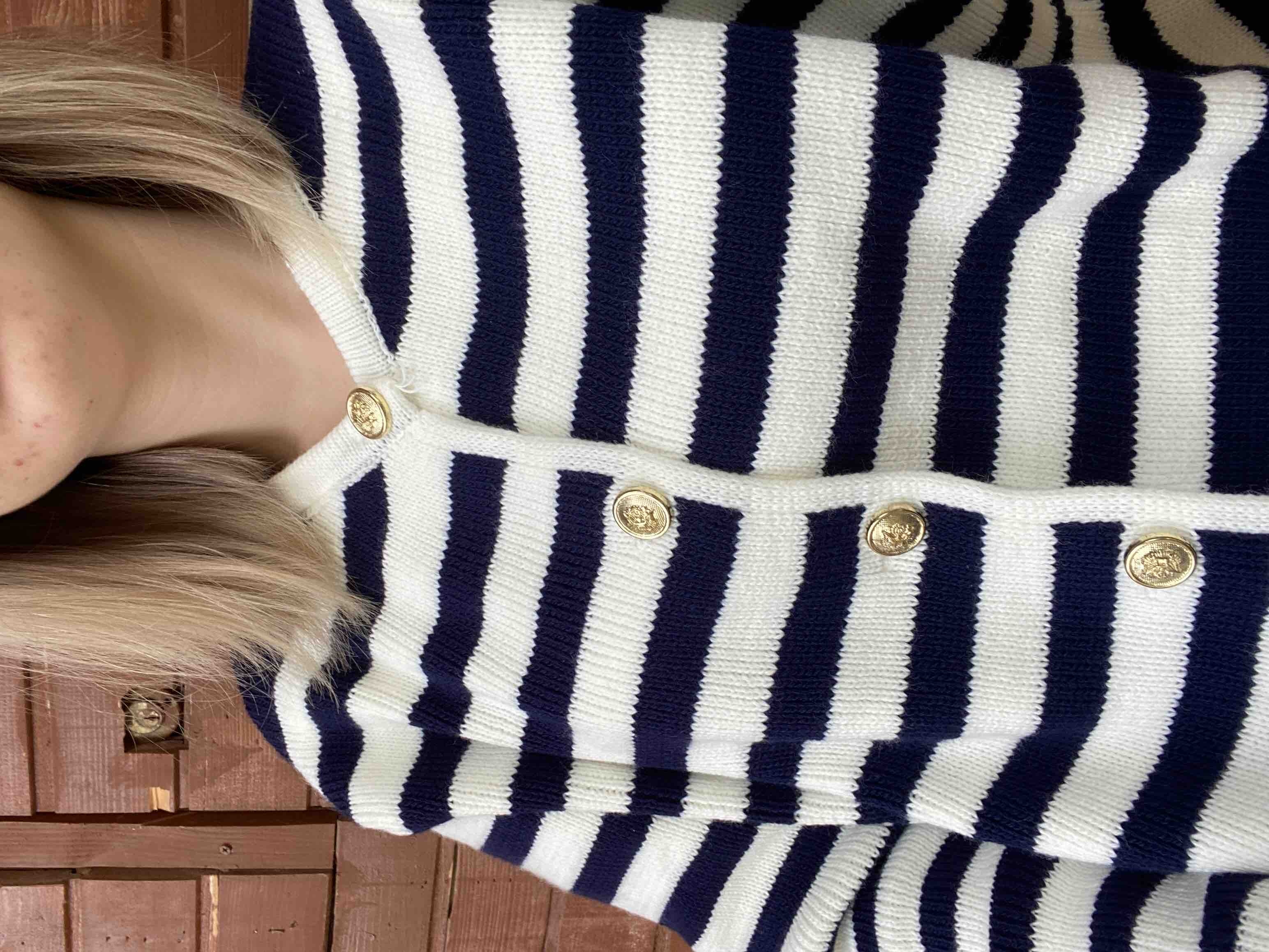 Kadın Lacivert Çizgili Bisiklet Yaka Fitilli Gold Düğme Detaylı Triko Hırka Ürün Detayı