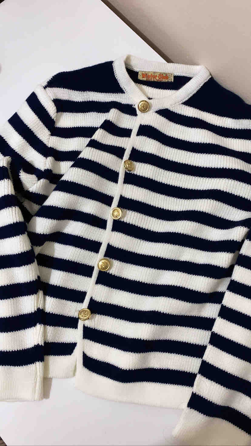 Kadın Lacivert Çizgili Bisiklet Yaka Fitilli Gold Düğme Detaylı Triko Hırka