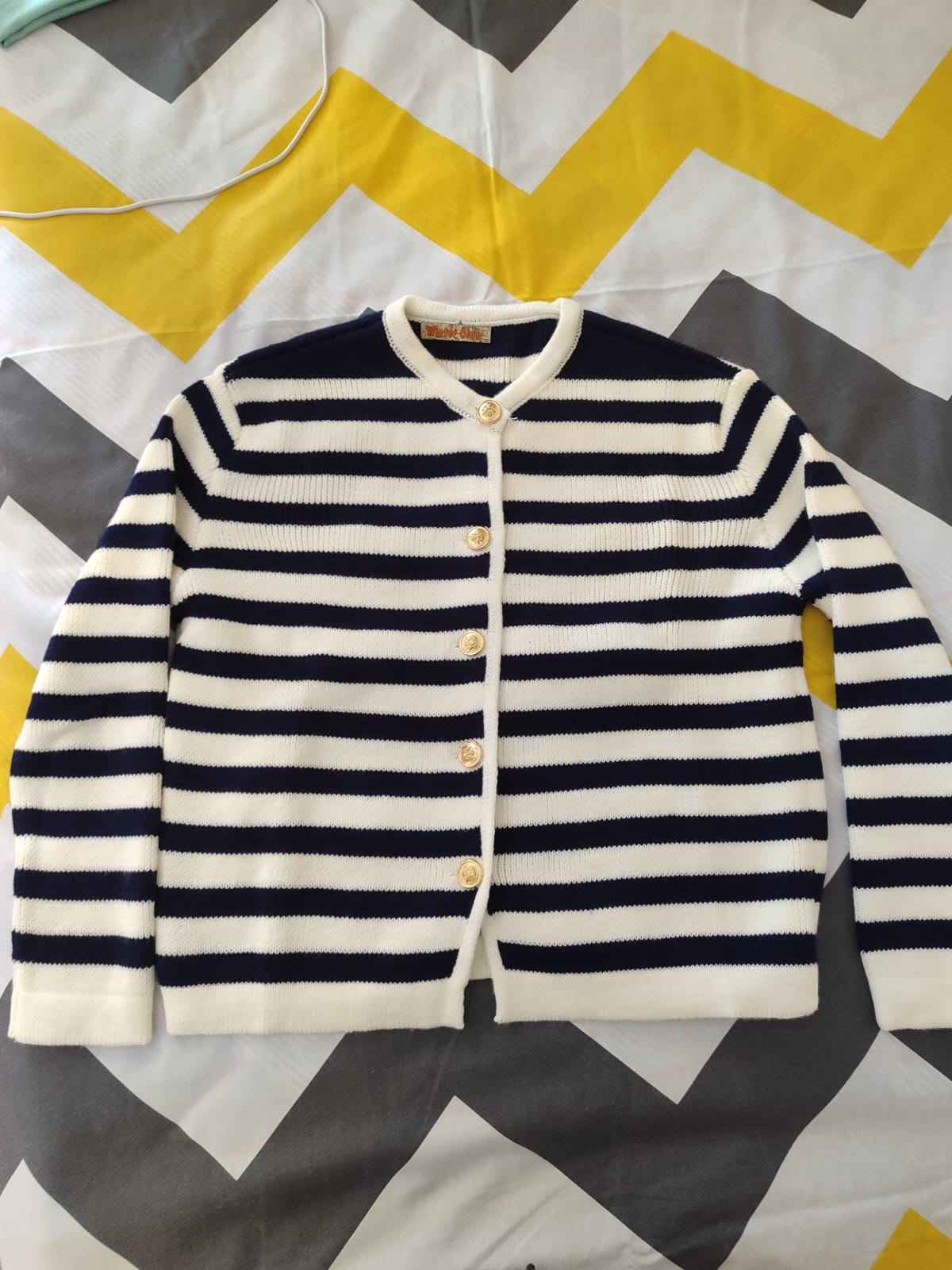 Günlük ortamlarda rahatlıkla tercih edebileceğiniz lacivert çizgili bisiklet yaka fitilli gold düğme detaylı triko hırka, design koleksiyonunun modern ve zamansız parçalarından biri olarak öne çıkar.