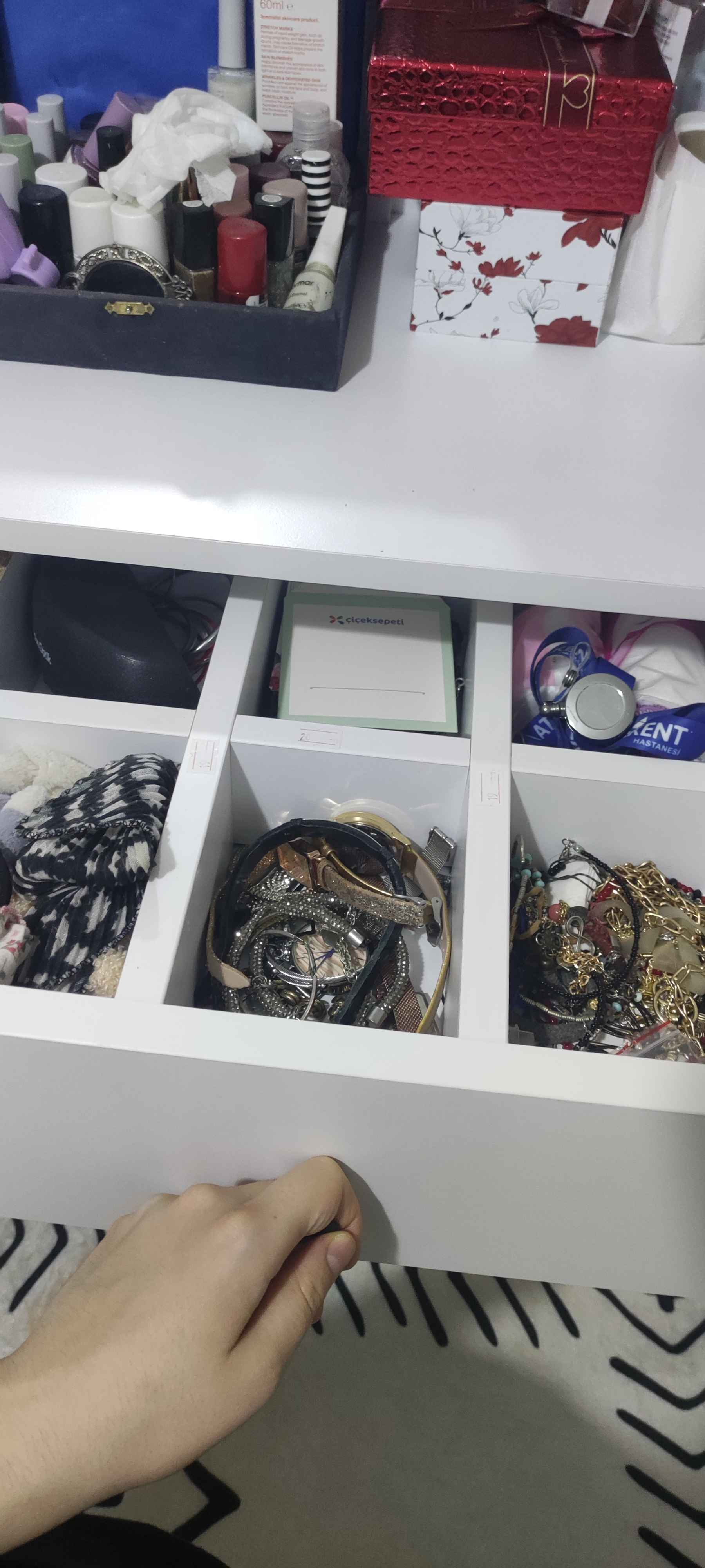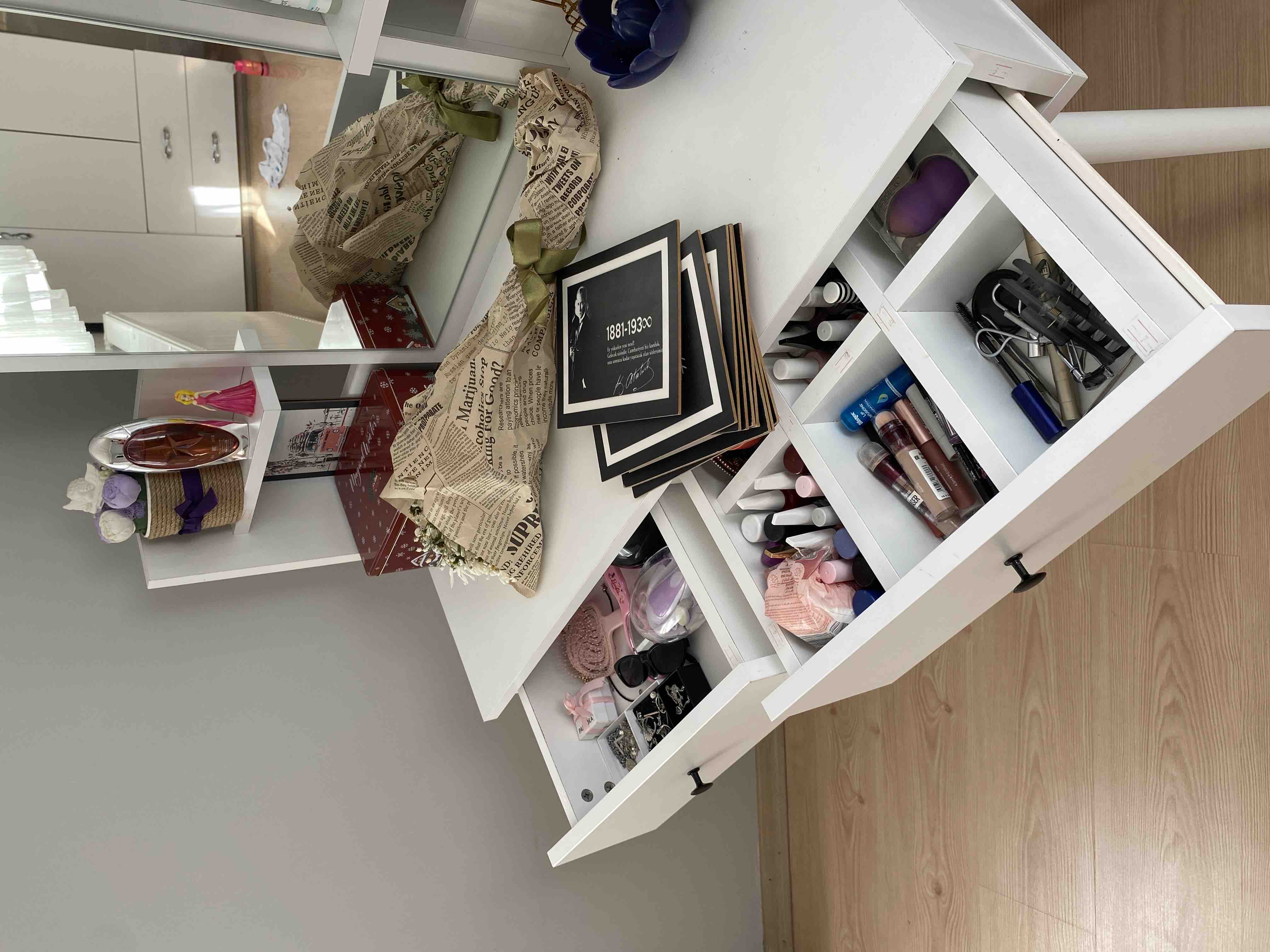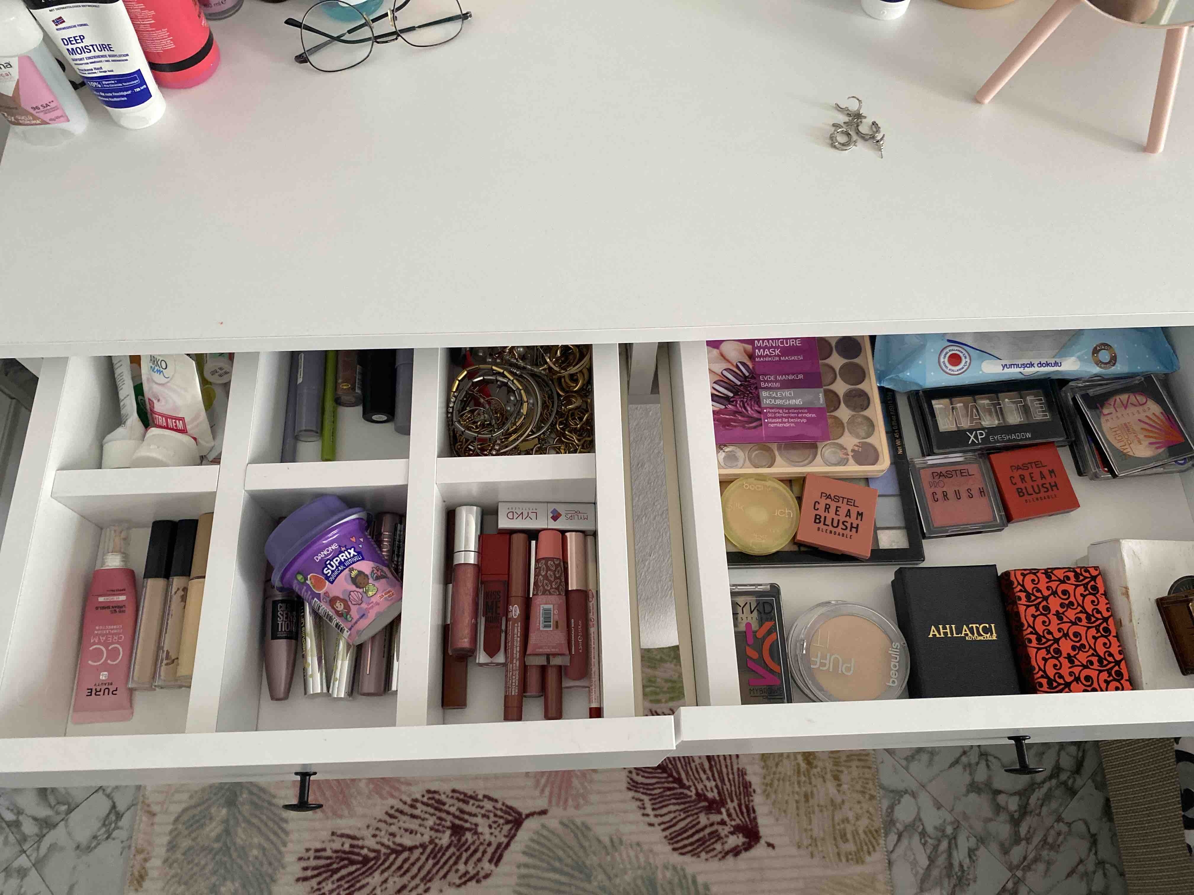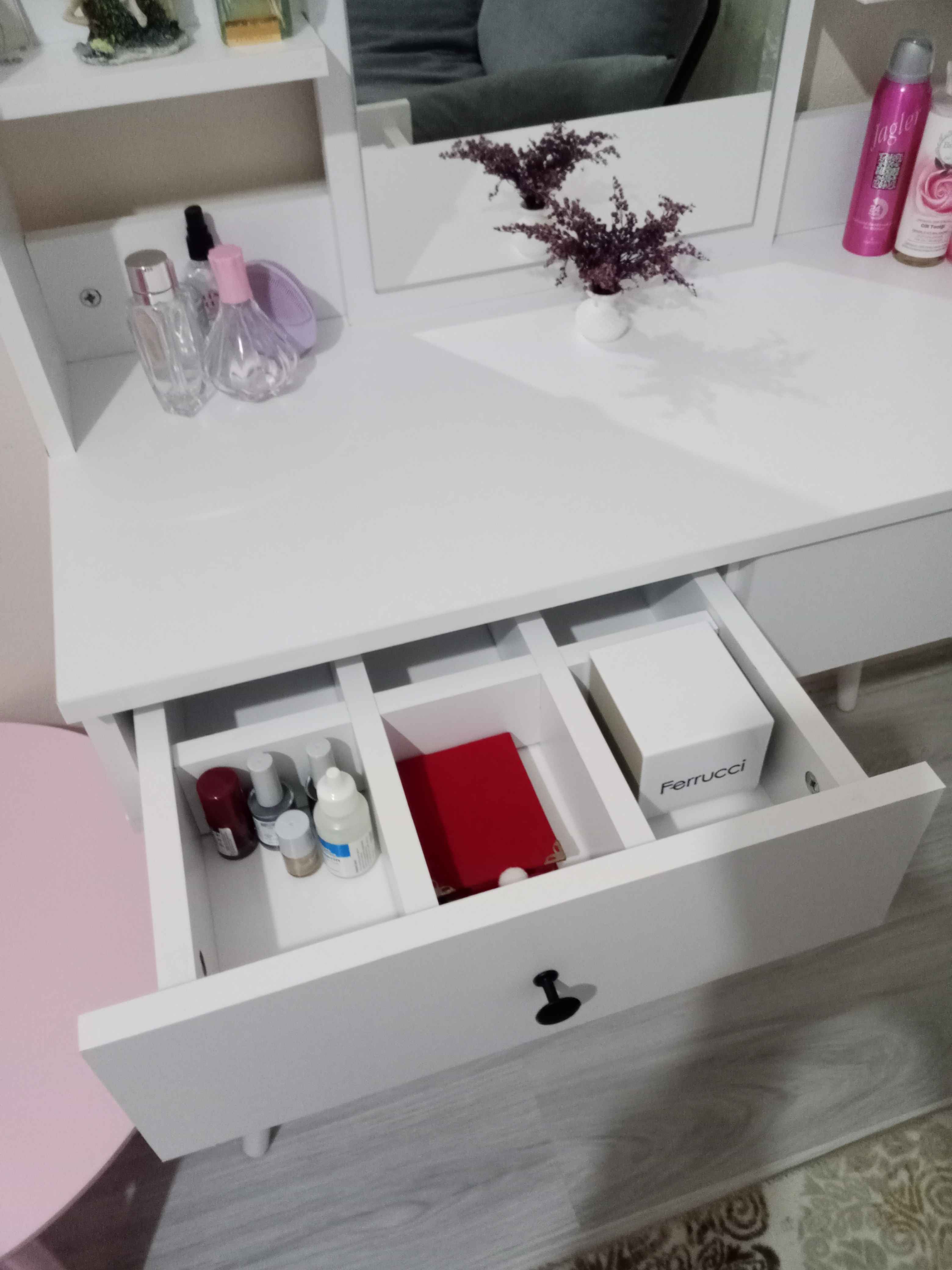* Çekmece içindeki bölmeler takı, makyaj malzemeleri gibi eşyalarınızı kolayca düzenlemenizi sağlar.